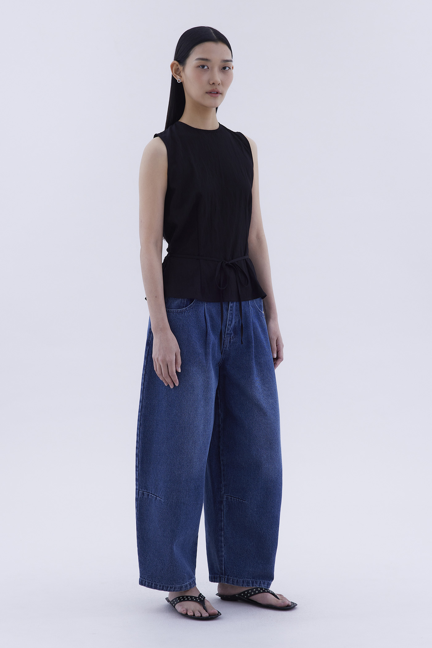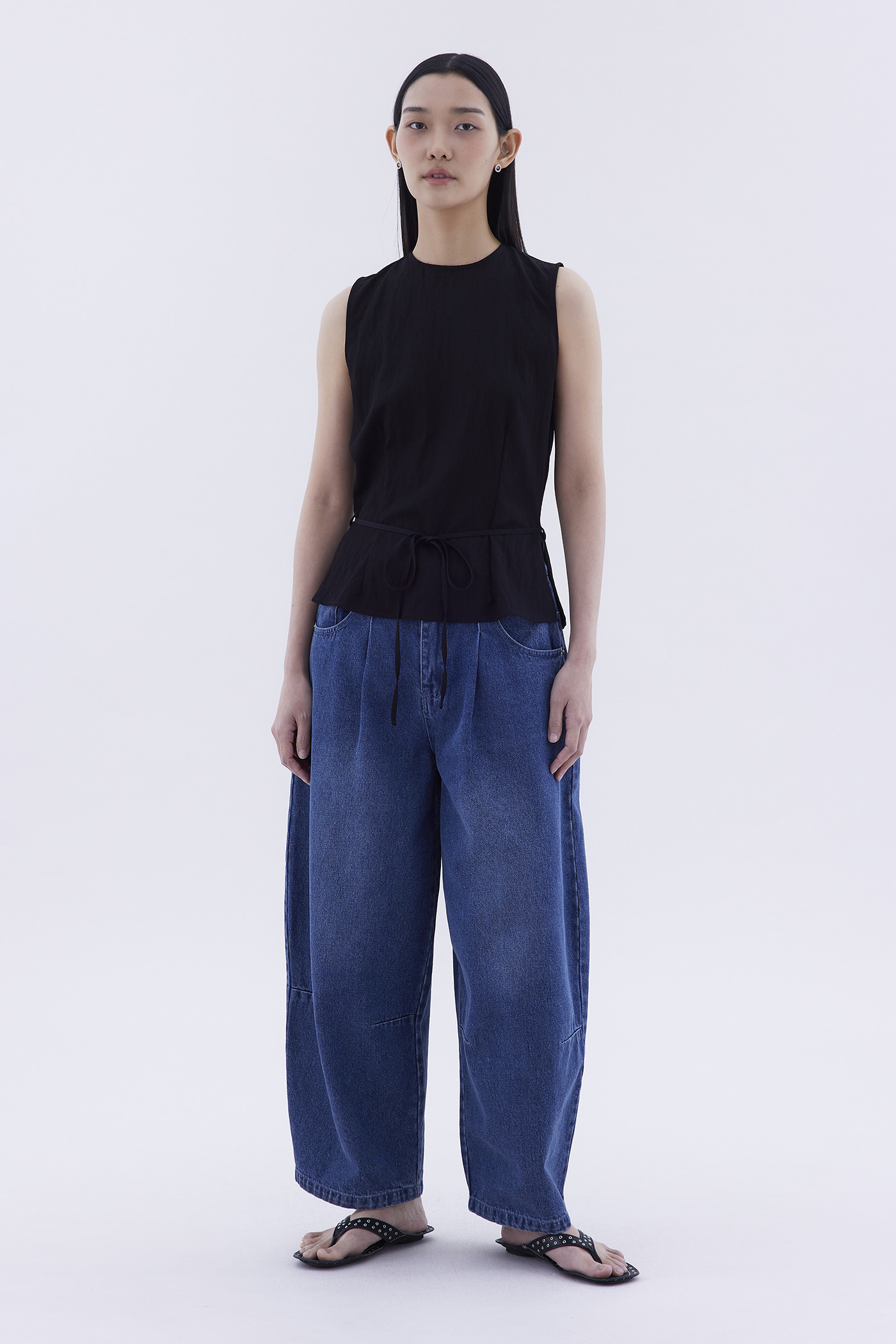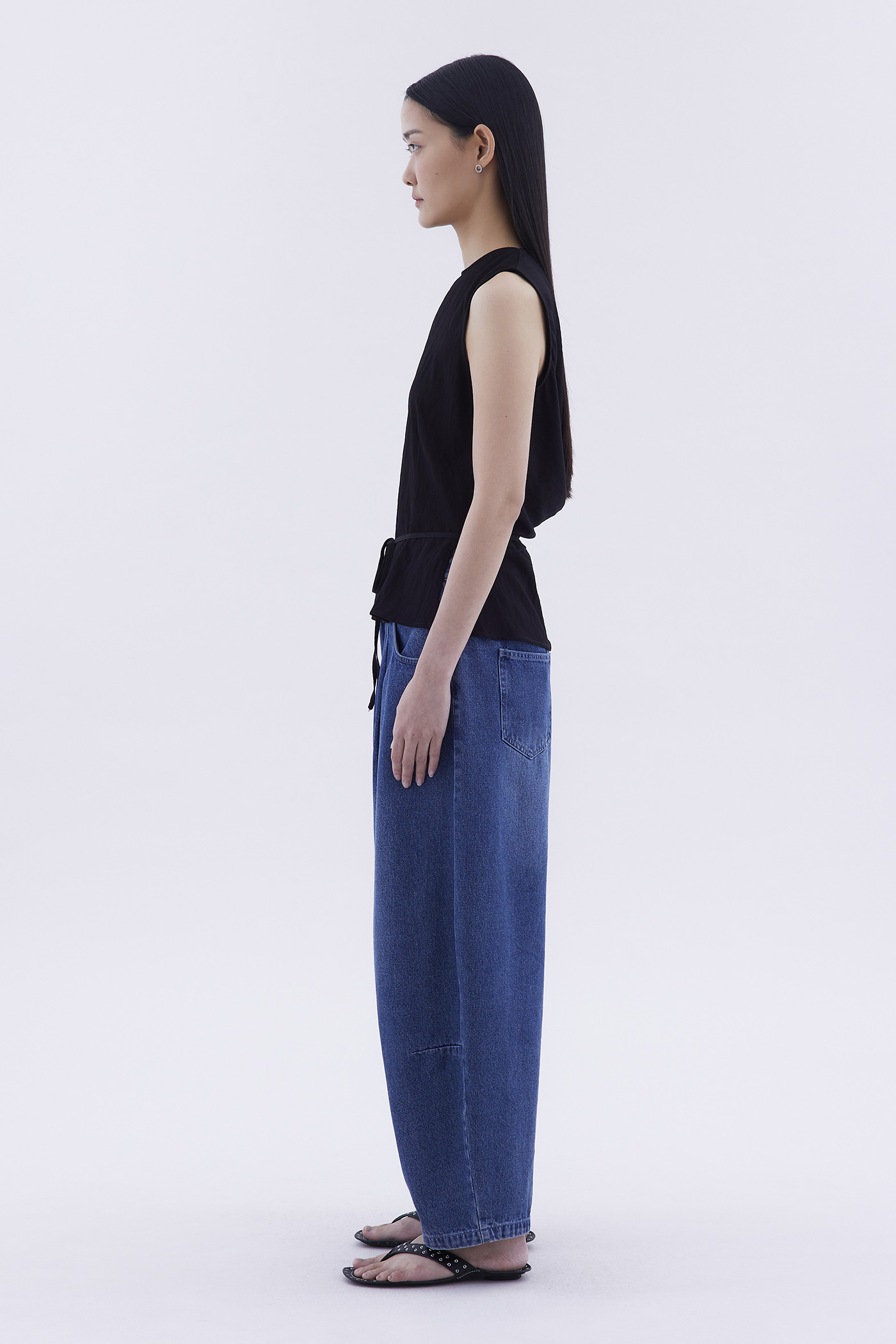 One top, two sides. Made from smooth and airy fabric, this sleeveless top features a round neckline, waist tie-strap, as well as a drapey back opening with a connecting strap. Worn in a relaxed silhouette.
