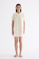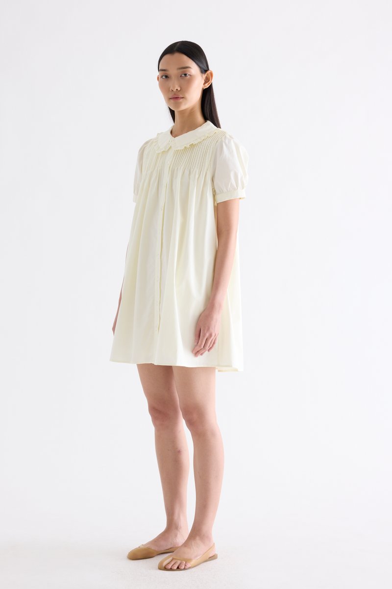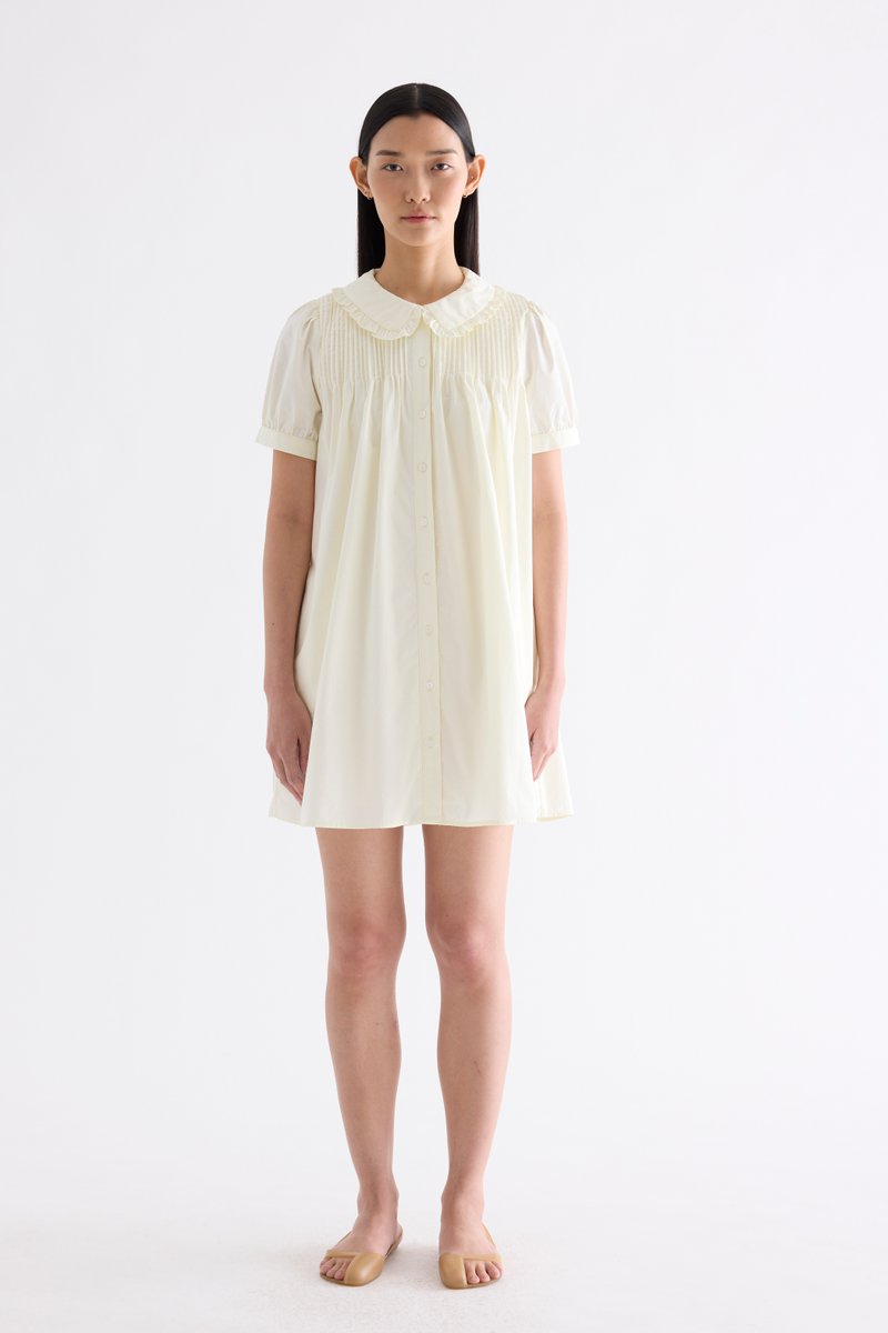 Obsessed. Made from smooth and crisp cotton, this dress features frill-trimmed collars, short puffy sleeves with a buttoned cuff, pin-tuck pleats and a button-down front. Fits relaxed and above the knee.