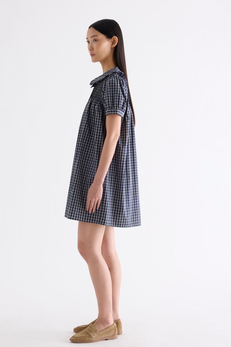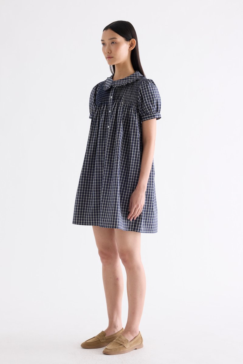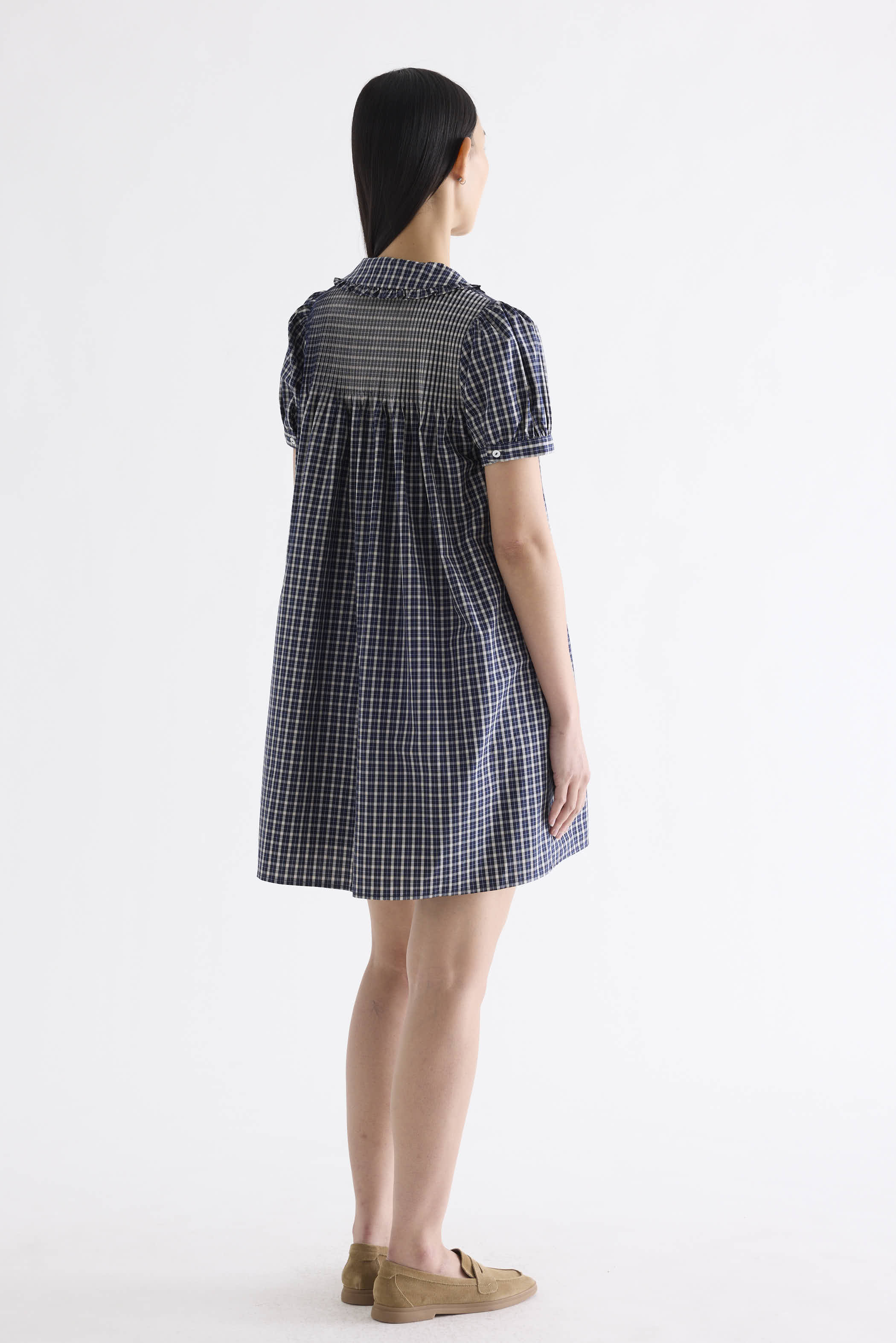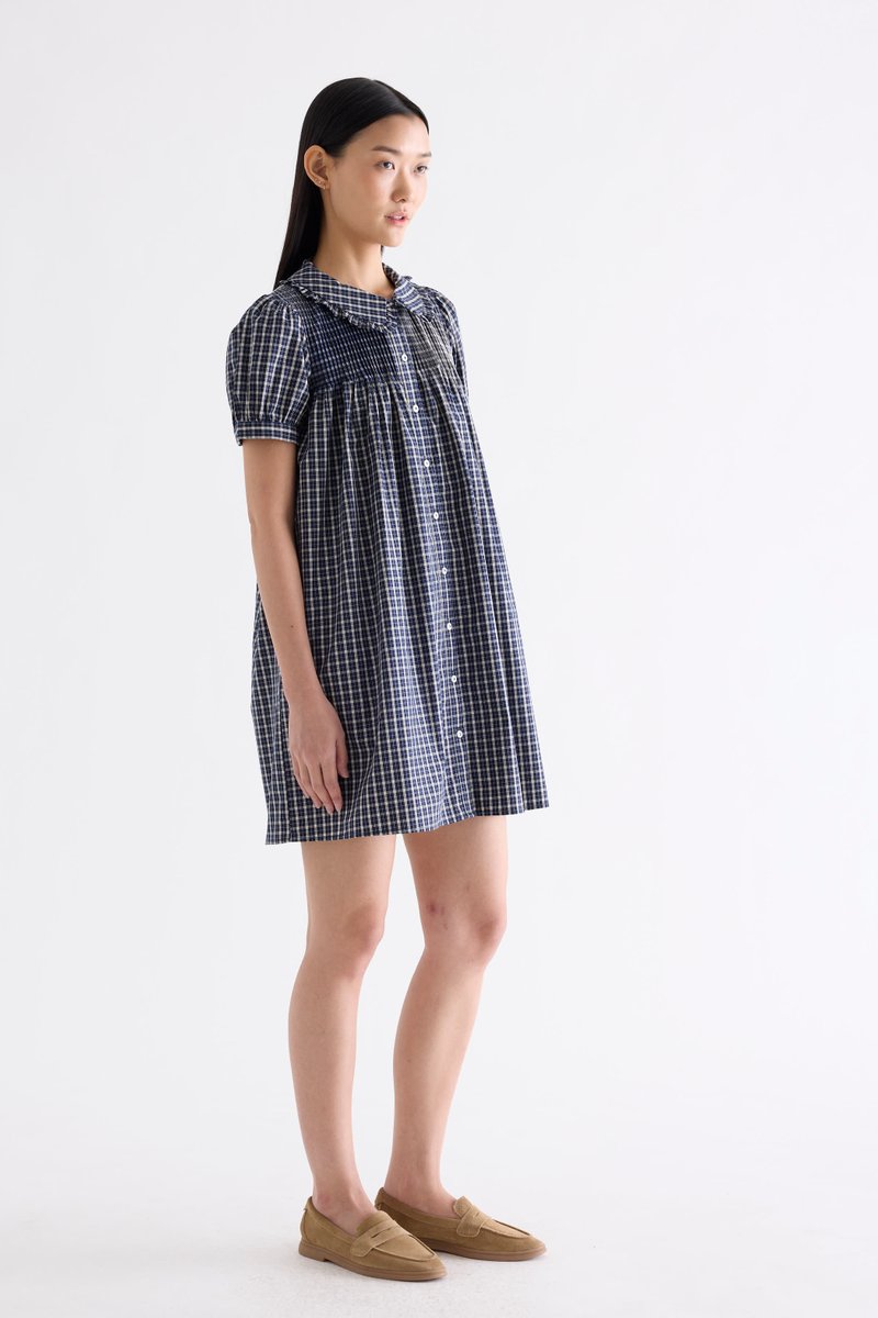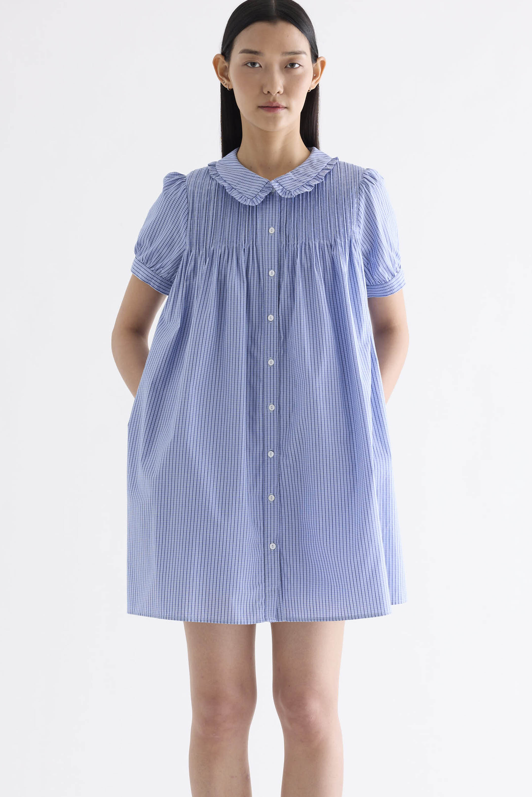 Obsessed. Made from smooth and crisp cotton, this dress features frill-trimmed collars, short puffy sleeves with a buttoned cuff, pin-tuck pleats and a button-down front. Fits relaxed and above the knee.