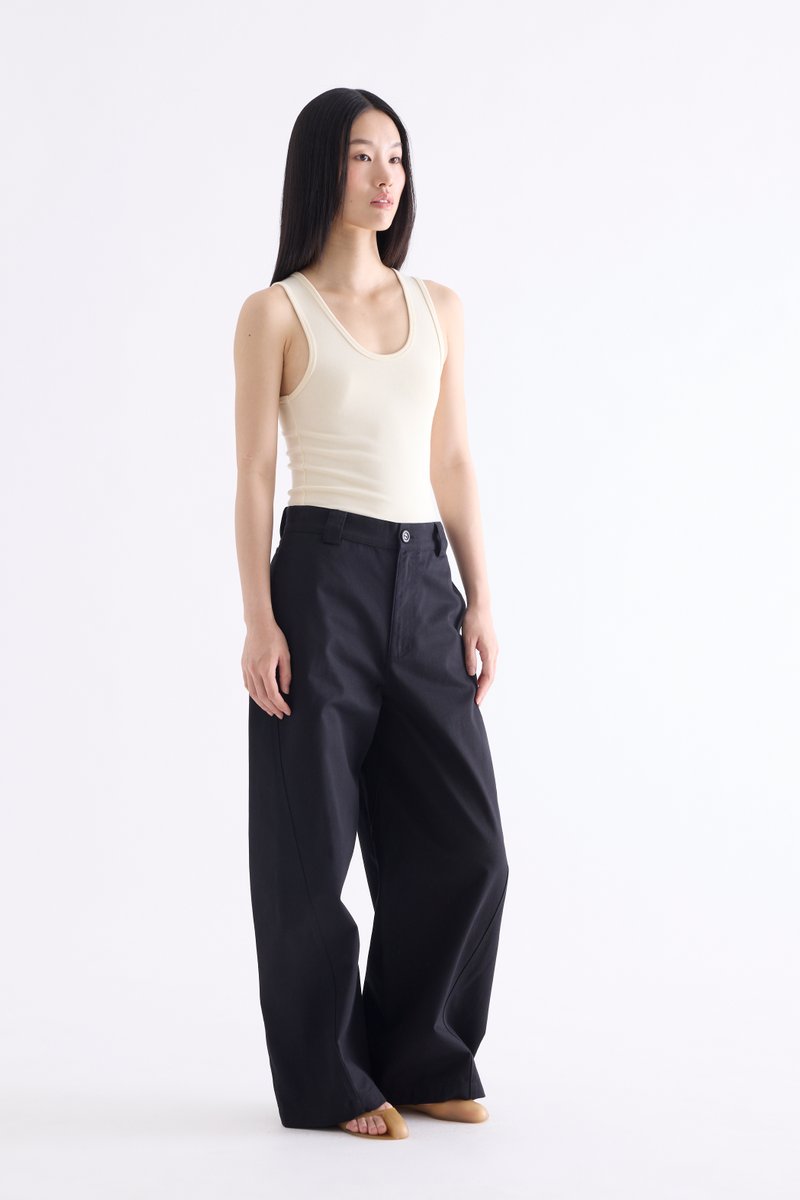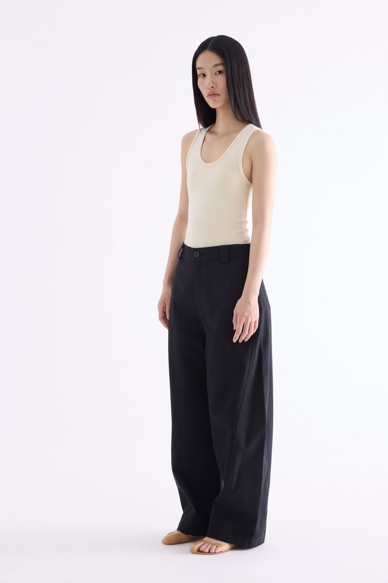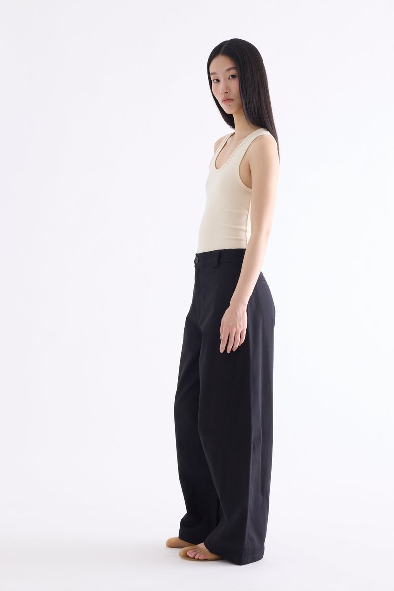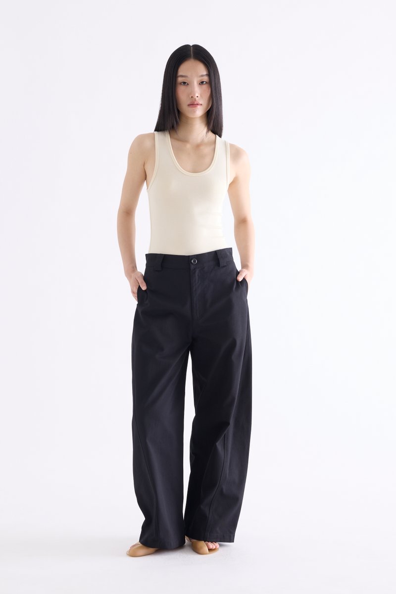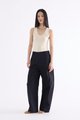 From the Postscript collection. These mid-waisted pants feature relaxed barrel legs with angled seams, wide belt loops, and a front button and zip closure. Worn in a relaxed fit.