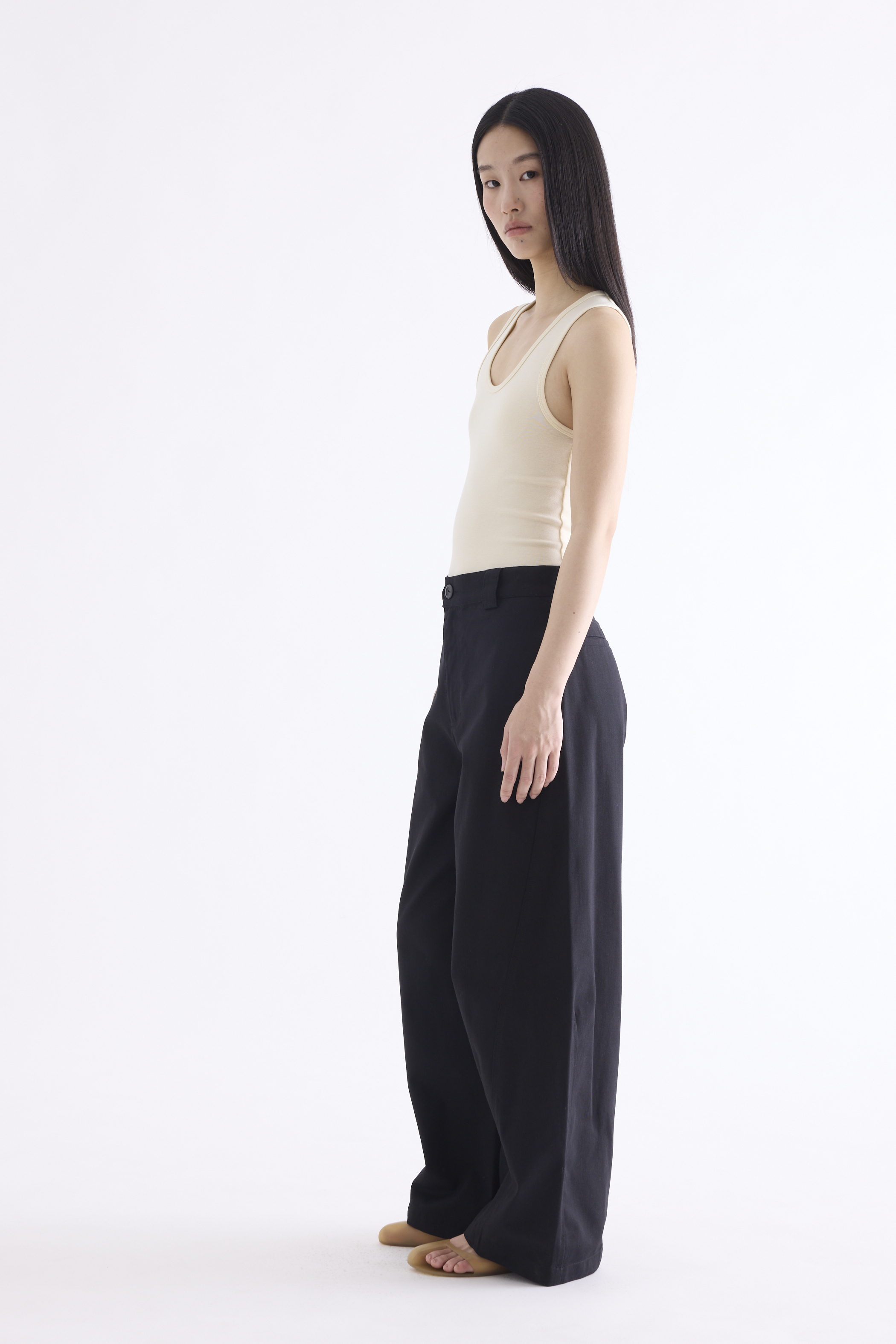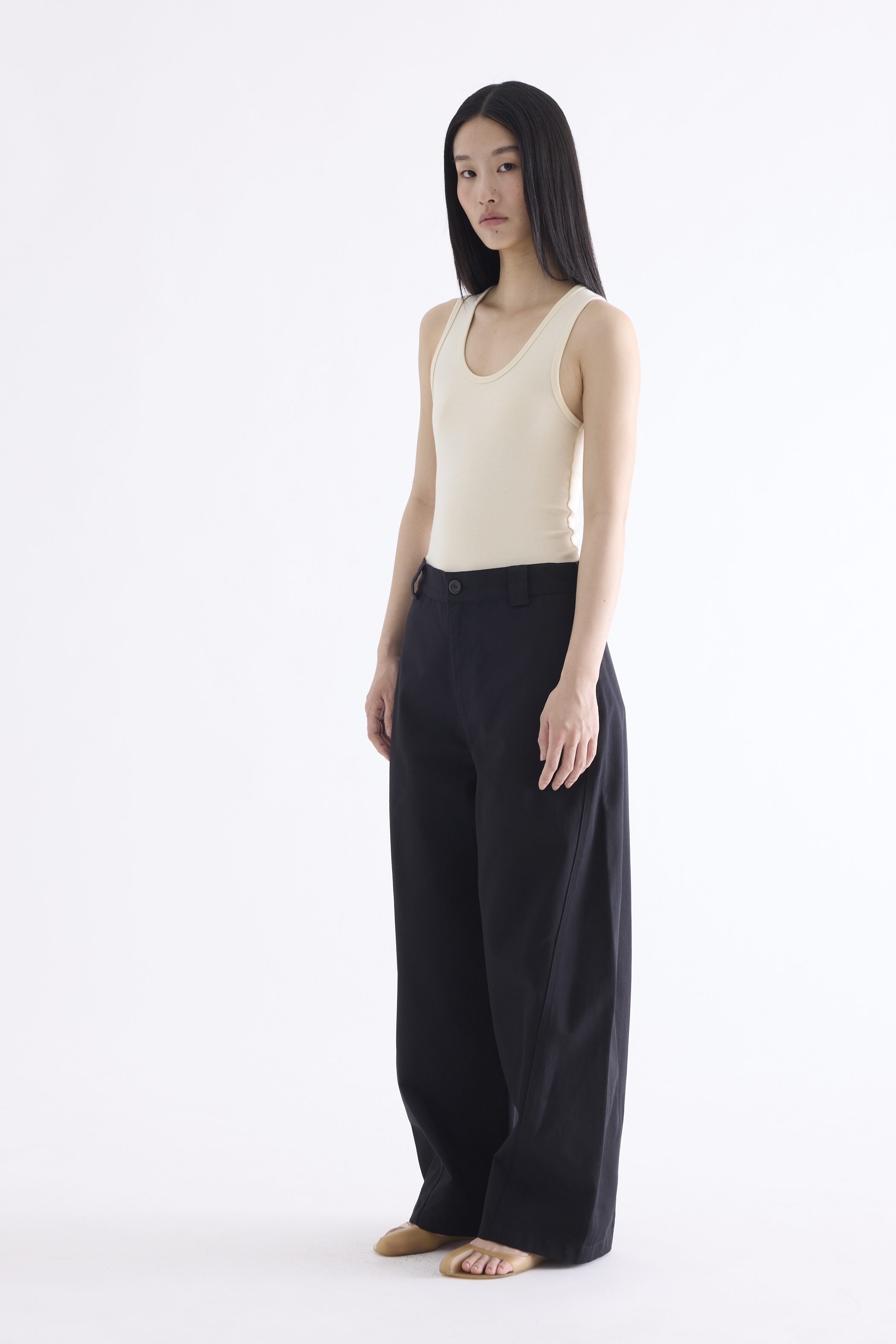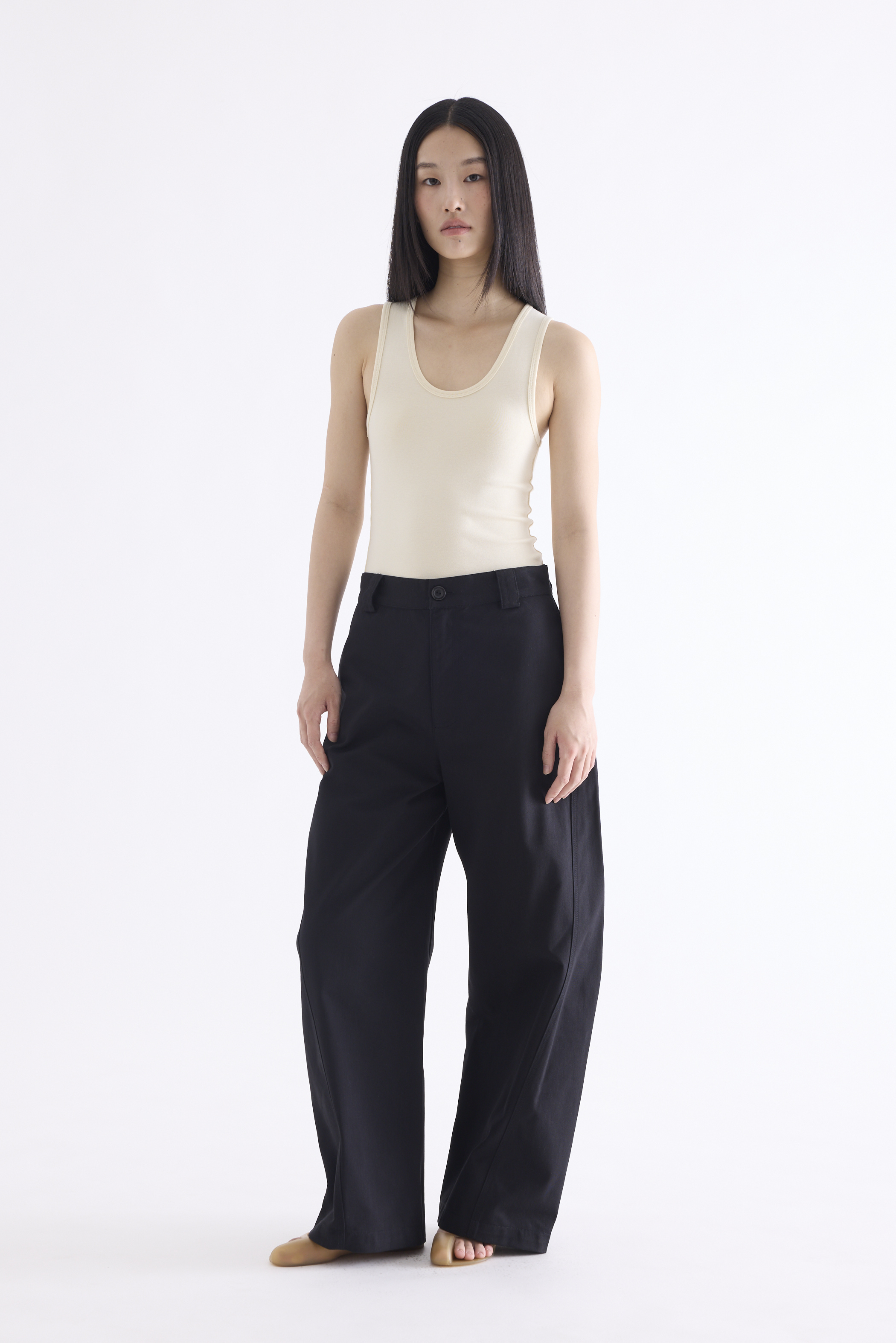 From the Postscript collection. These mid-waisted pants feature relaxed barrel legs with angled seams, wide belt loops, and a front button and zip closure. Worn in a relaxed fit.