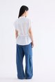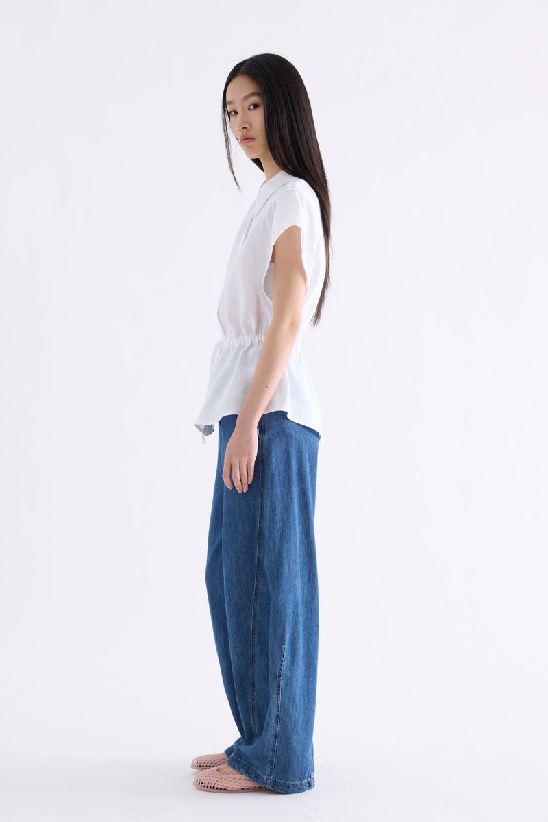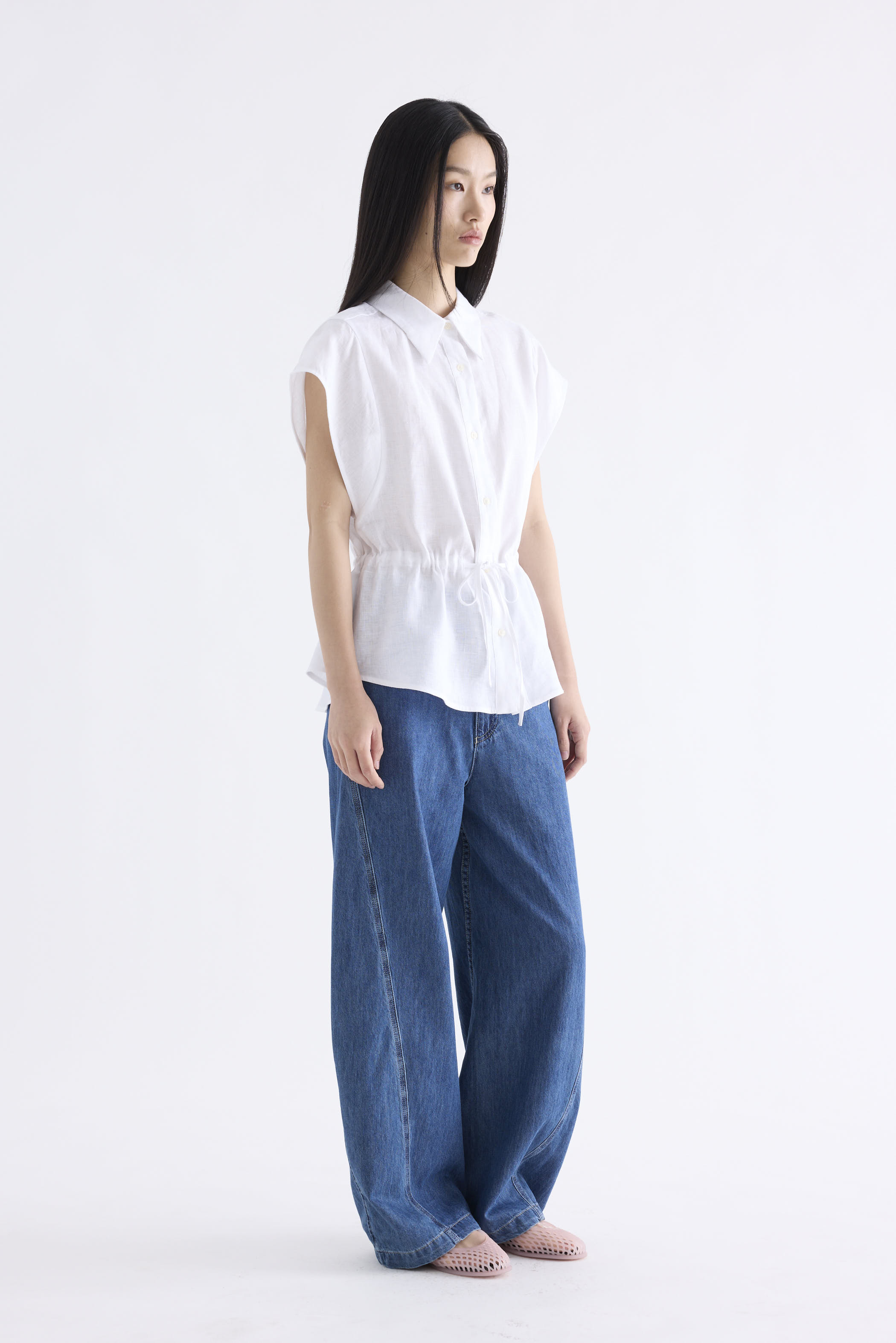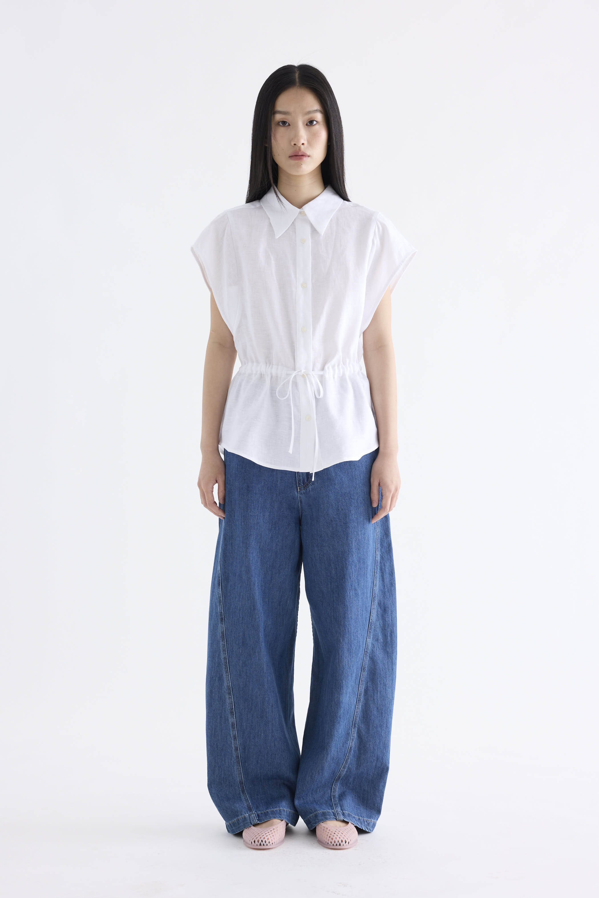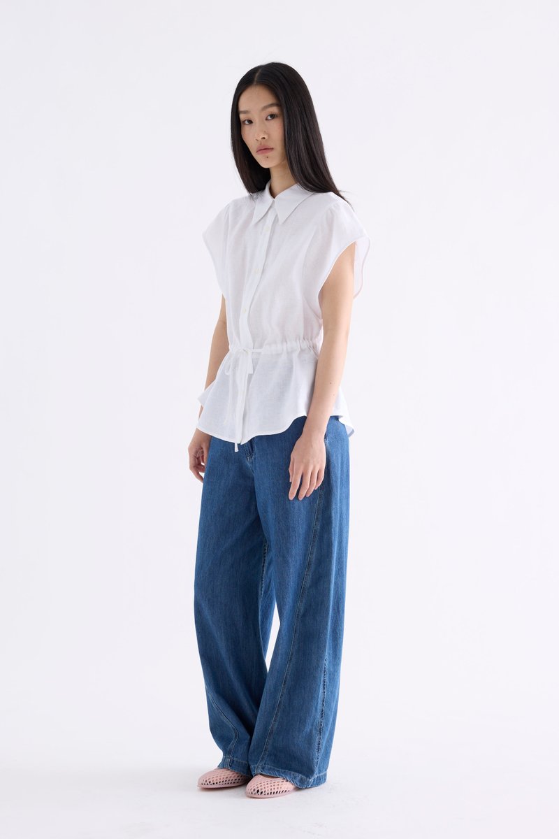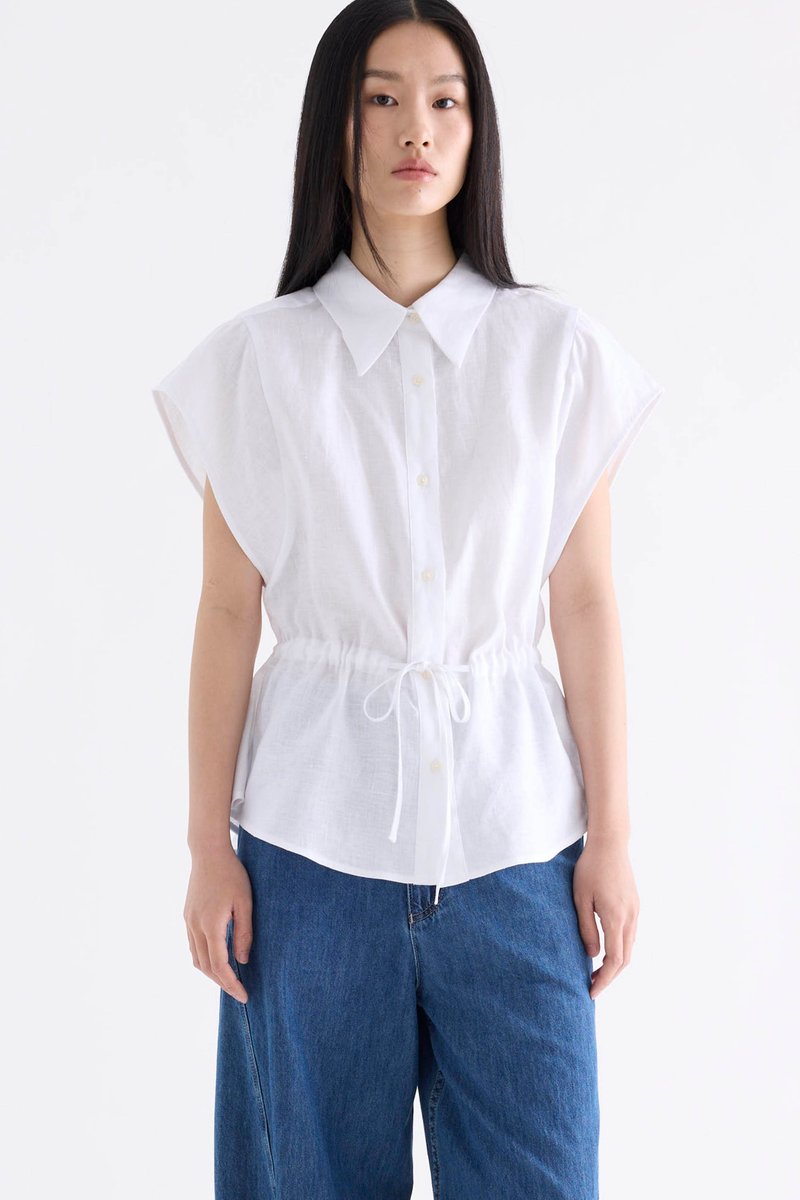 From the Postscript collection. This top is made from 100% linen with a light and softly structured finish. Features a collared neckline, cap sleeves and button-down front. Its fit is adjustable via a drawstring waist-tie.