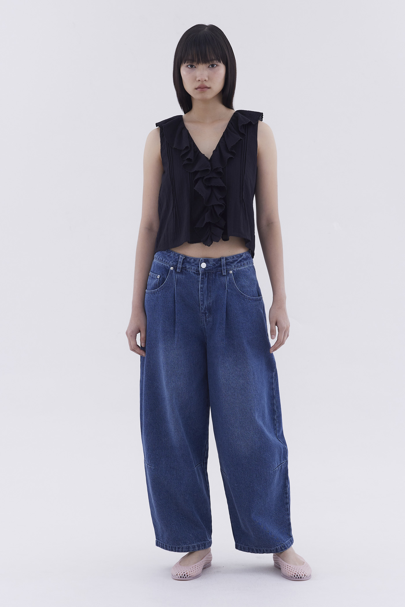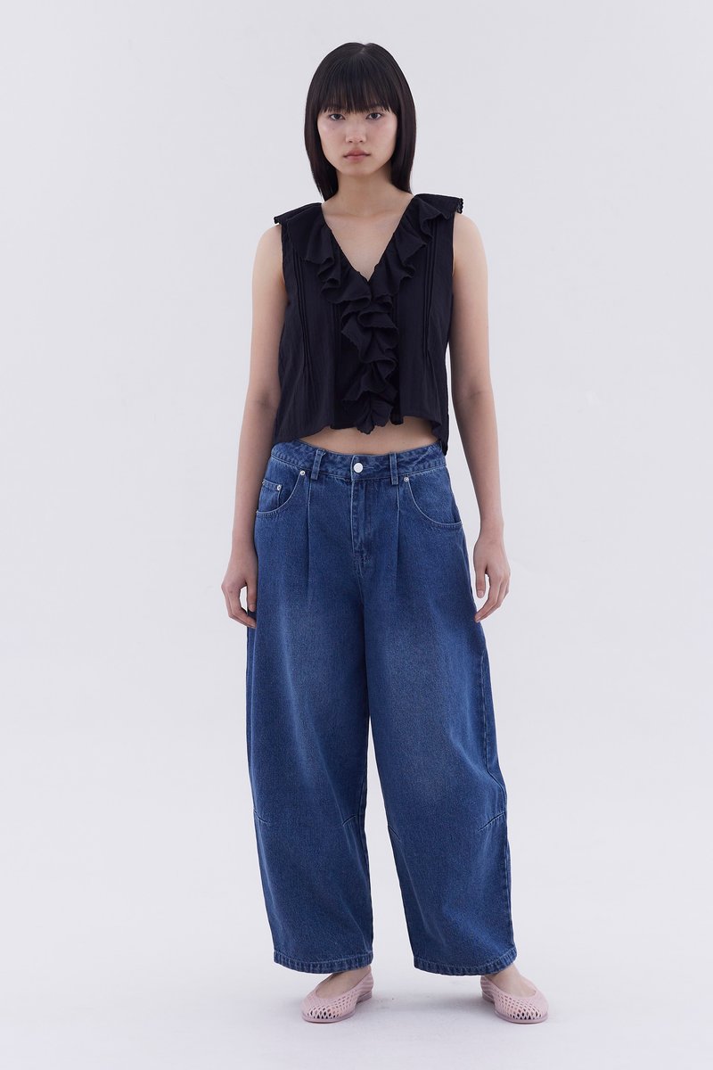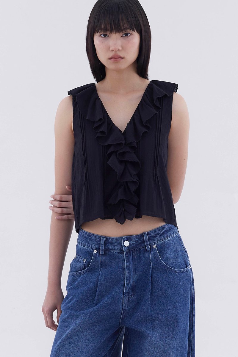 Textures take the wheel. Made from airy and softly structured cotton, this sleeveless top features a ruffle-trimmed V-neckline and pin-tuck pleats. Worn in a slim fit.