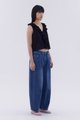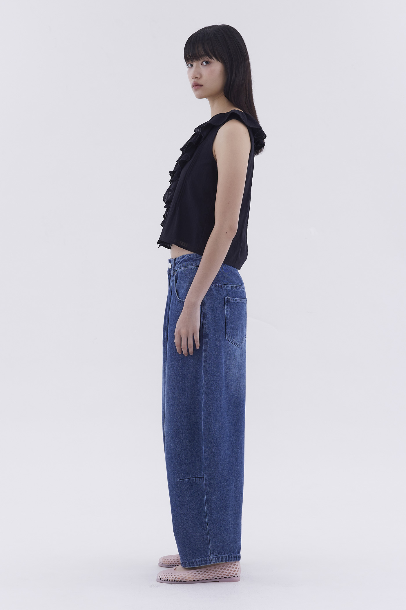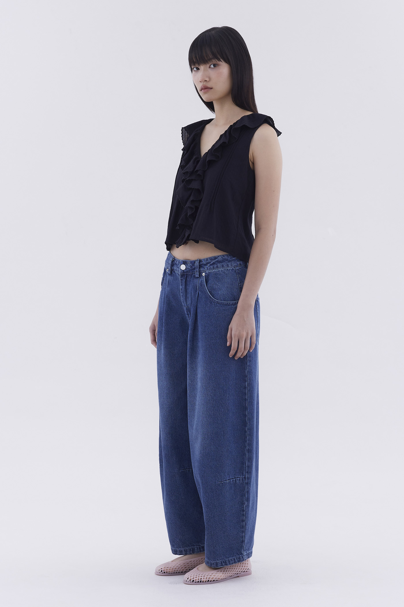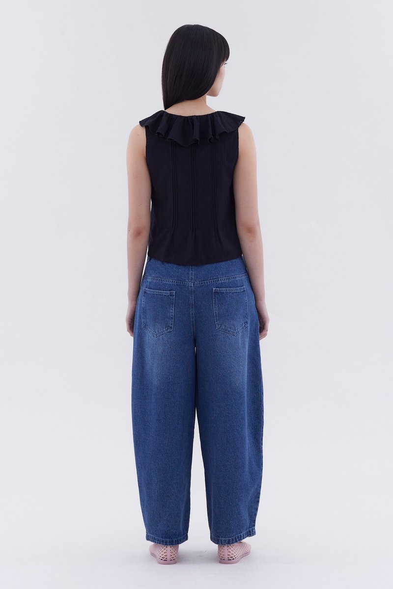 Textures take the wheel. Made from airy and softly structured cotton, this sleeveless top features a ruffle-trimmed V-neckline and pin-tuck pleats. Worn in a slim fit.