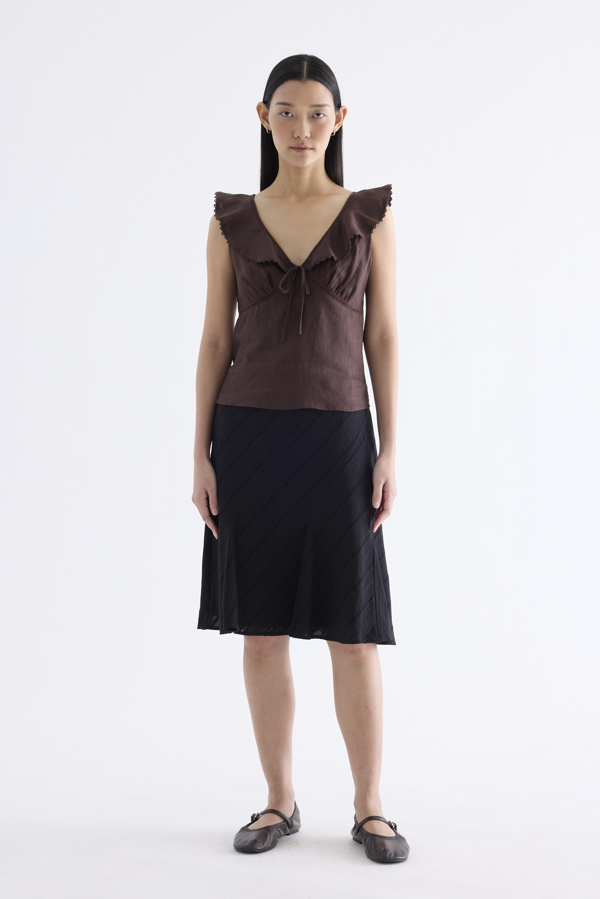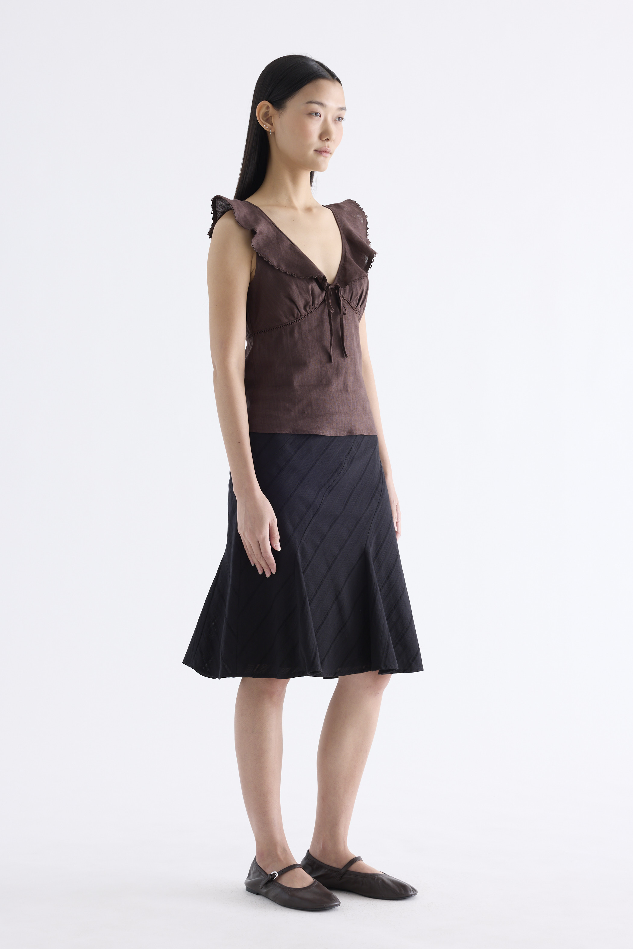 Warm-weather approved. Cut from airy and gently tailored 100% linen, this sleeveless top features a V-neckline with ruffled and oversized lace-trimmed collars, a ruched bust with ladder lace detailing, as well as a front tie-strap. Worn in a slim fit with a side zip closure.