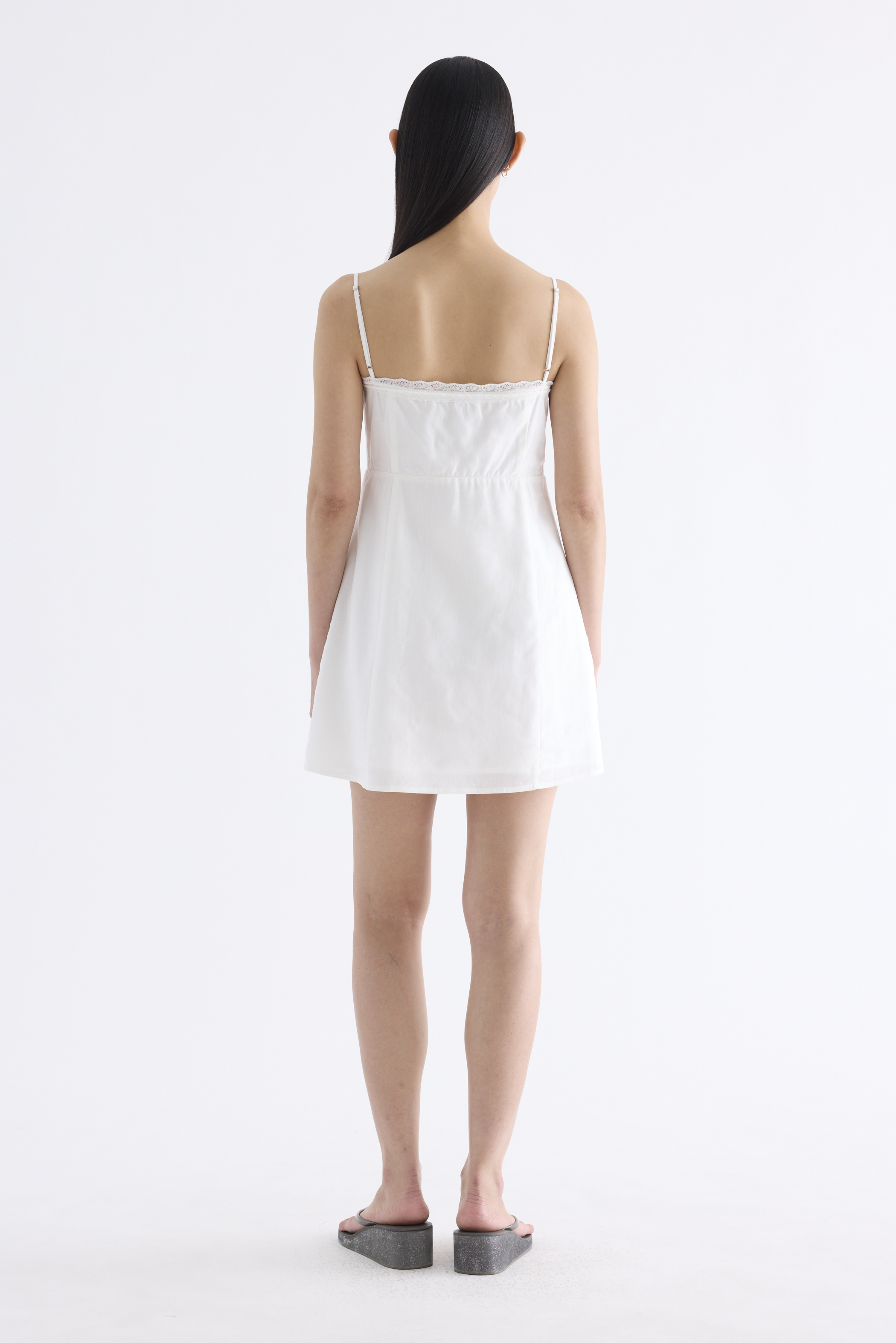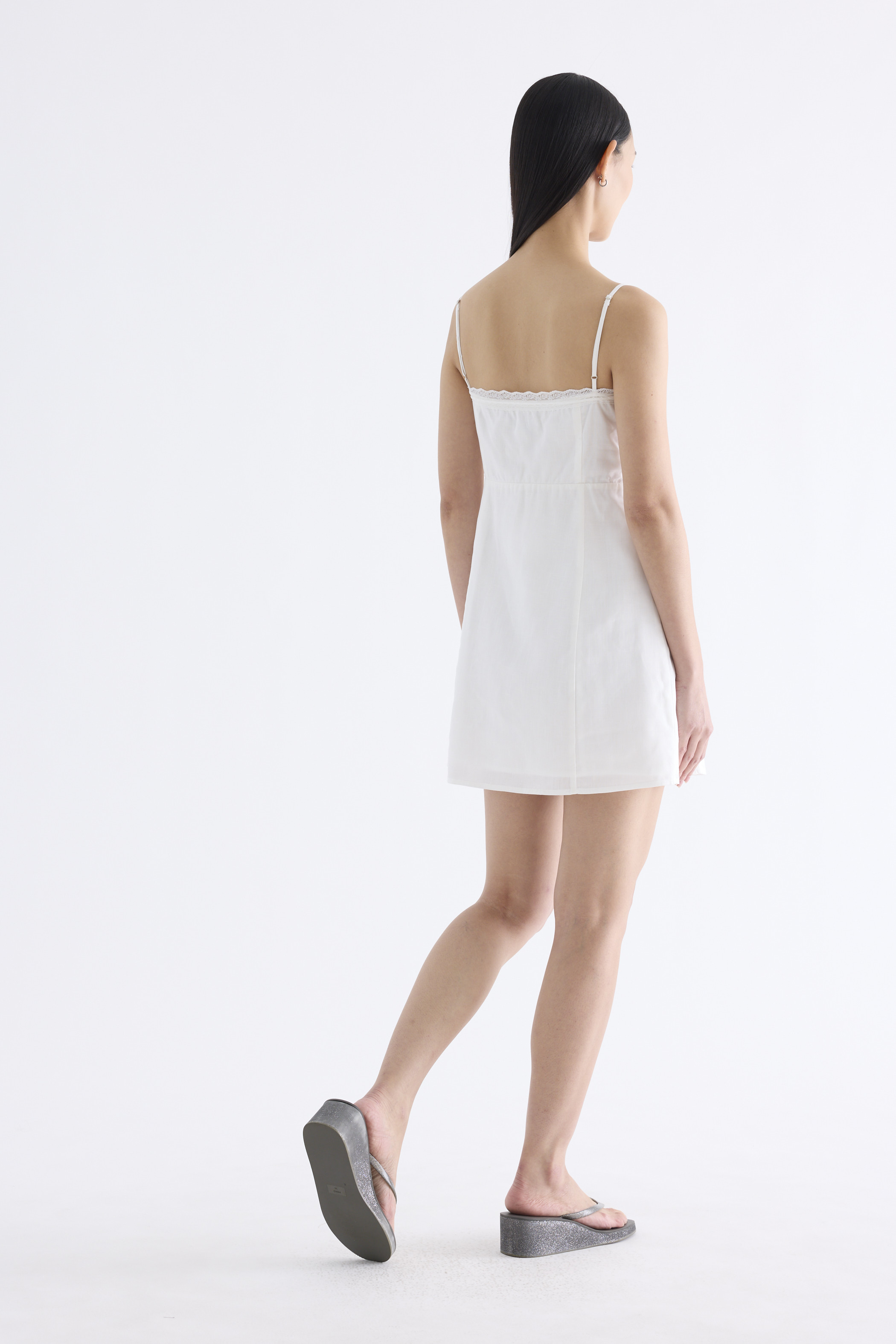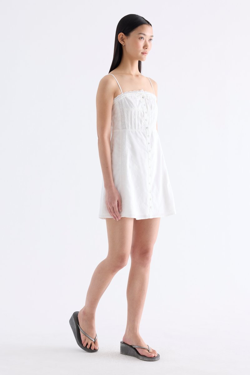 Always cool. Made from light and non-stretch Tencel, this sleeveless button-down dress features a drawstring lace-trimmed neckline with a front tie-strap, slim adjustable shoulder straps, a pleated bodice and lace panels. Fits slim and above the knee.