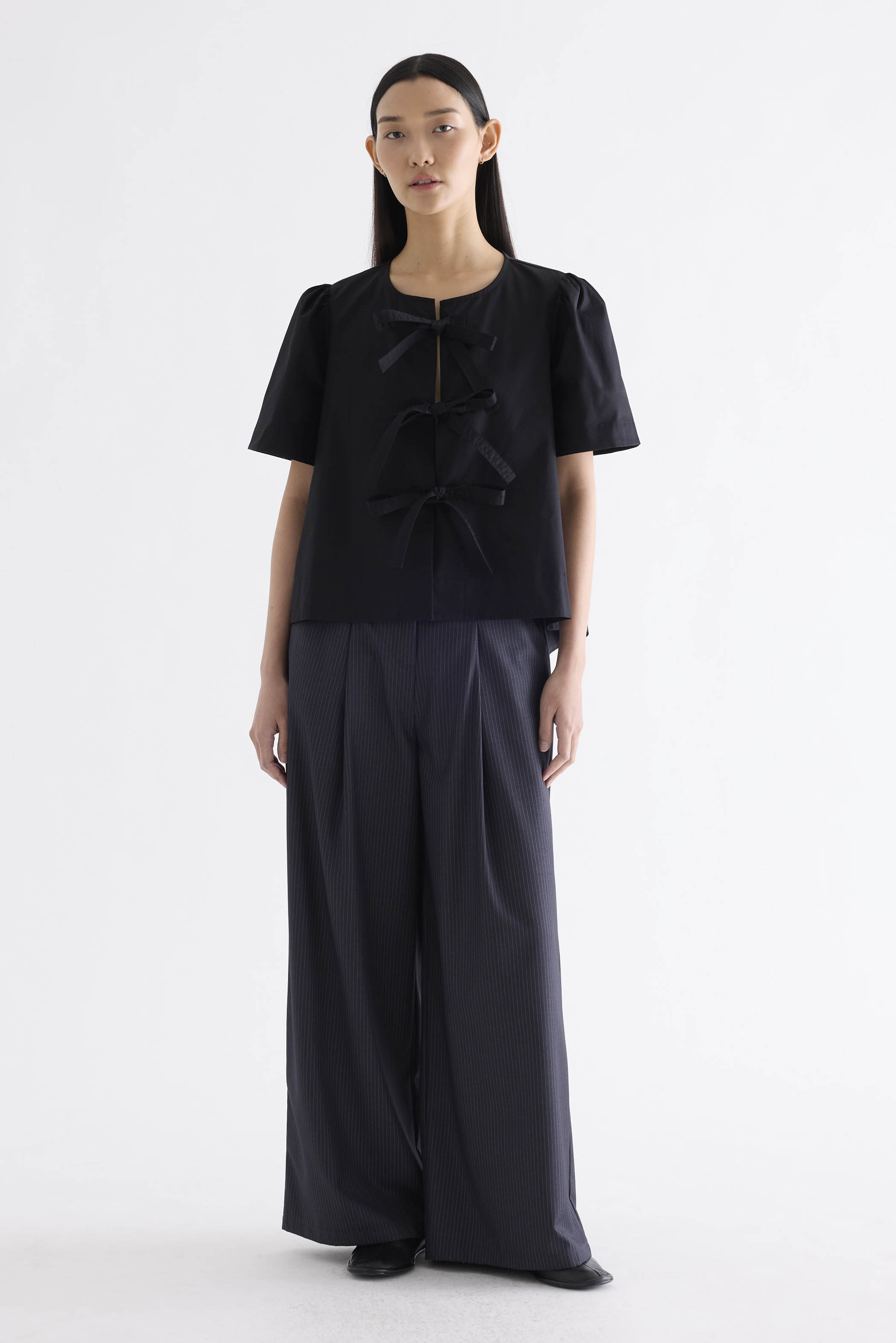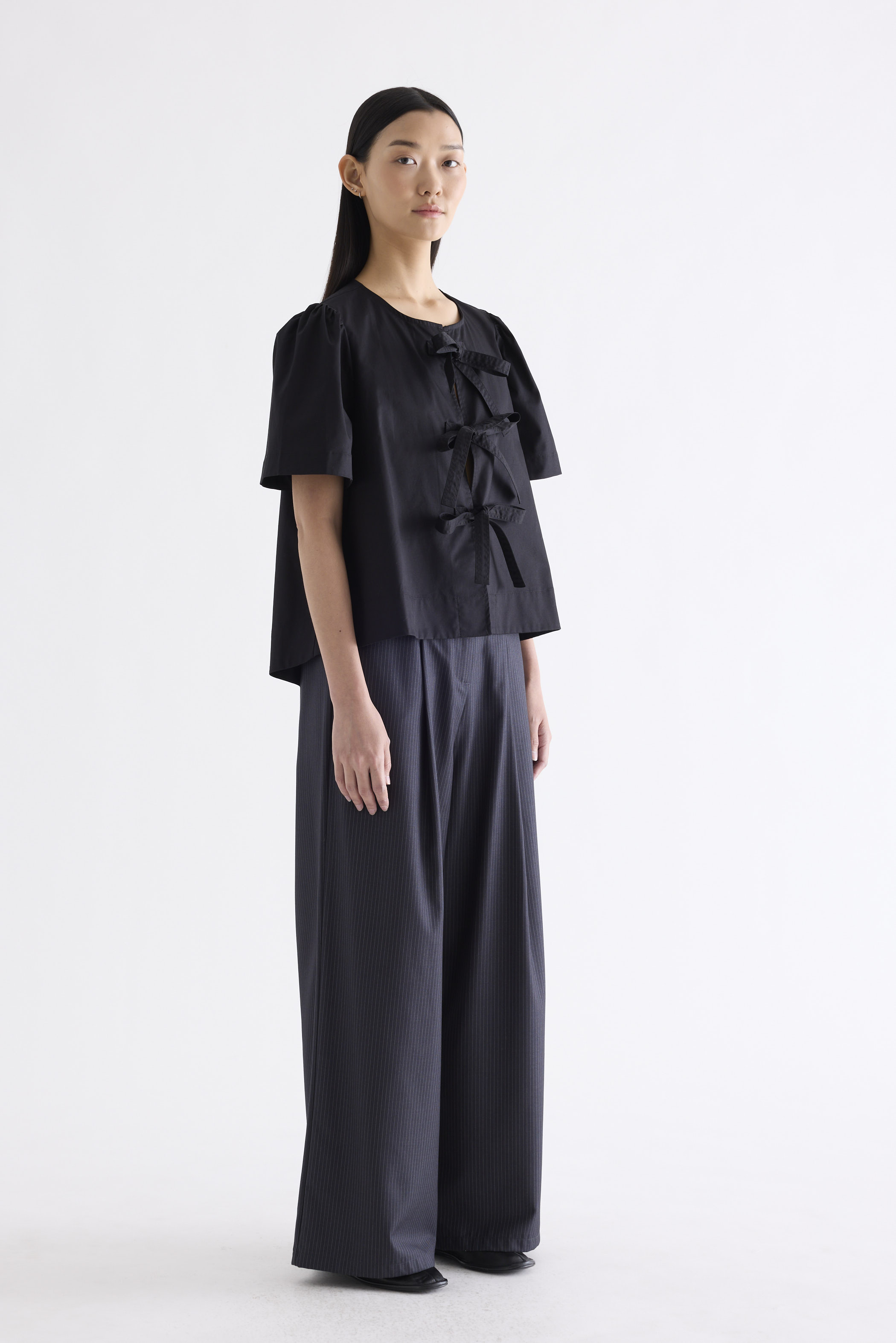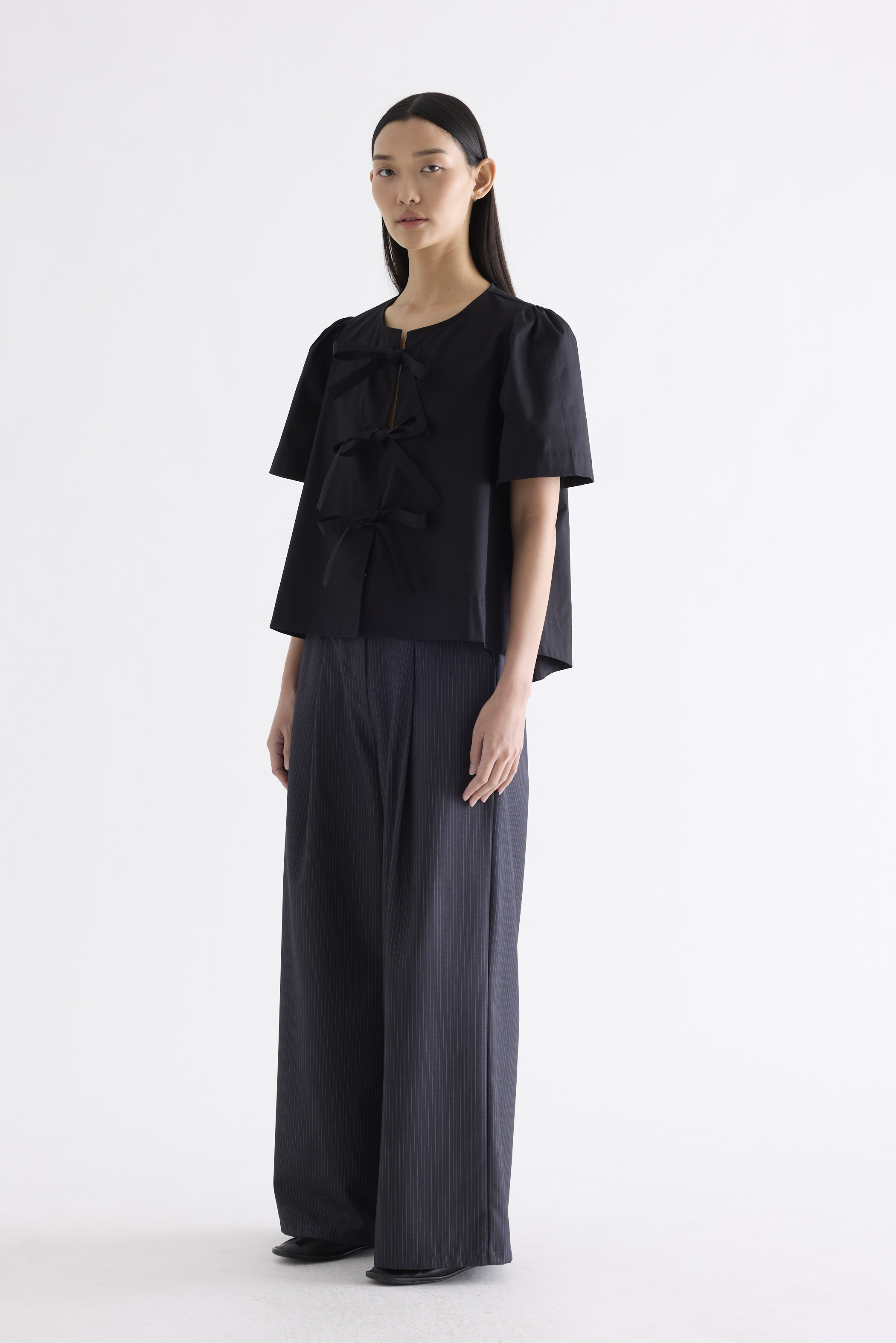 Bold bows. Cut from crisp and softly structured cotton, this blouse features a round neckline, short, slightly puffy sleeves and an open front with tie-strap closures. Worn in a relaxed fit.