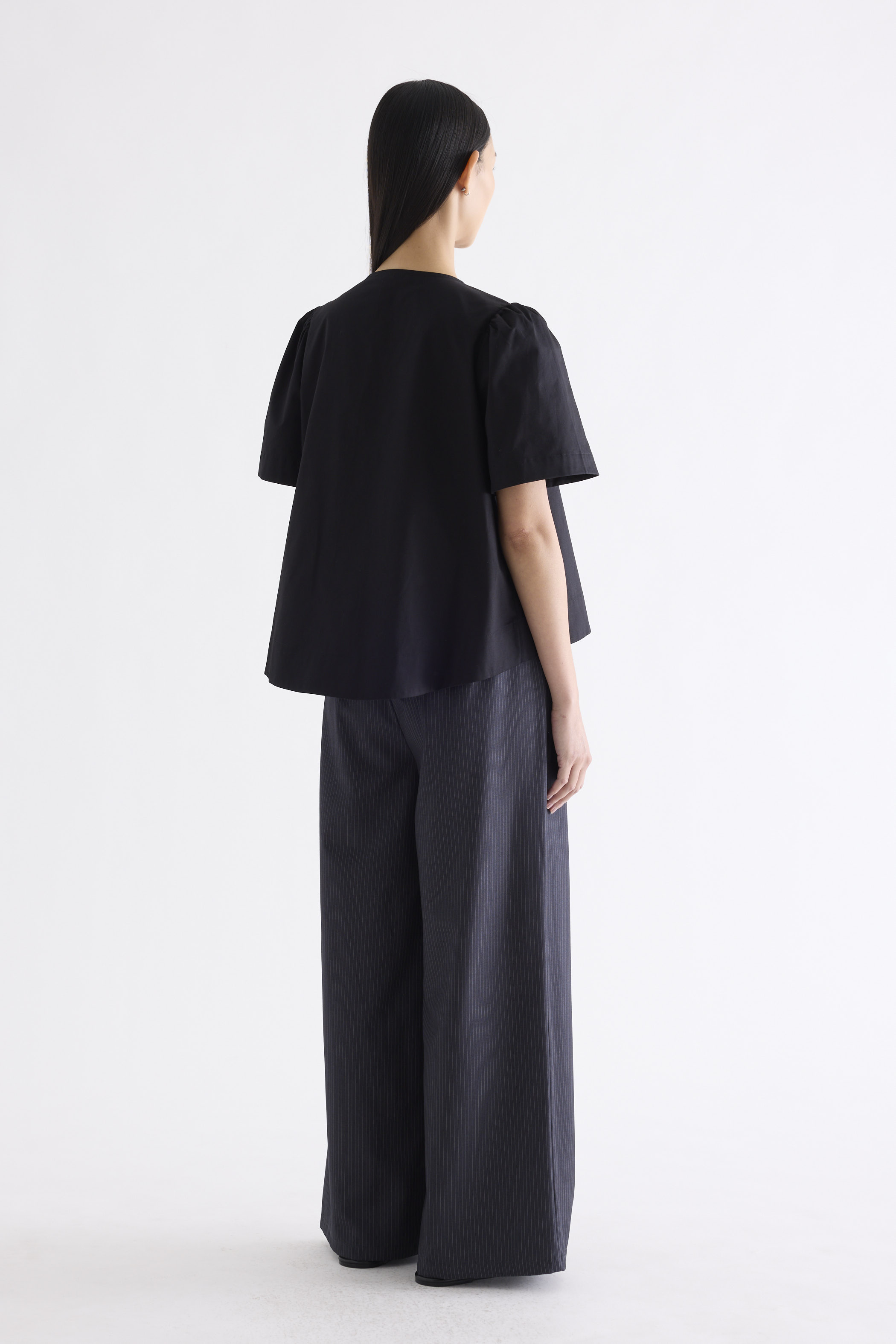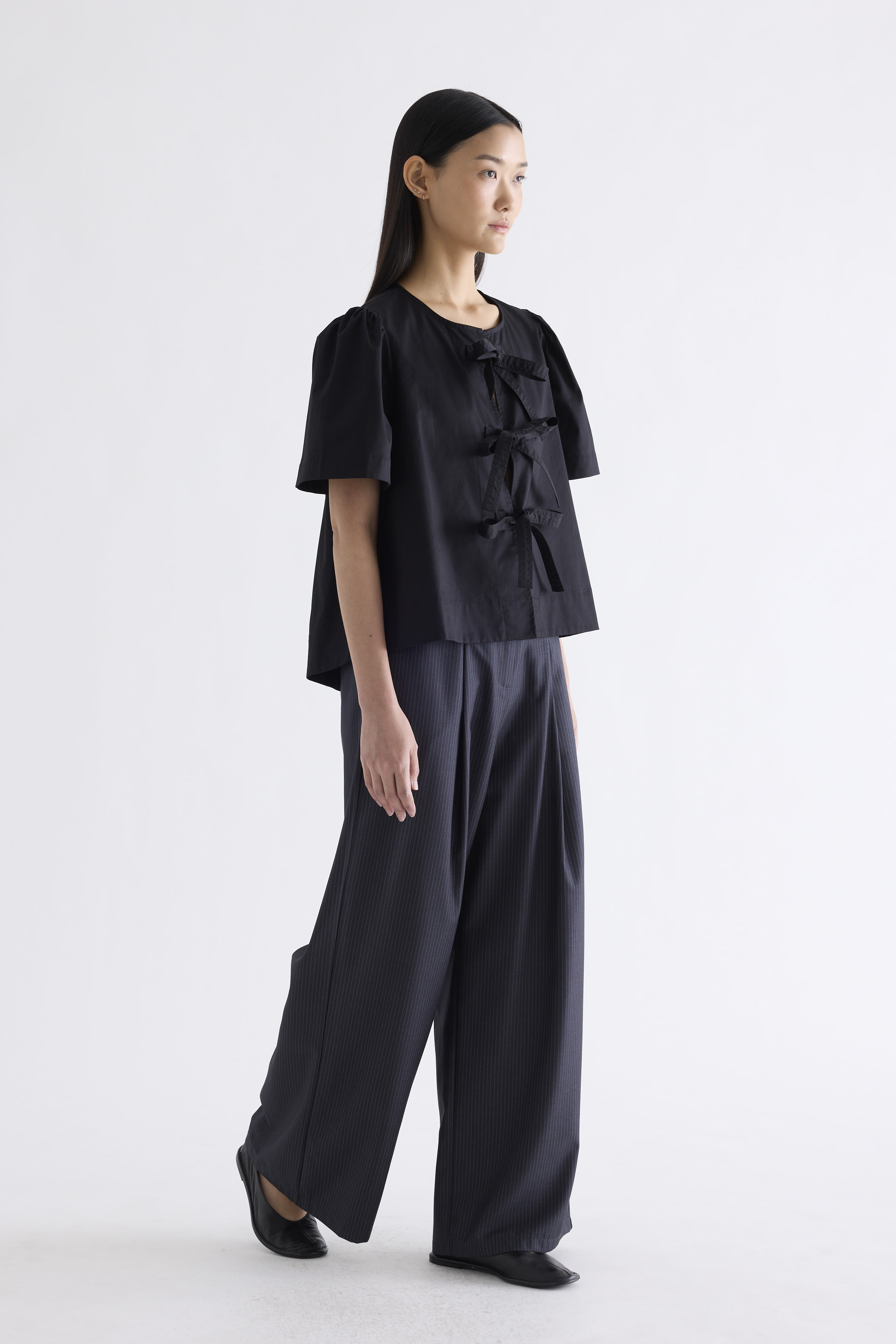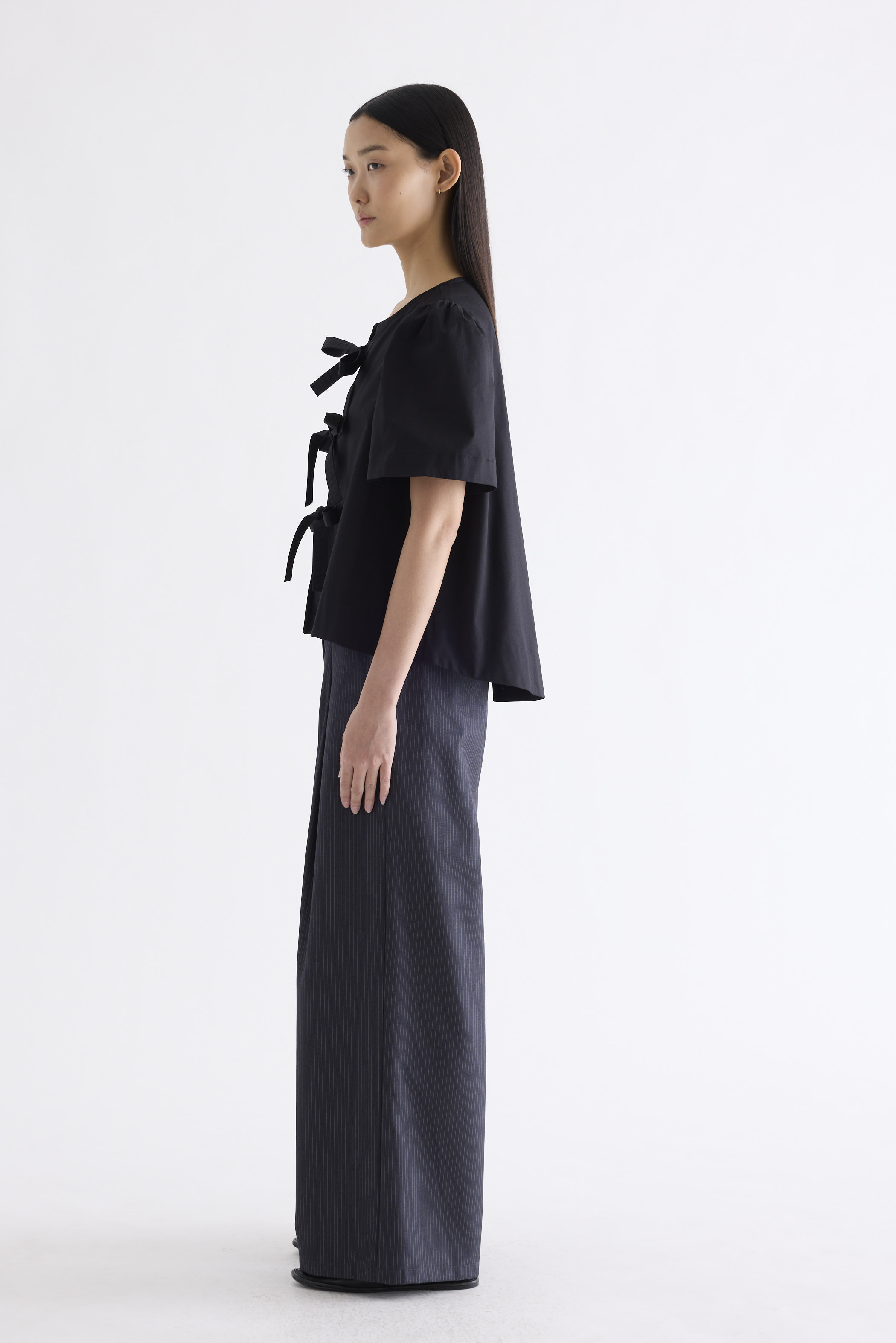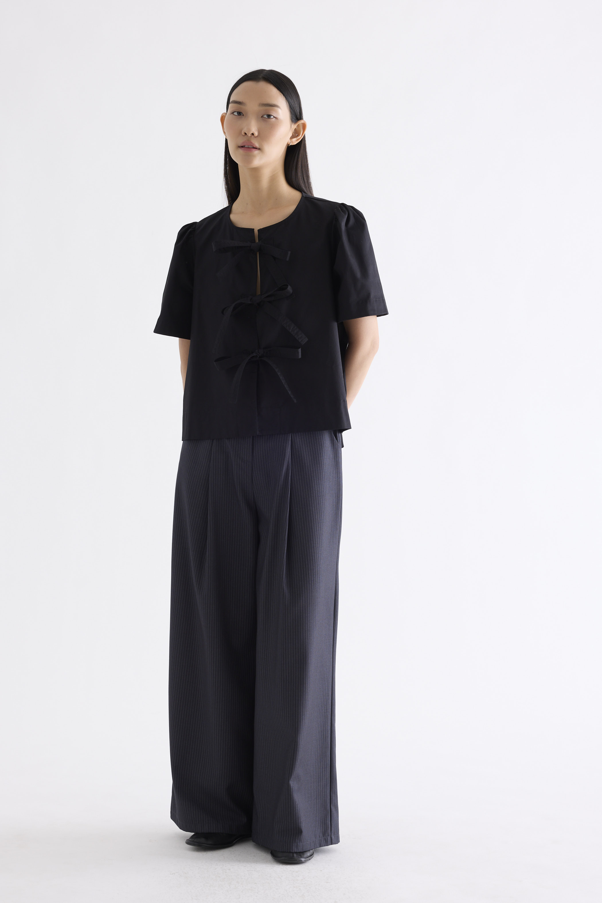 Bold bows. Cut from crisp and softly structured cotton, this blouse features a round neckline, short, slightly puffy sleeves and an open front with tie-strap closures. Worn in a relaxed fit.