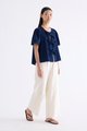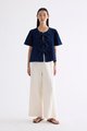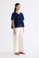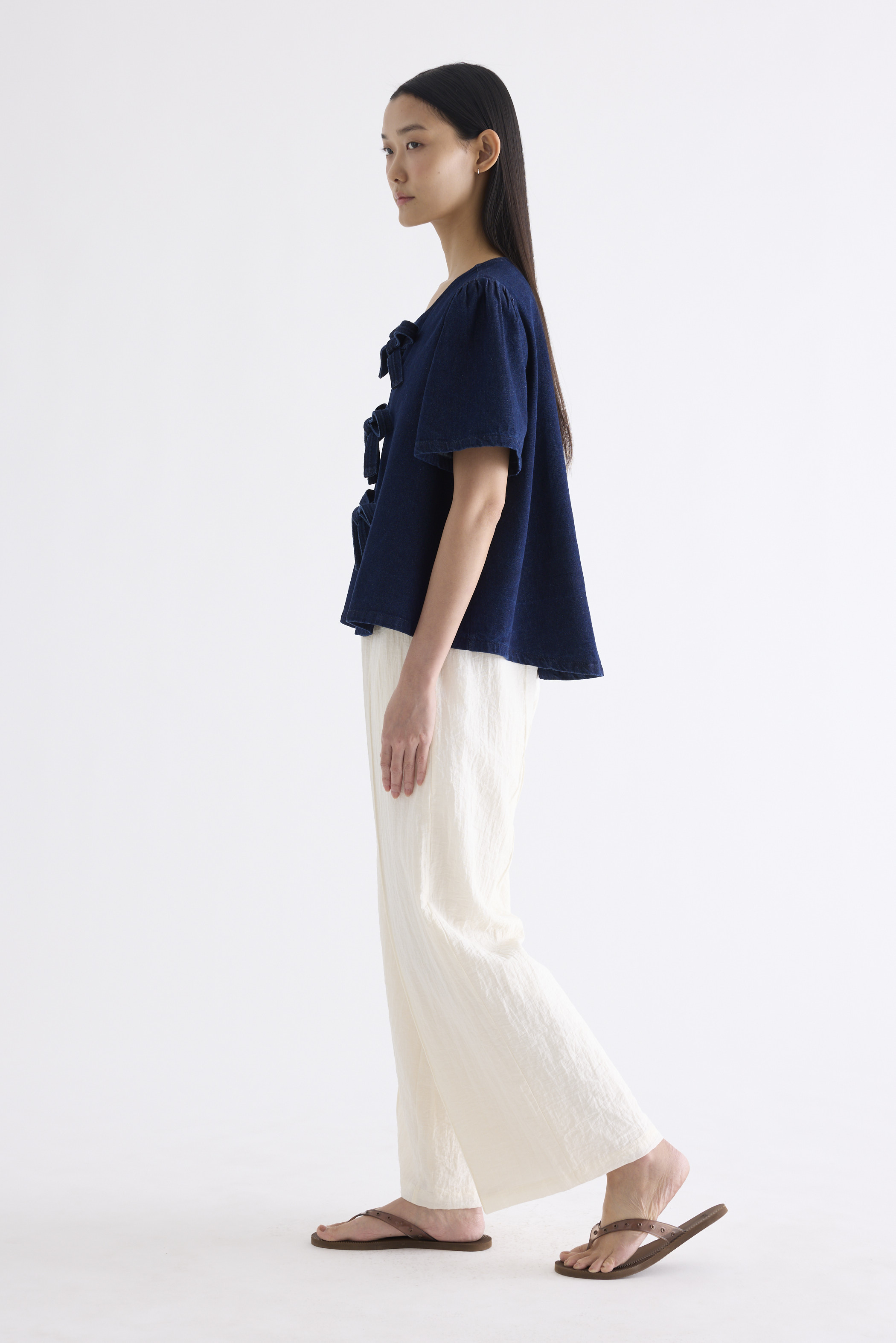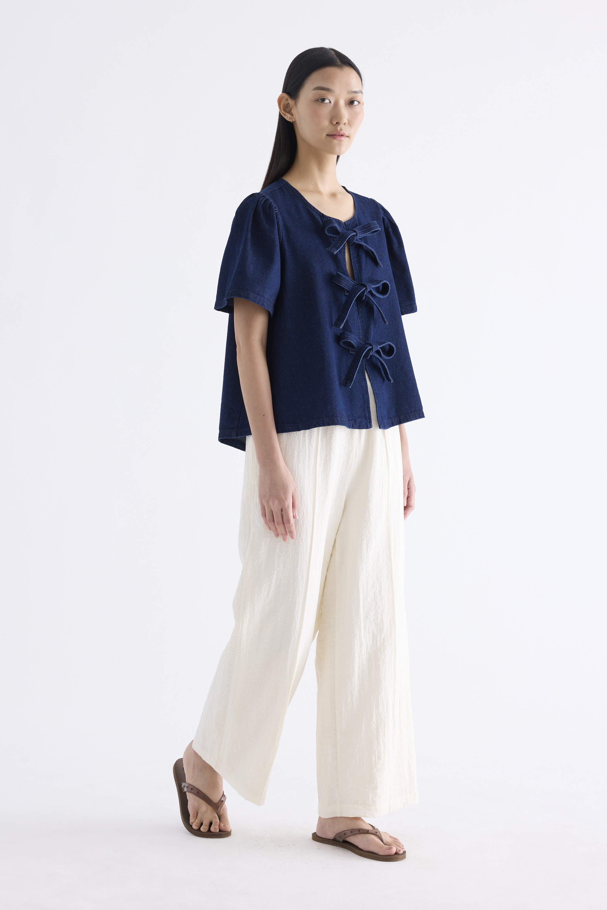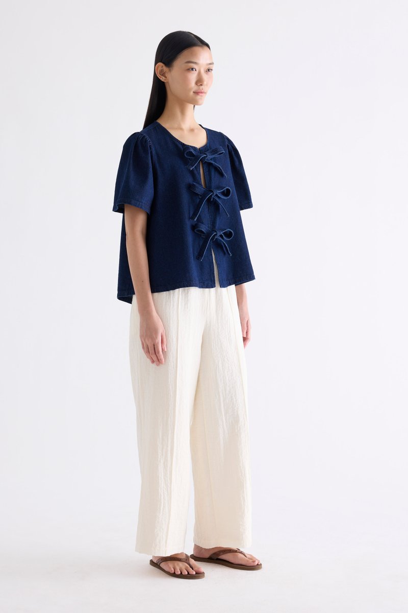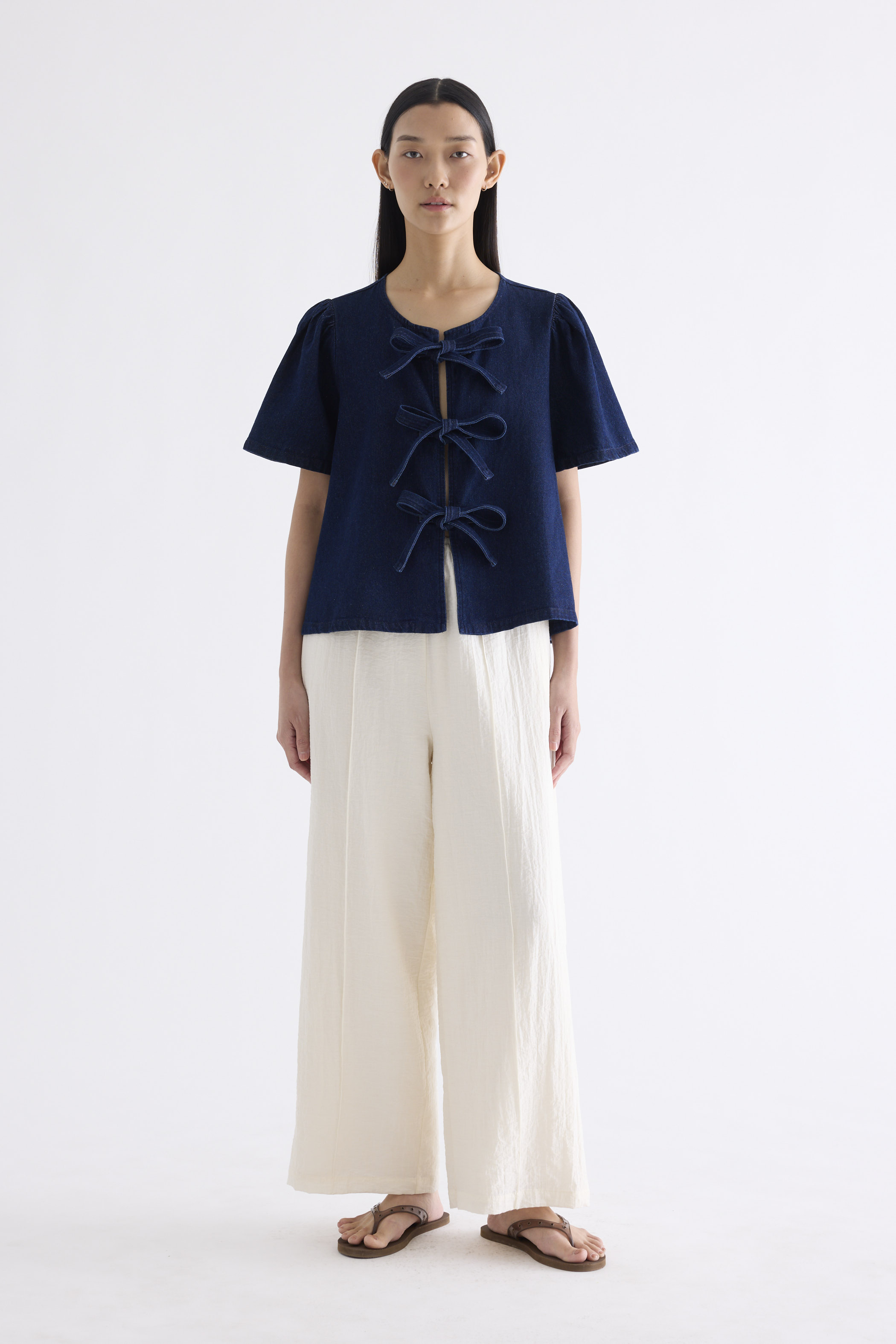 Bold bows. Cut from softly structured cotton denim, this blouse features a round neckline, short, slightly puffy sleeves and an open front with tie-strap closures. Worn in a slim fit.