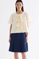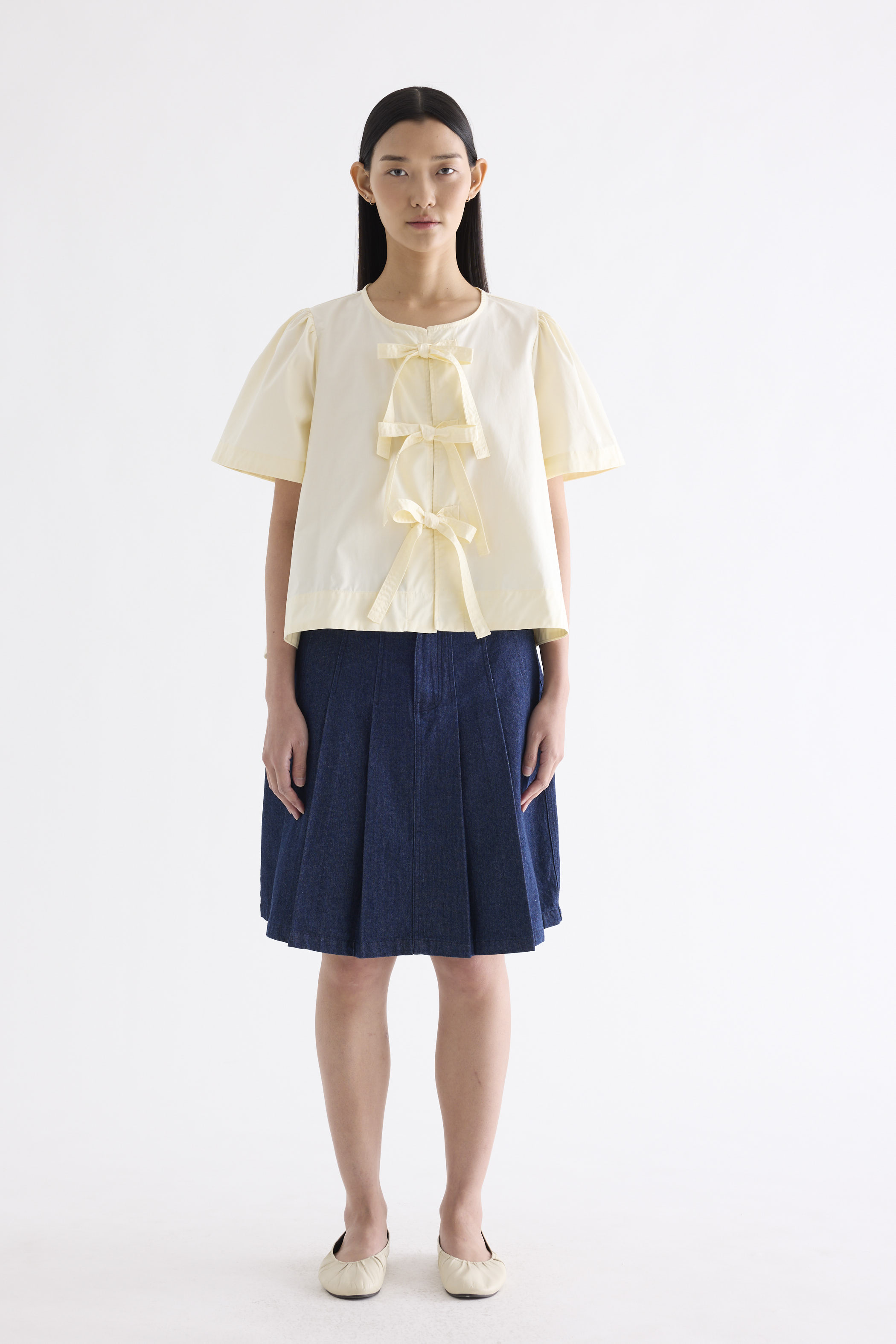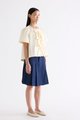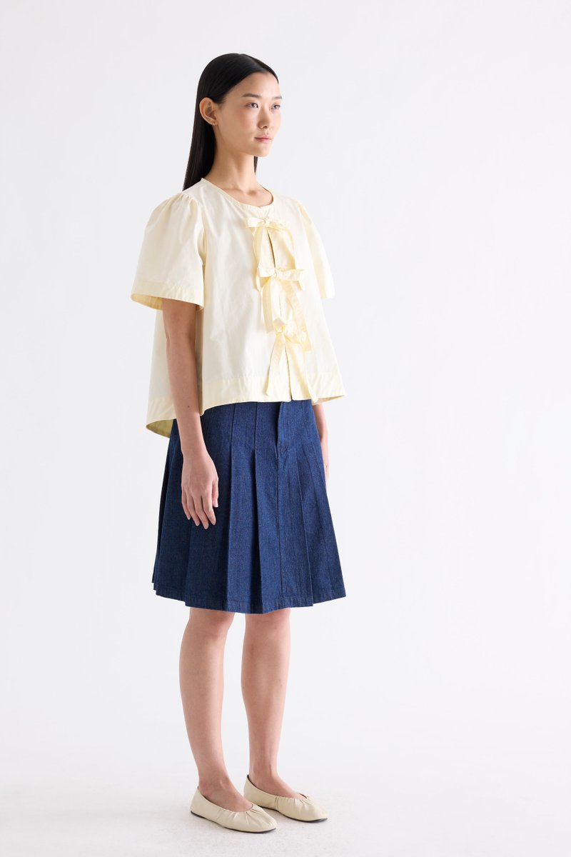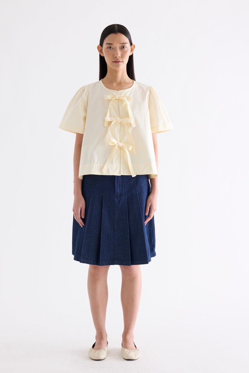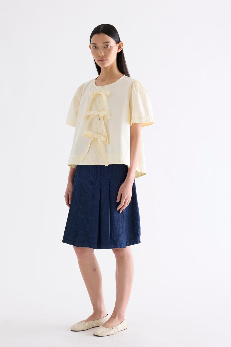 Bold bows. Cut from crisp and softly structured cotton, this blouse features a round neckline, short, slightly puffy sleeves and an open front with tie-strap closures. Worn in a relaxed fit.