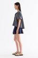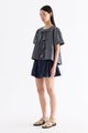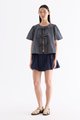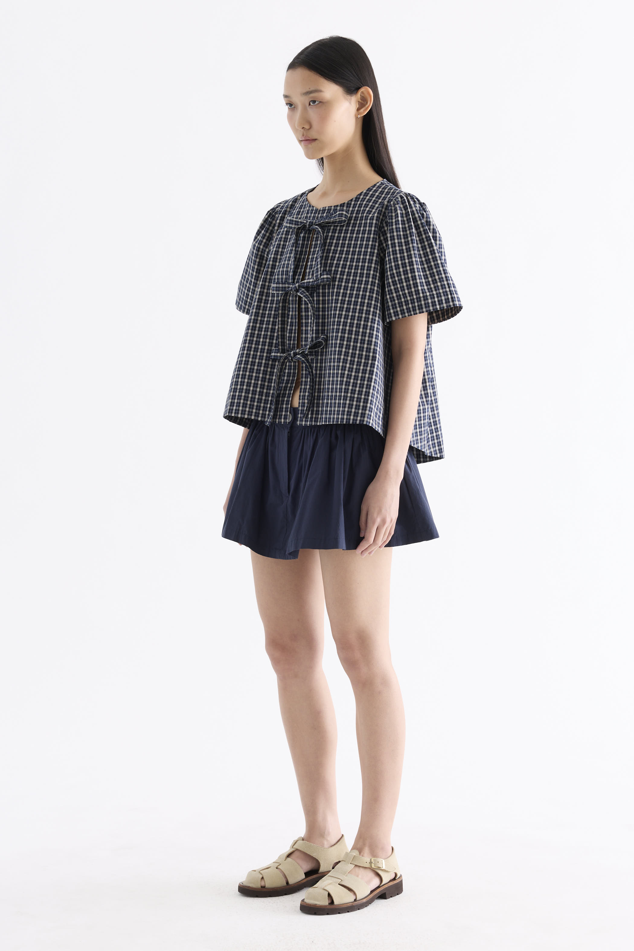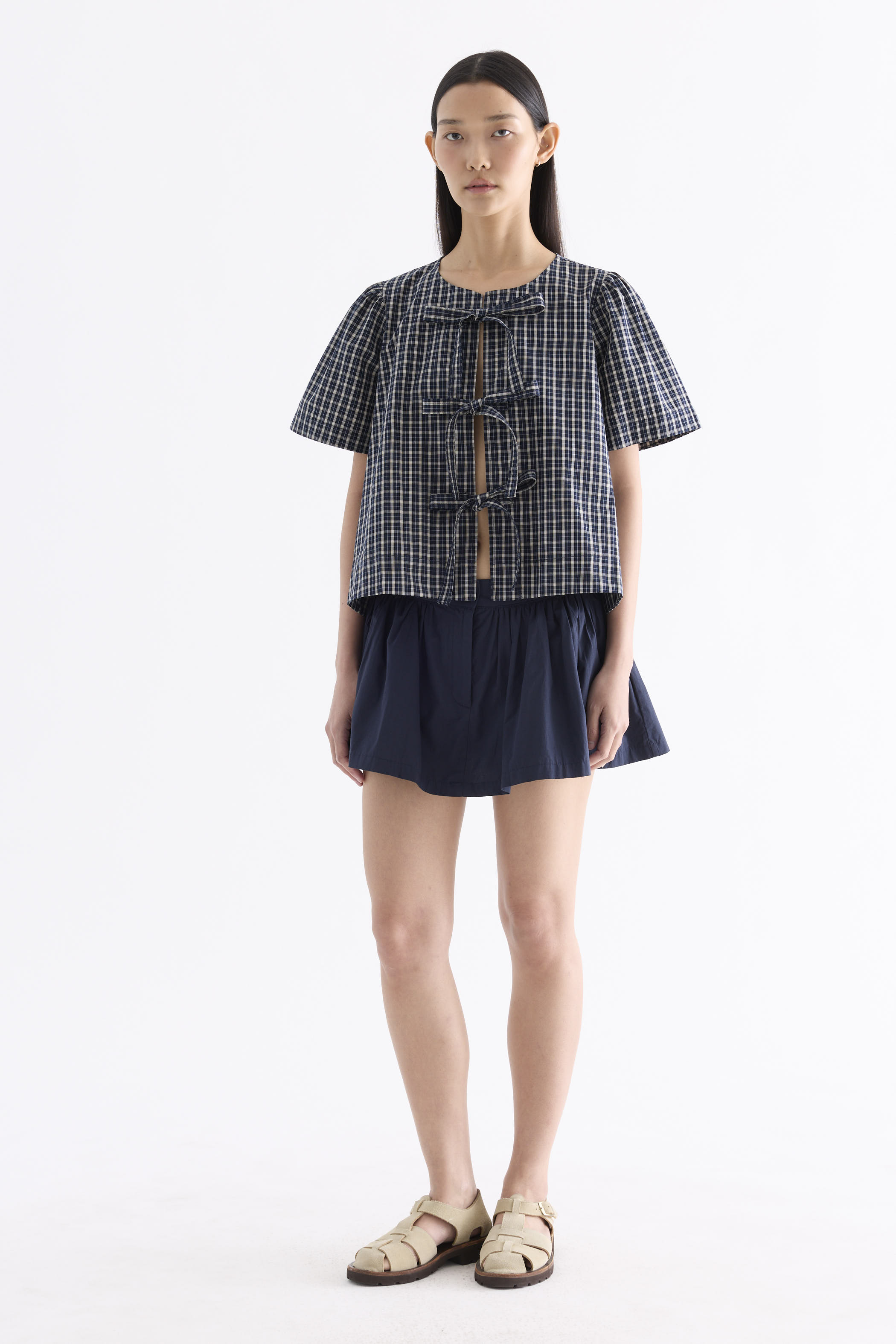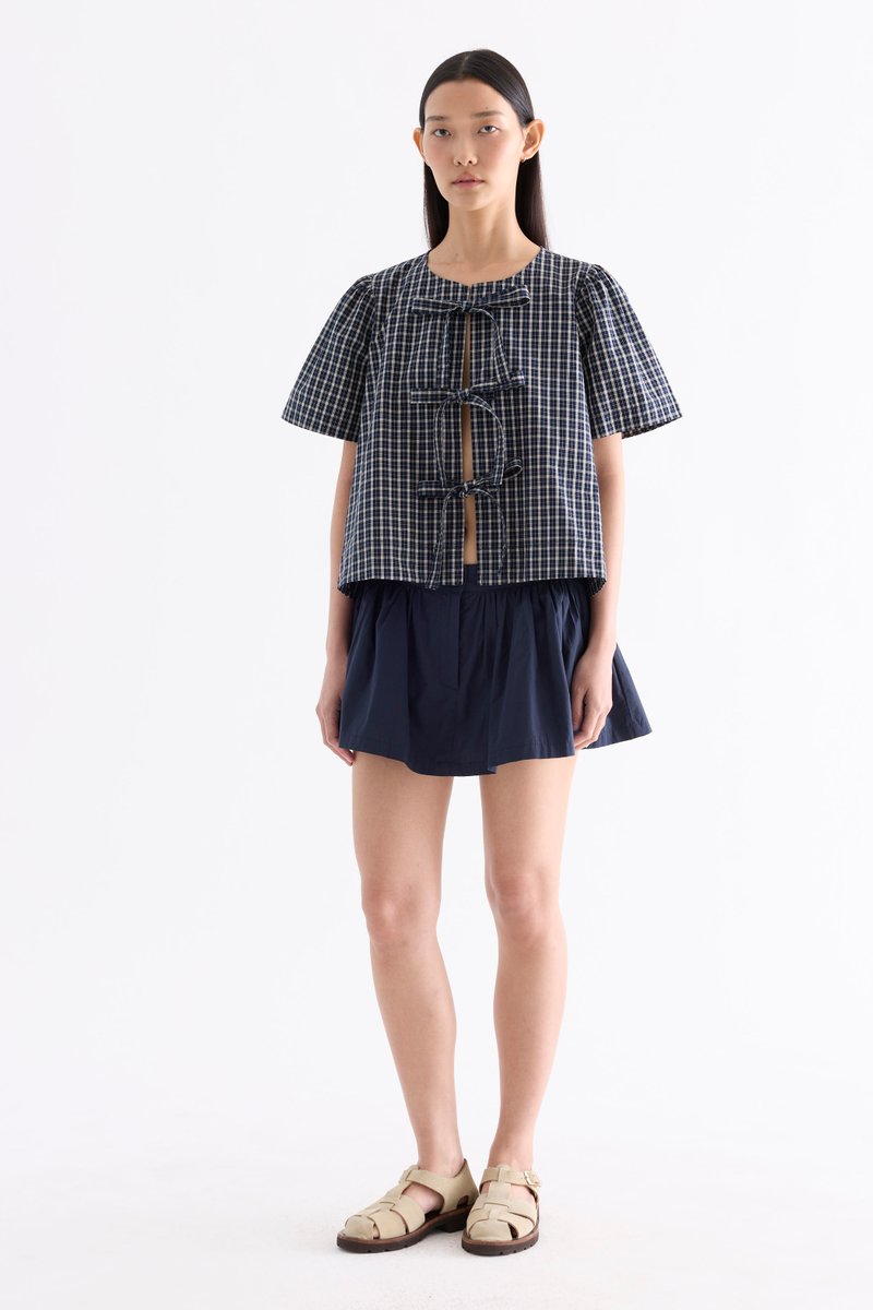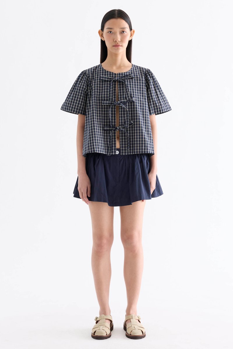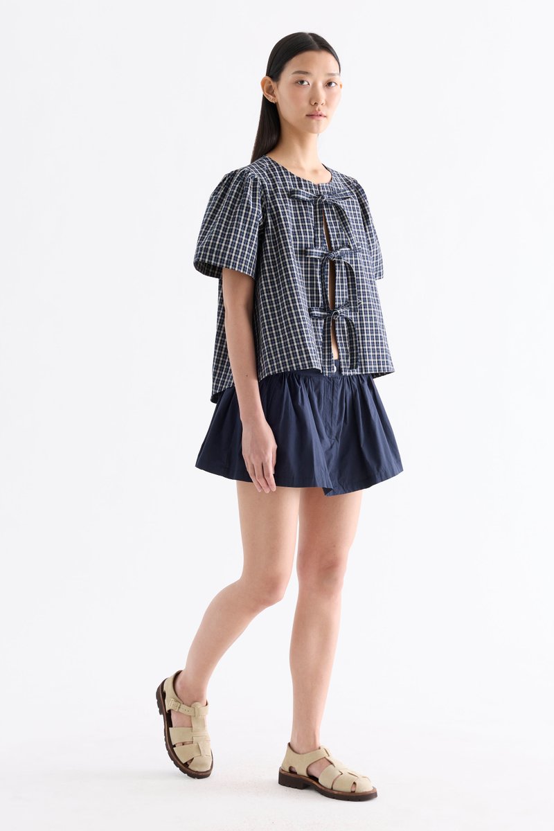 Bold bows. Cut from crisp and softly structured cotton, this blouse features a round neckline, short, slightly puffy sleeves and an open front with tie-strap closures. Worn in a relaxed fit.