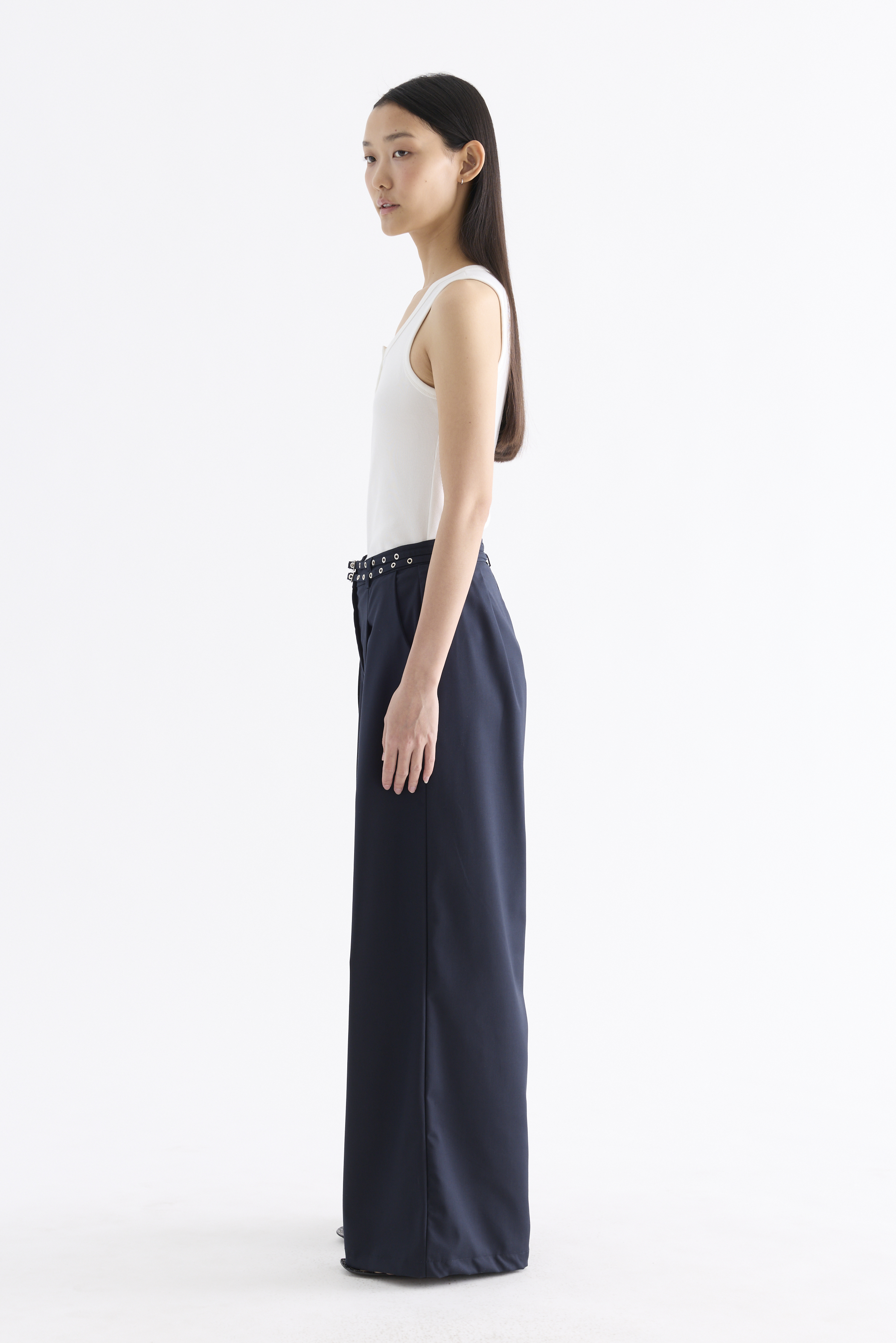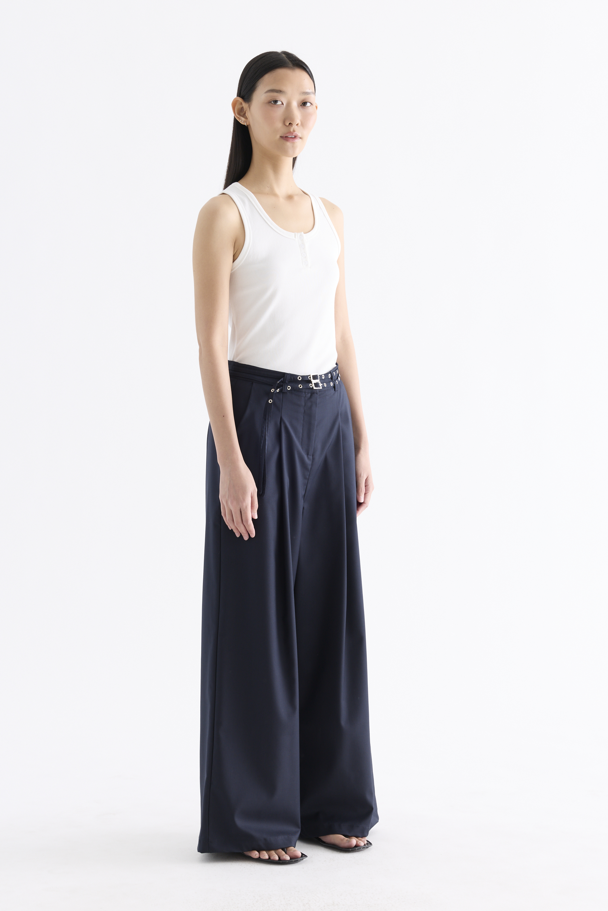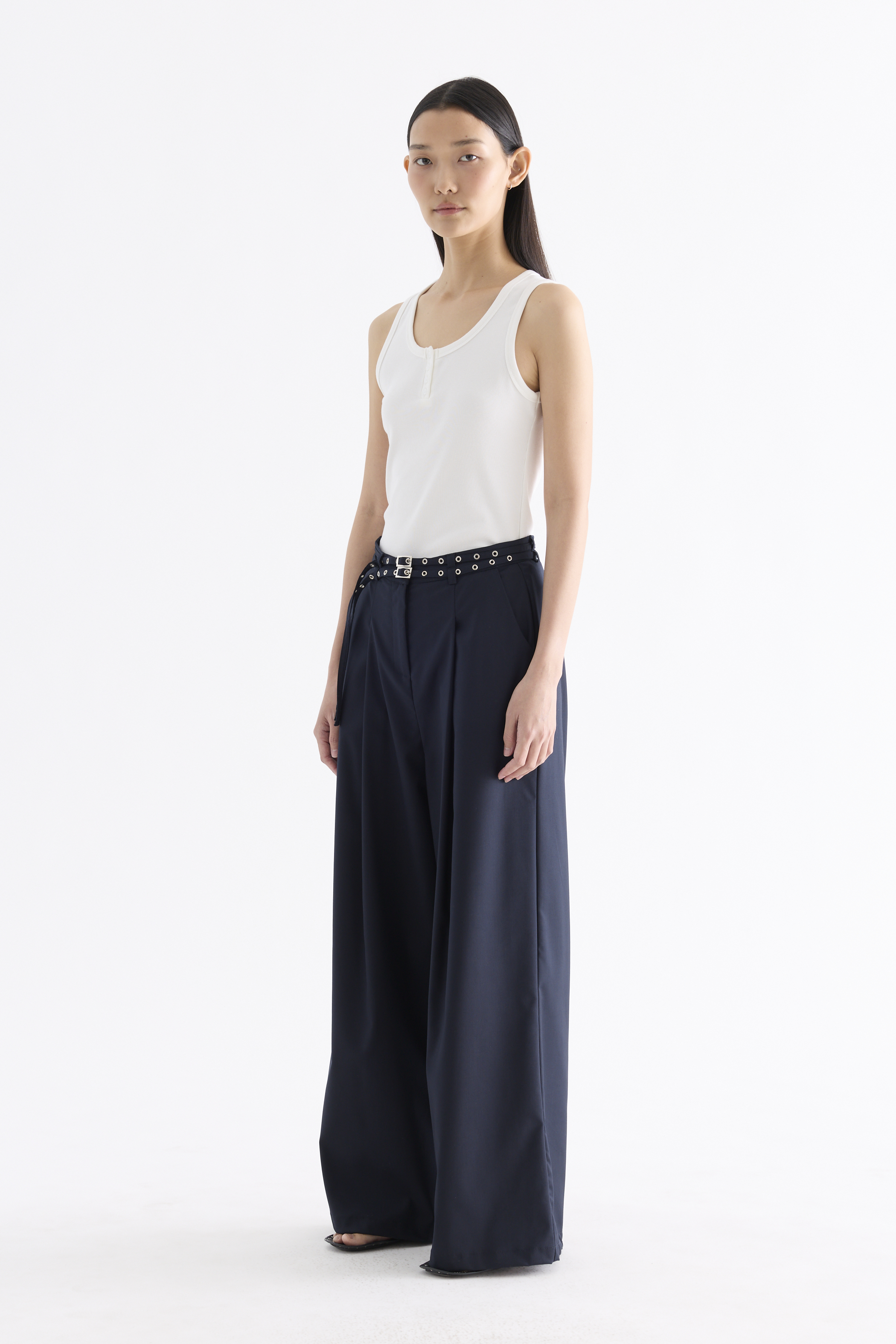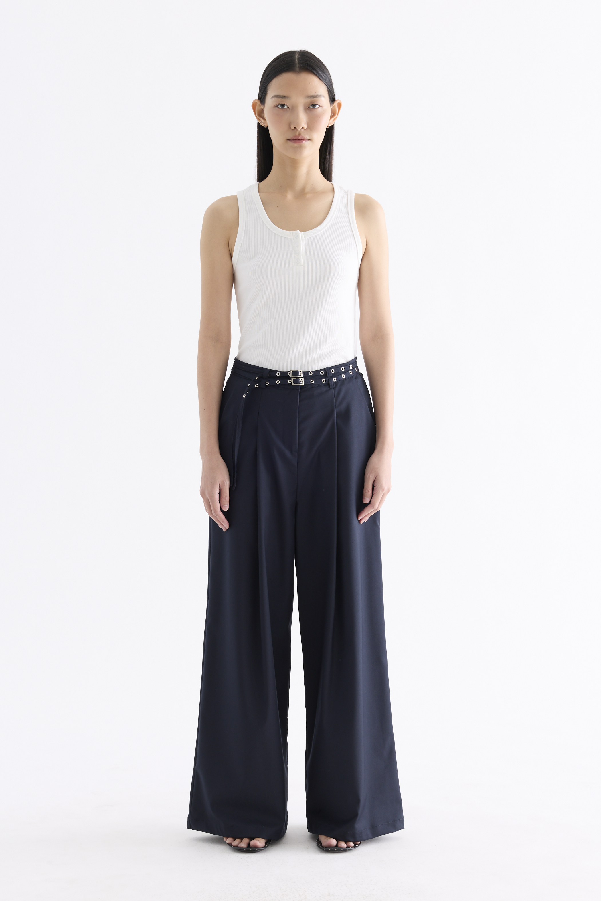Twice the impact. Made from smooth and gently tailored fabric, these high-rise pants feature detachable studded belts, wide straight legs, belt loops, and a front zip and button closure. Worn in a relaxed fit.