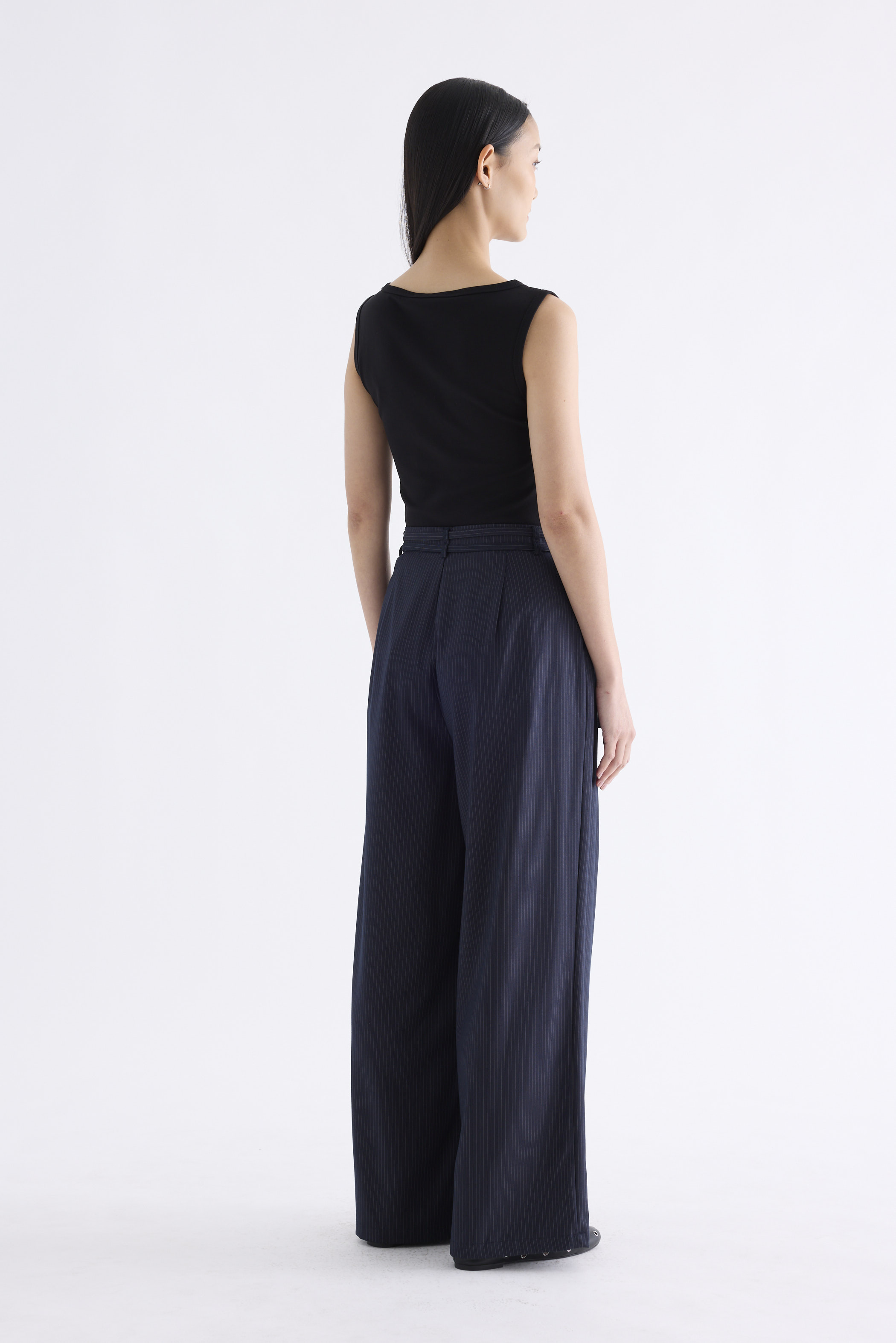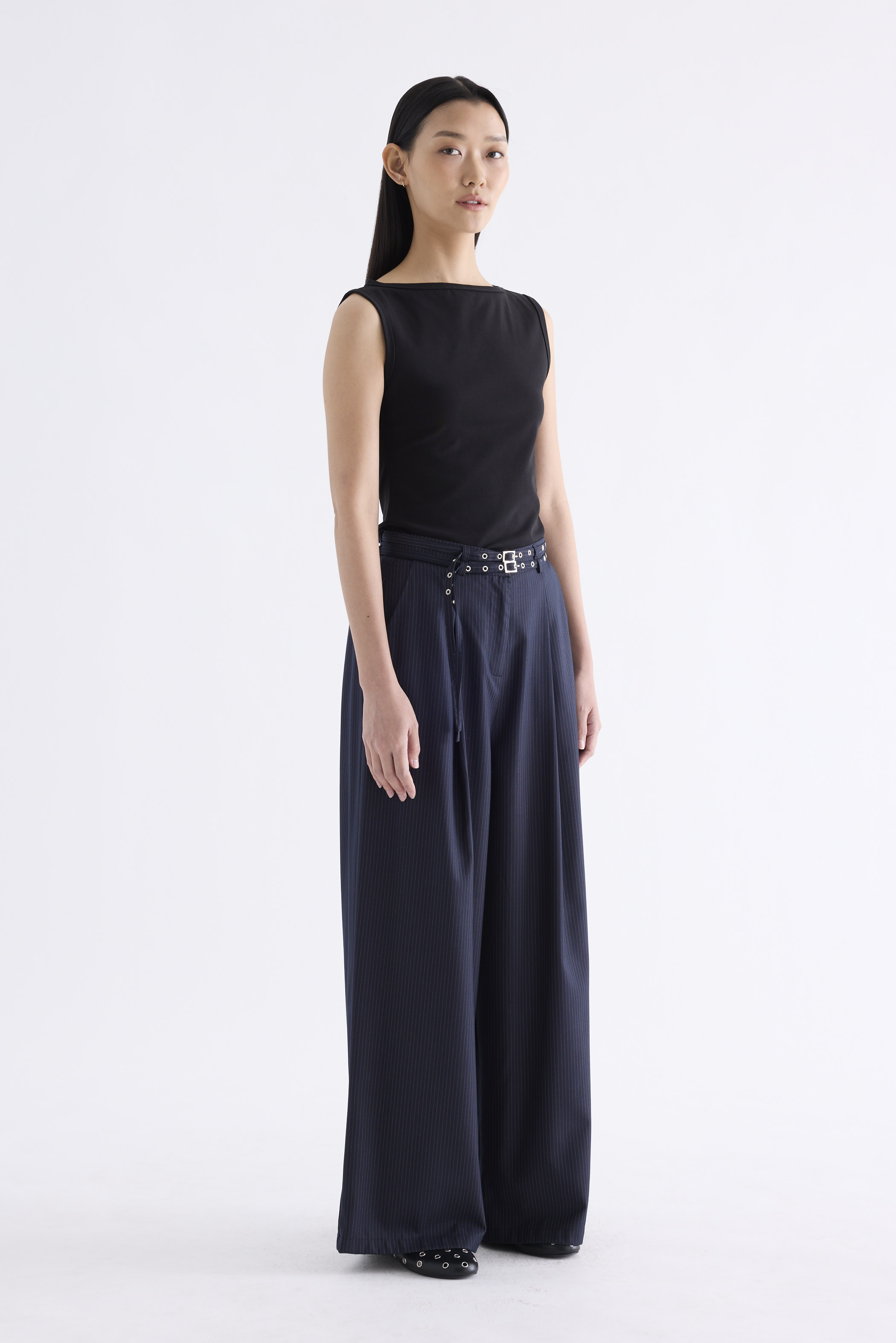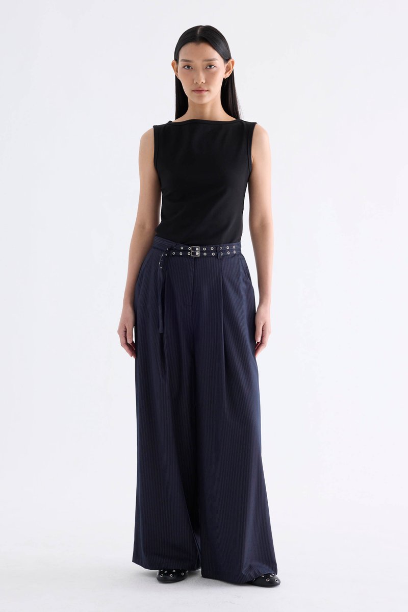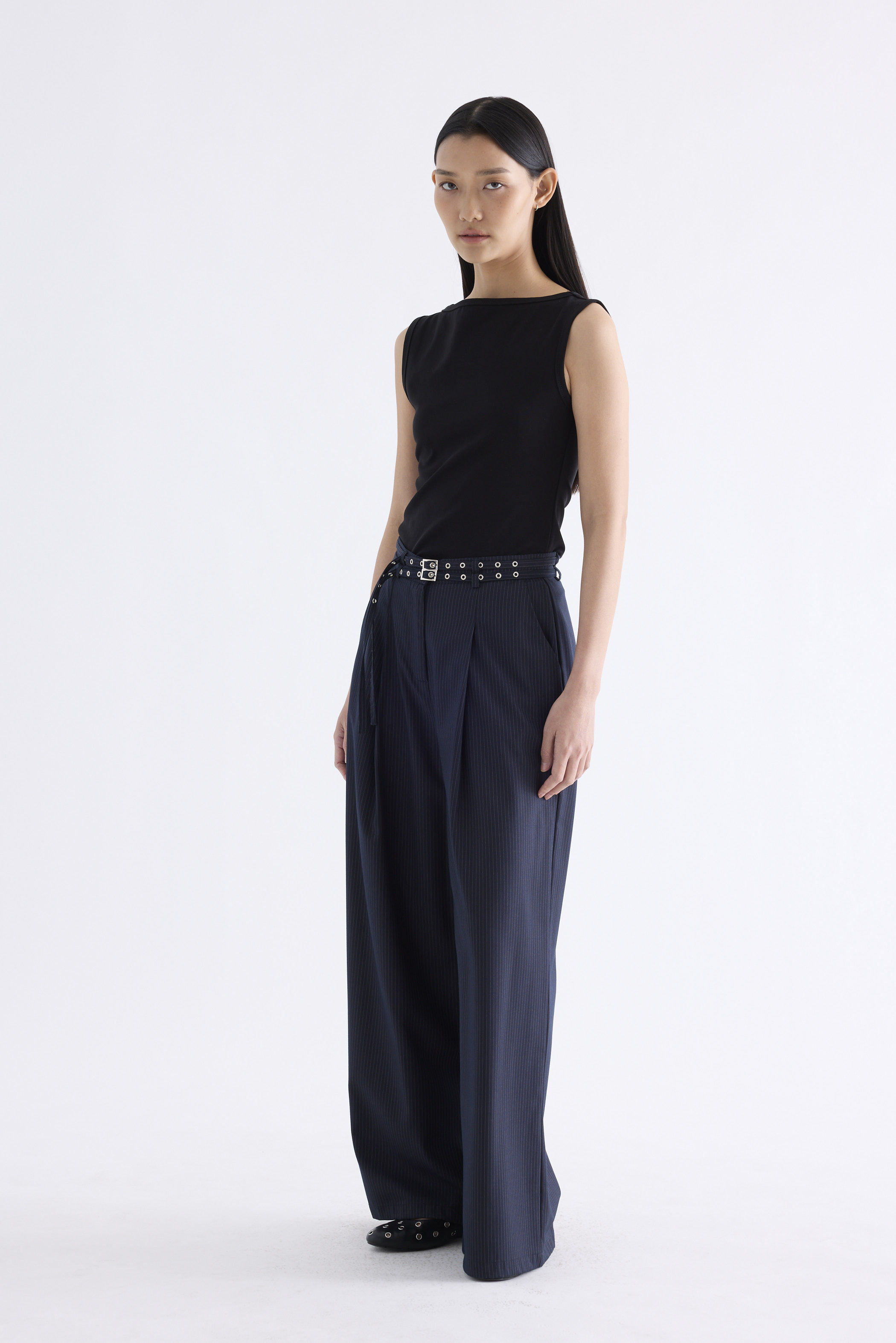 Twice the impact. Made from smooth and gently tailored fabric, these high-rise pants feature detachable studded belts, wide straight legs, belt loops, and a front zip and button closure. Worn in a relaxed fit.