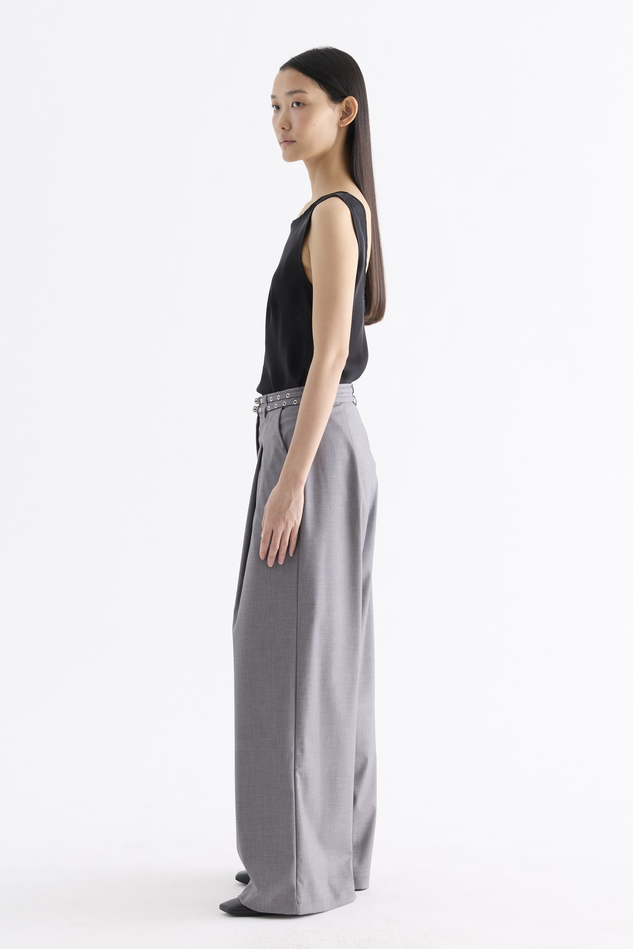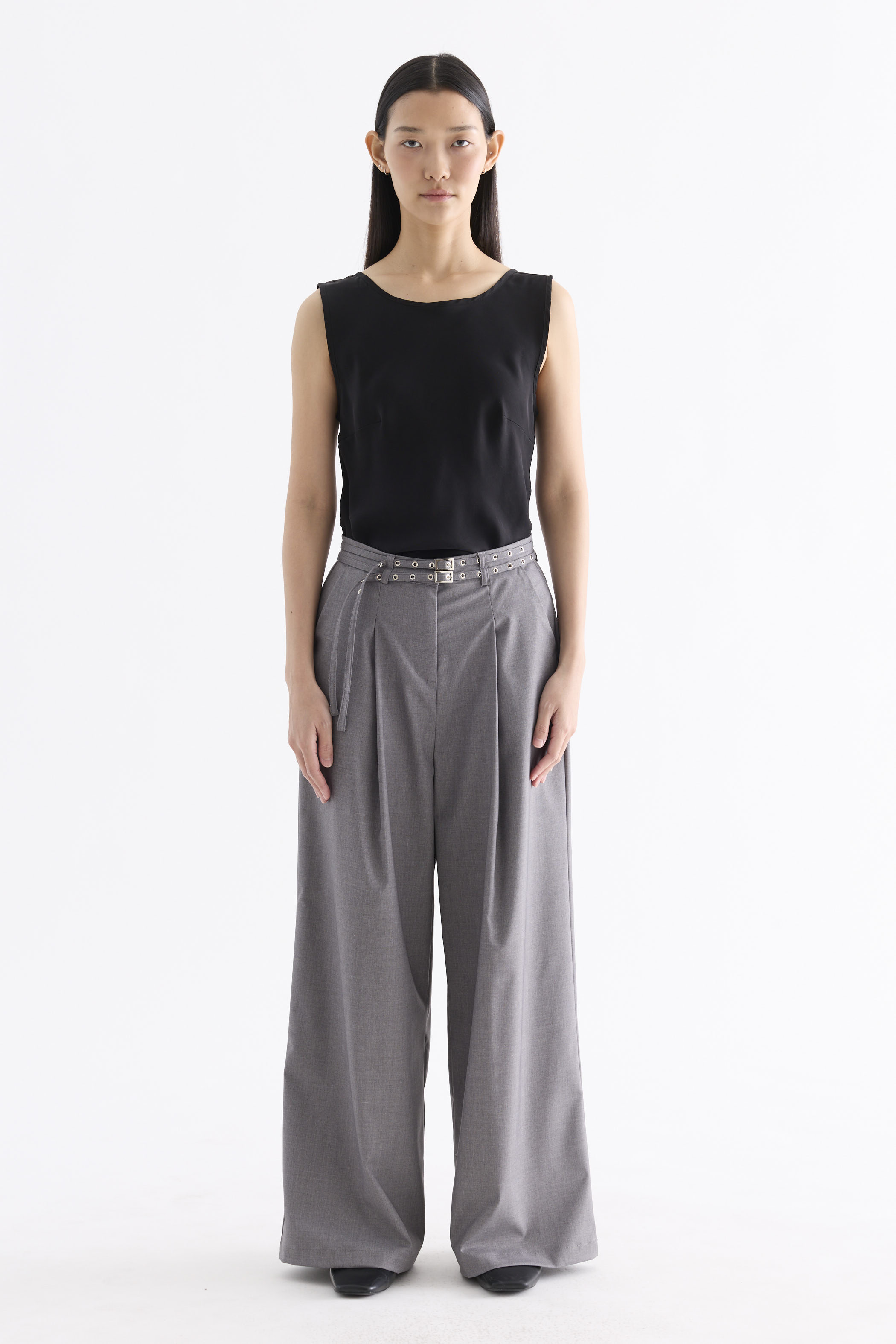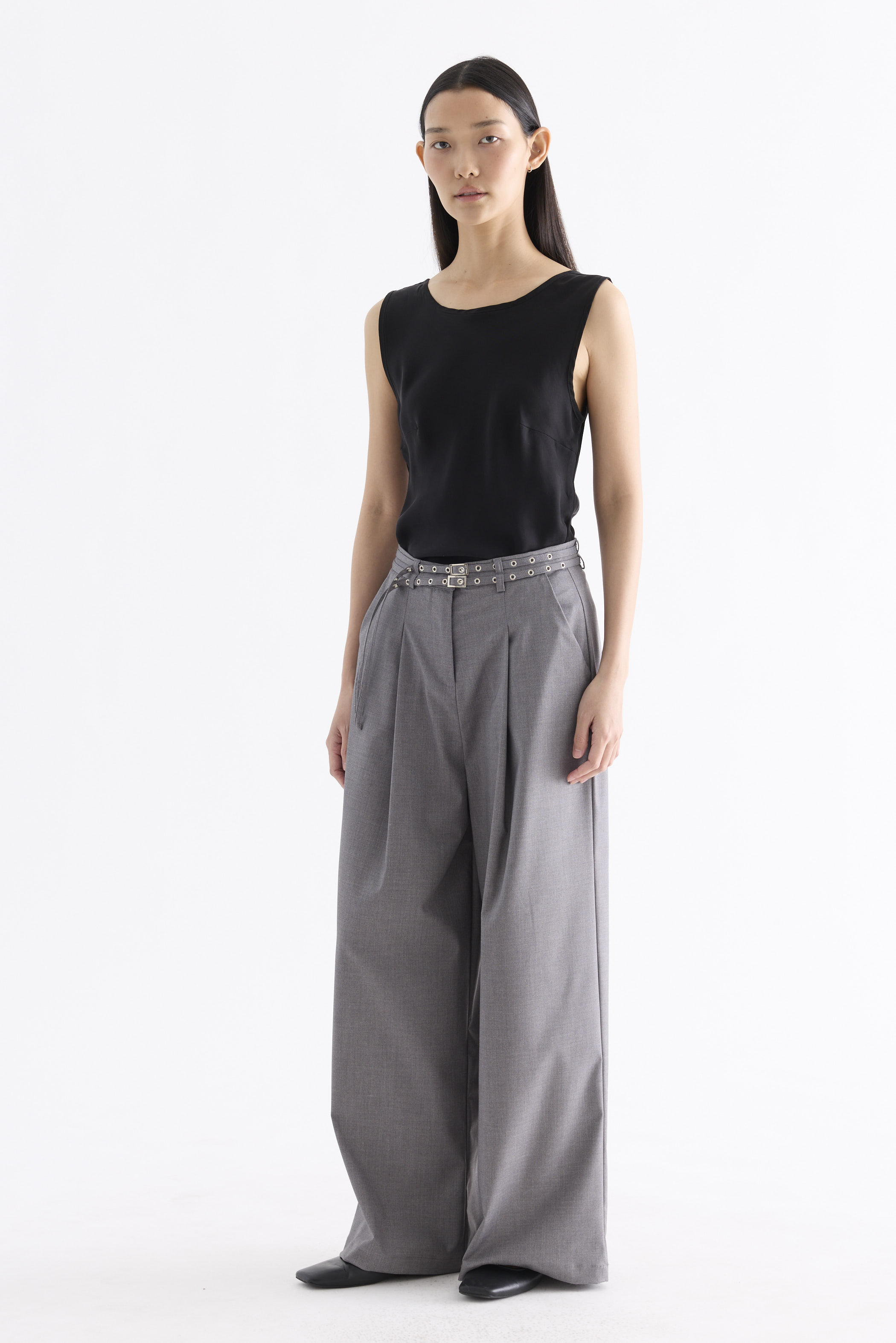 Twice the impact. Made from smooth and gently tailored fabric, these high-rise pants feature detachable studded belts, wide straight legs, belt loops, and a front zip and button closure. Worn in a relaxed fit.