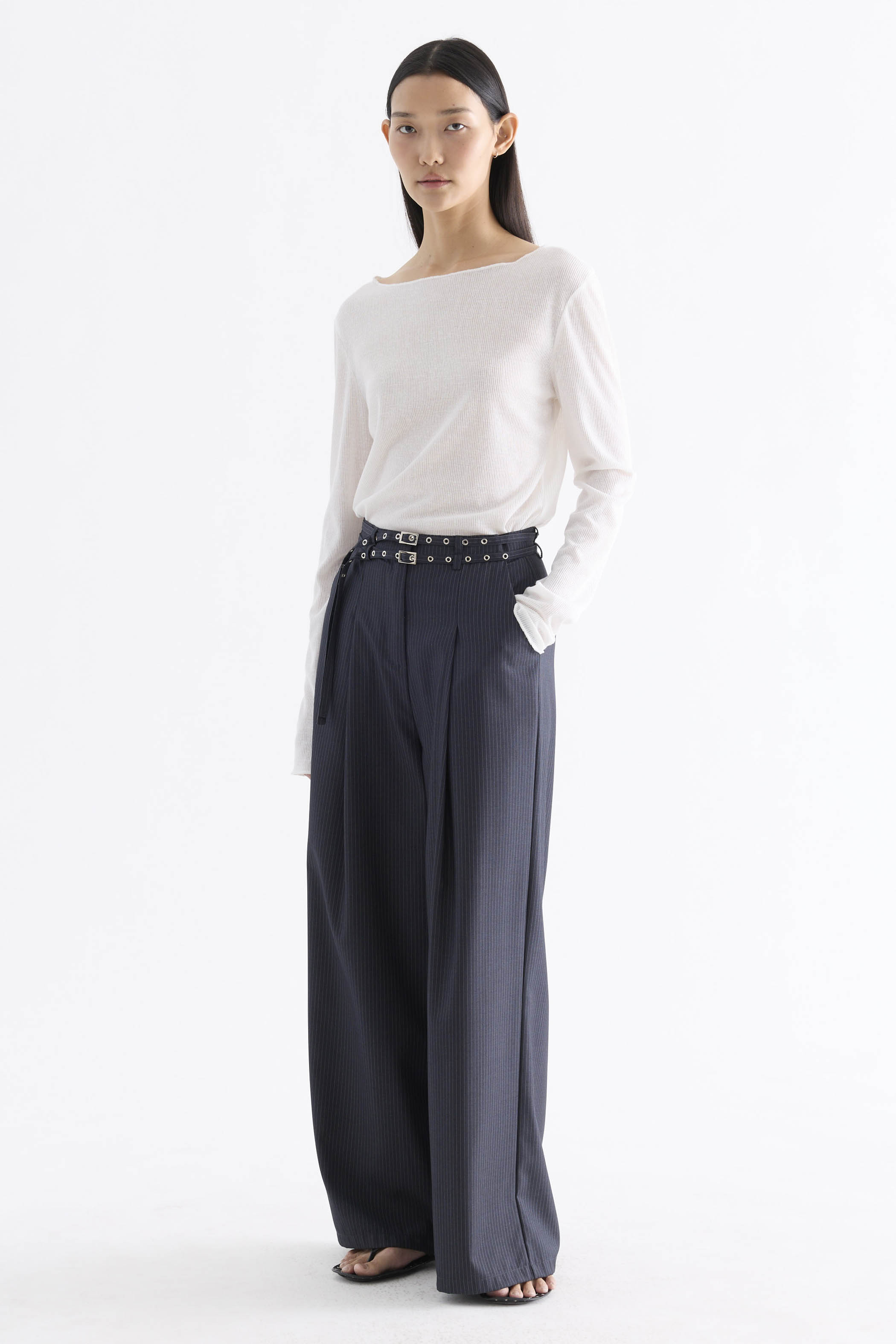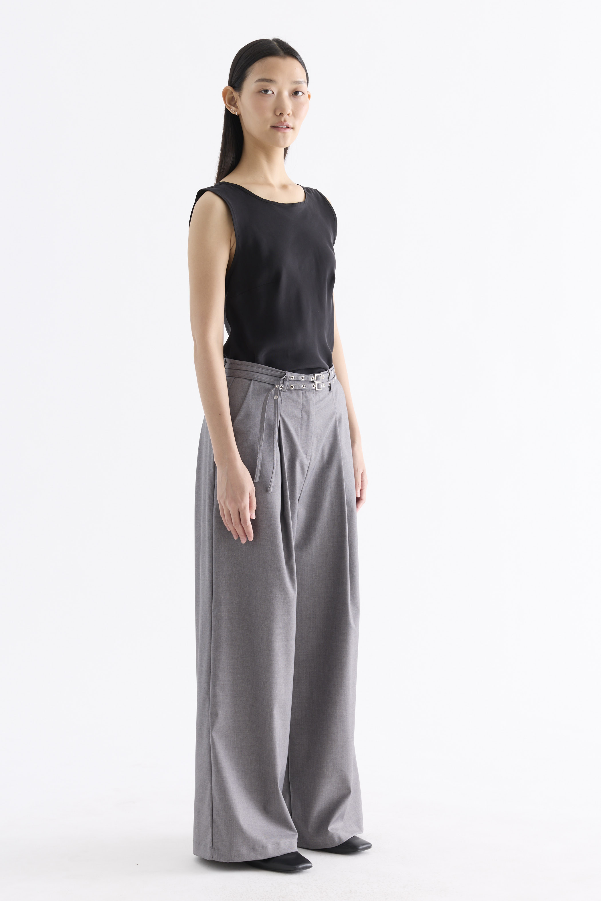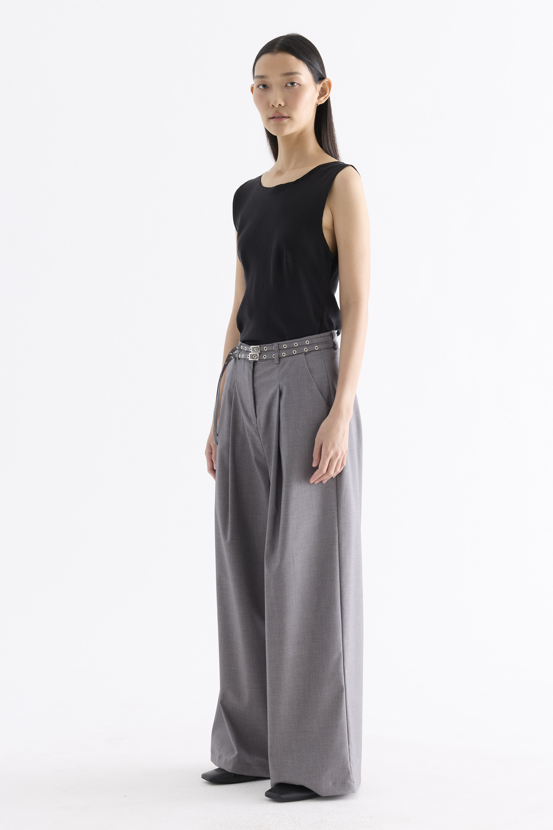 Twice the impact. Made from smooth and gently tailored fabric, these high-rise pants feature detachable studded belts, wide straight legs, belt loops, and a front zip and button closure. Worn in a relaxed fit.