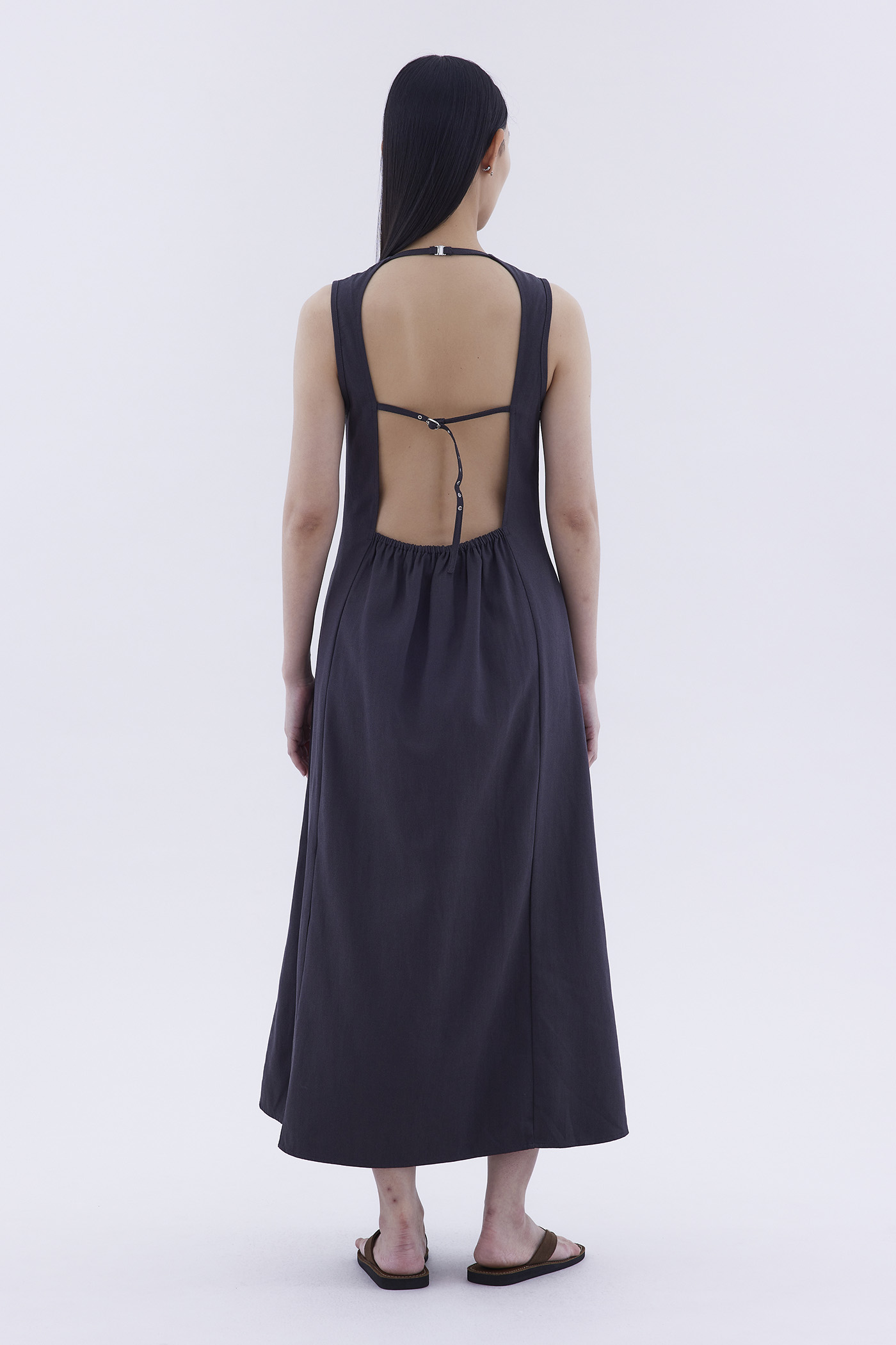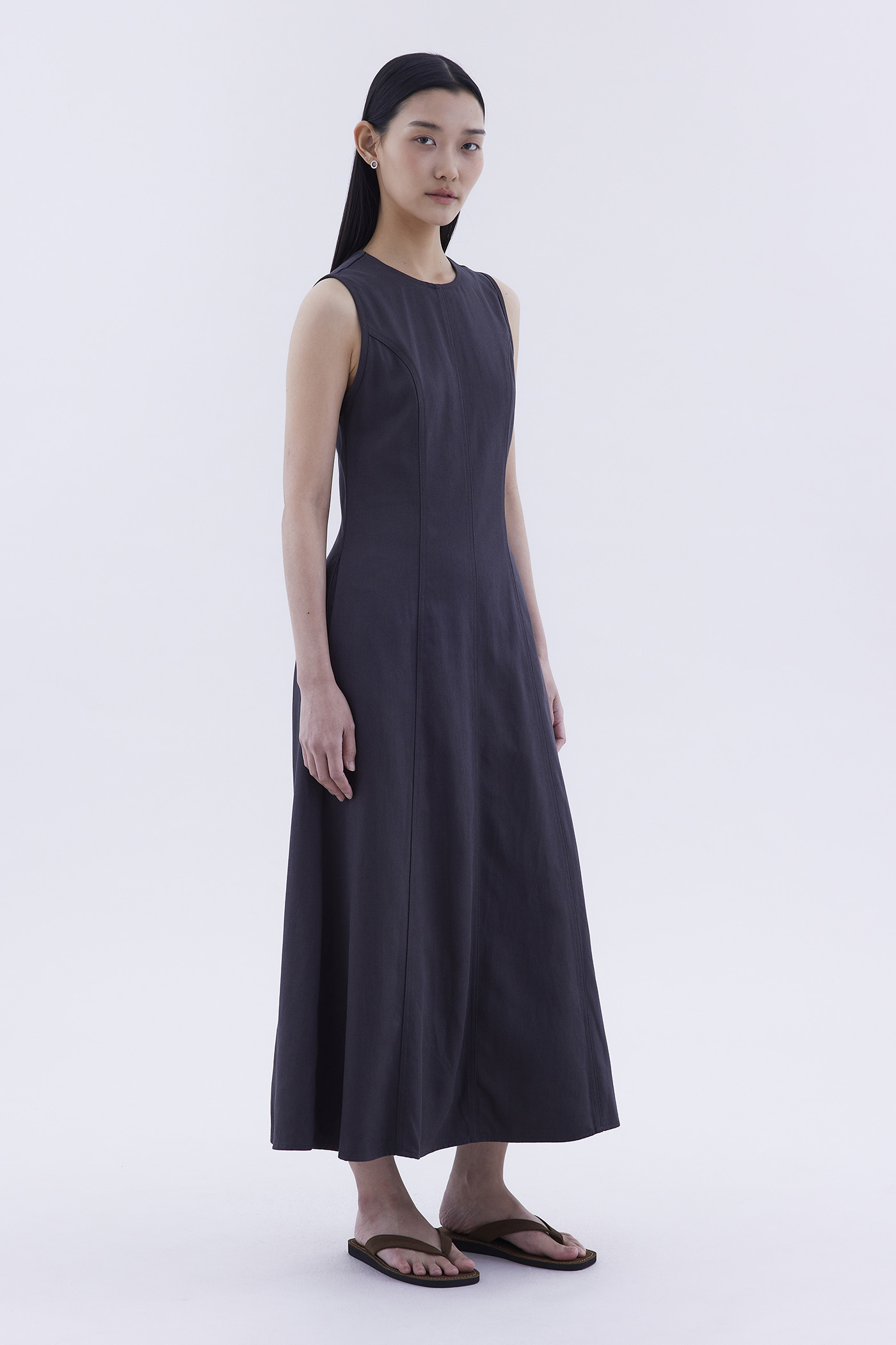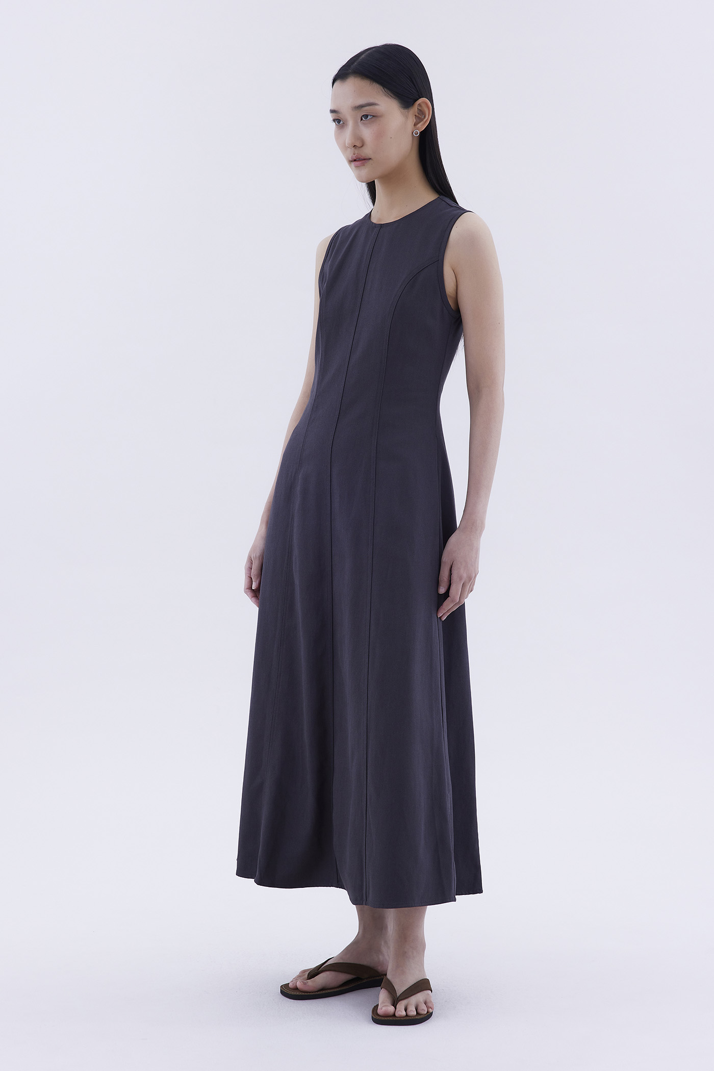 Good from every angle. Made from softly structured fabric, this sleeveless maxi dress features a round neckline, panelled construction and an elasticated back opening with connecting straps. Worn in a slim fit.