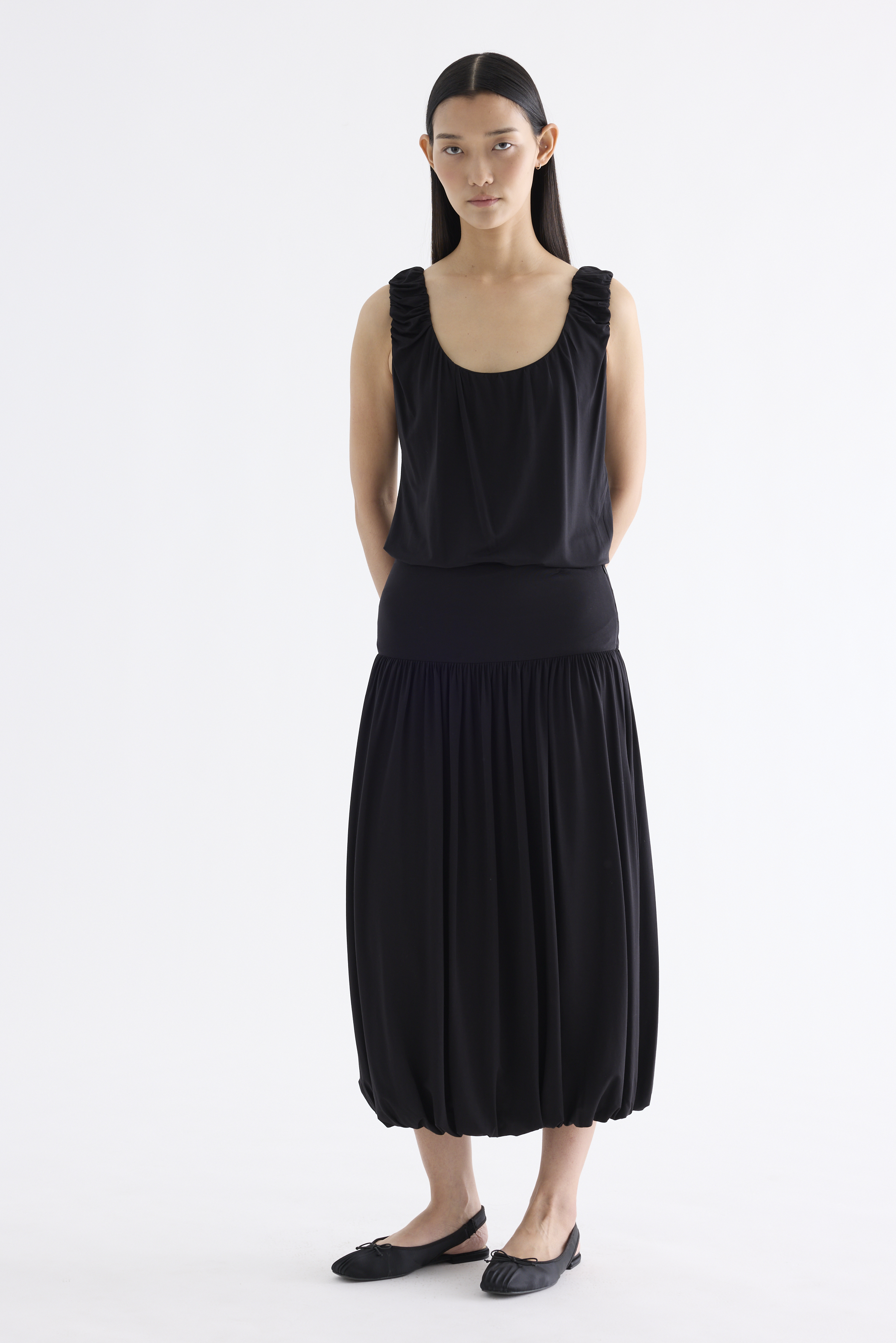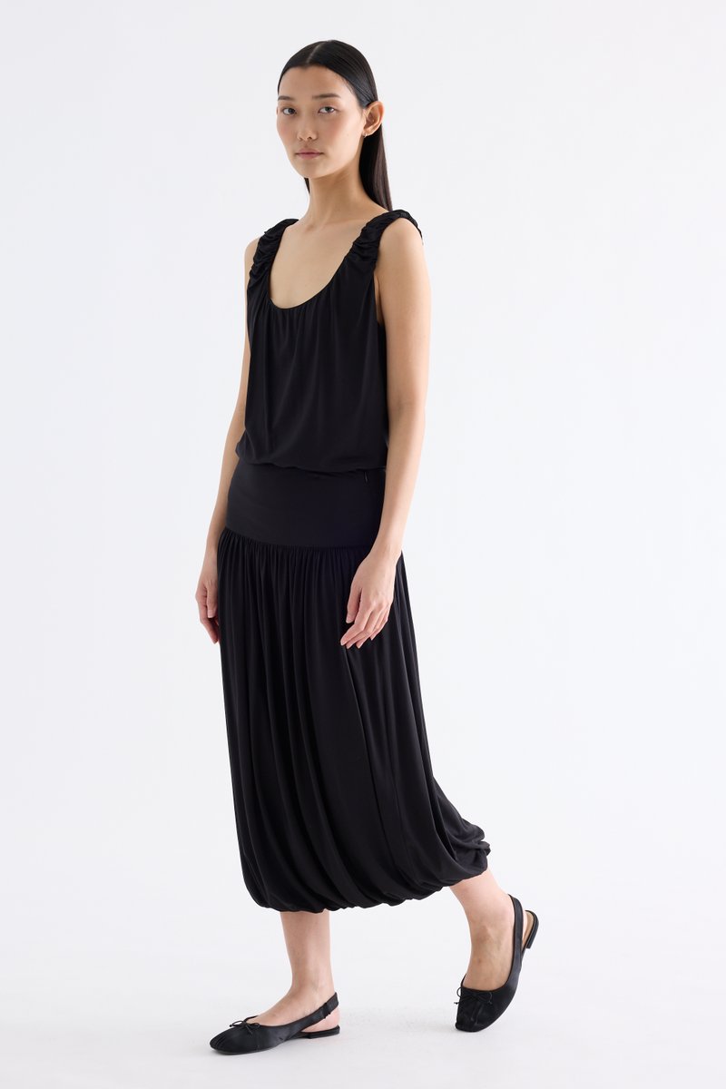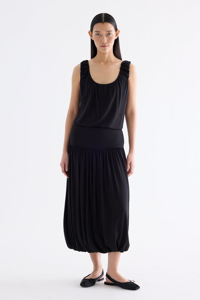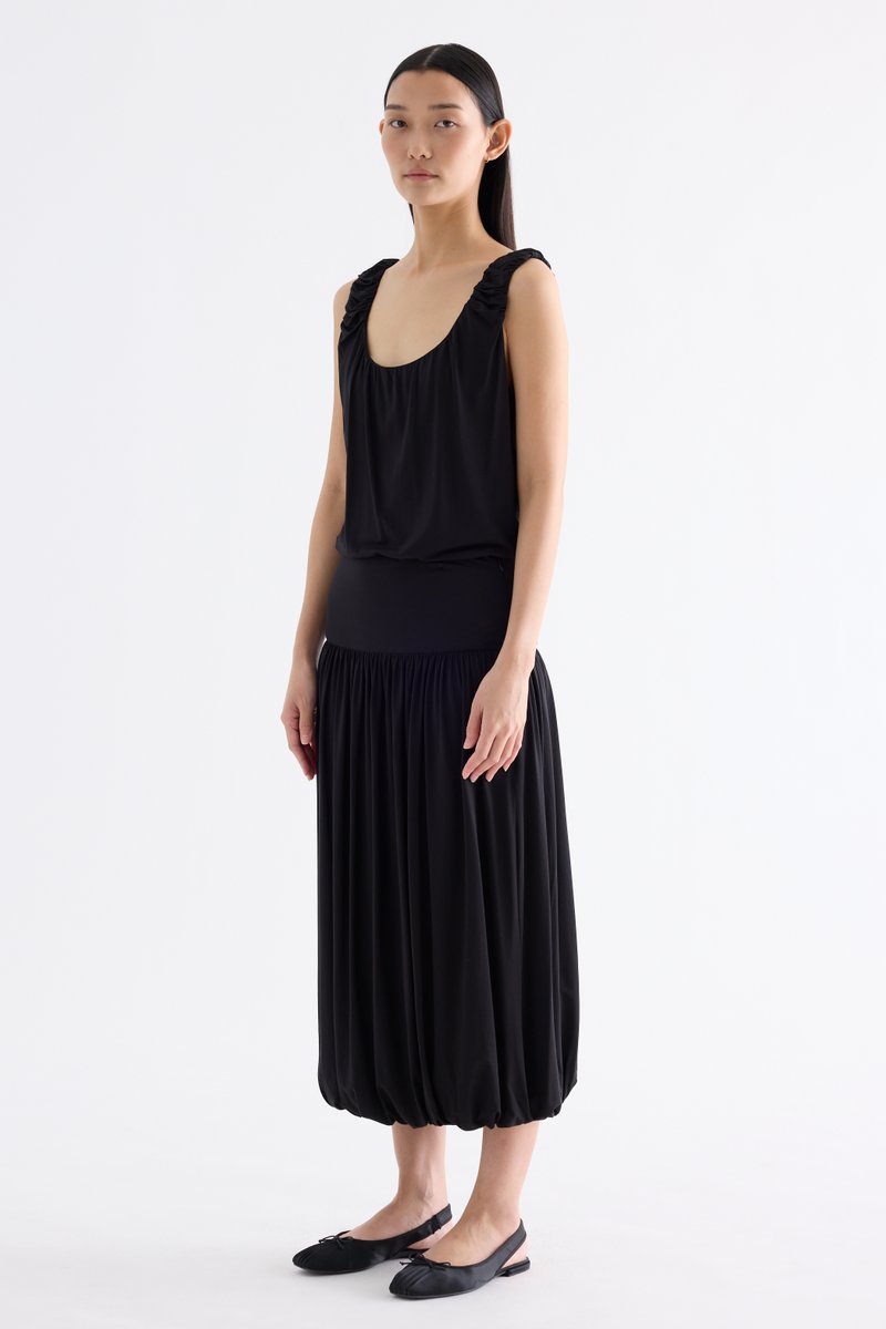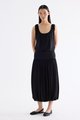 Volume, up. Made from smooth and stretchy fabric, this midi skirt features an extended waist panel and a gathered silhouette with a bubble hem. Worn in a relaxed fit with a size zip closure.