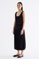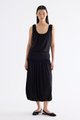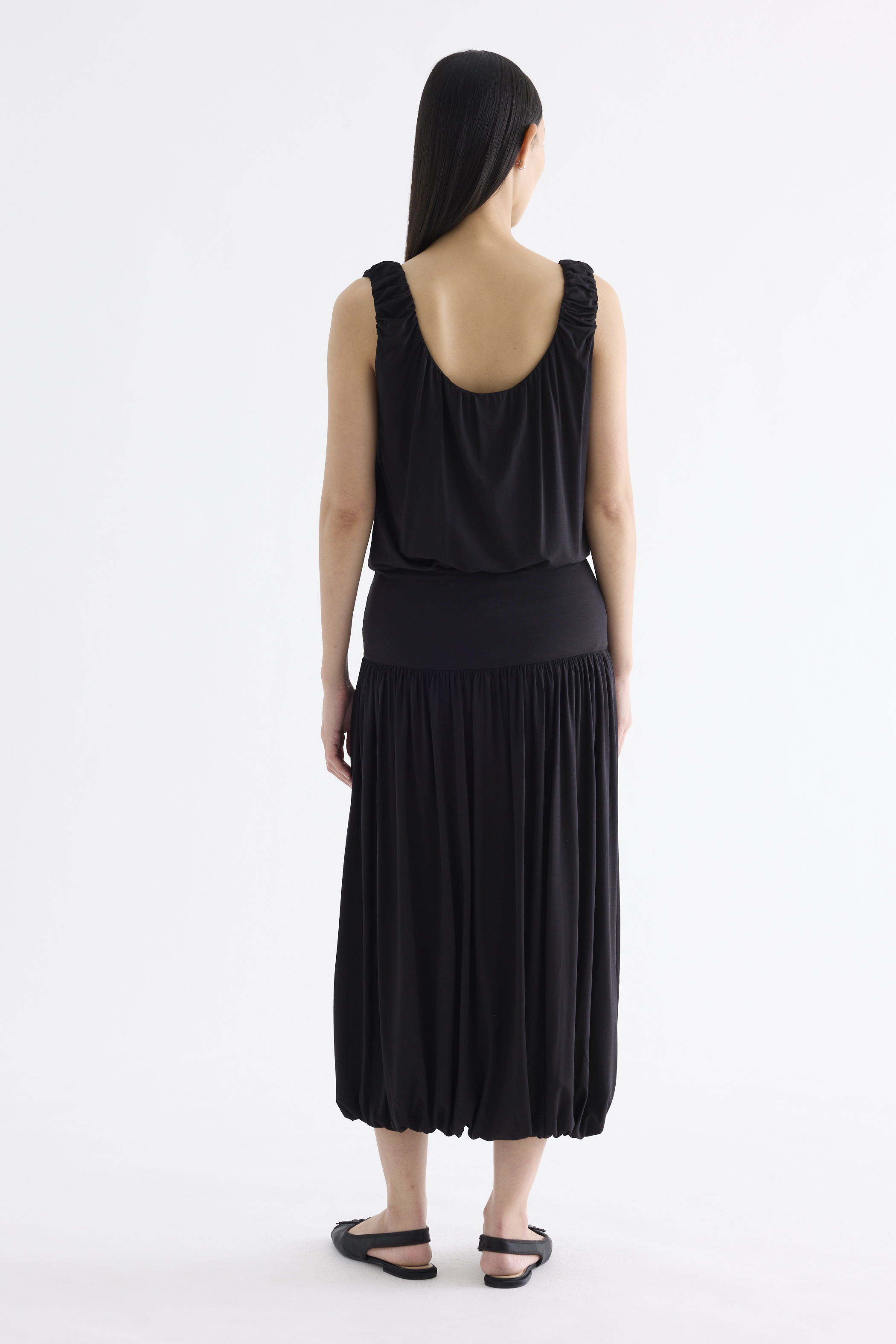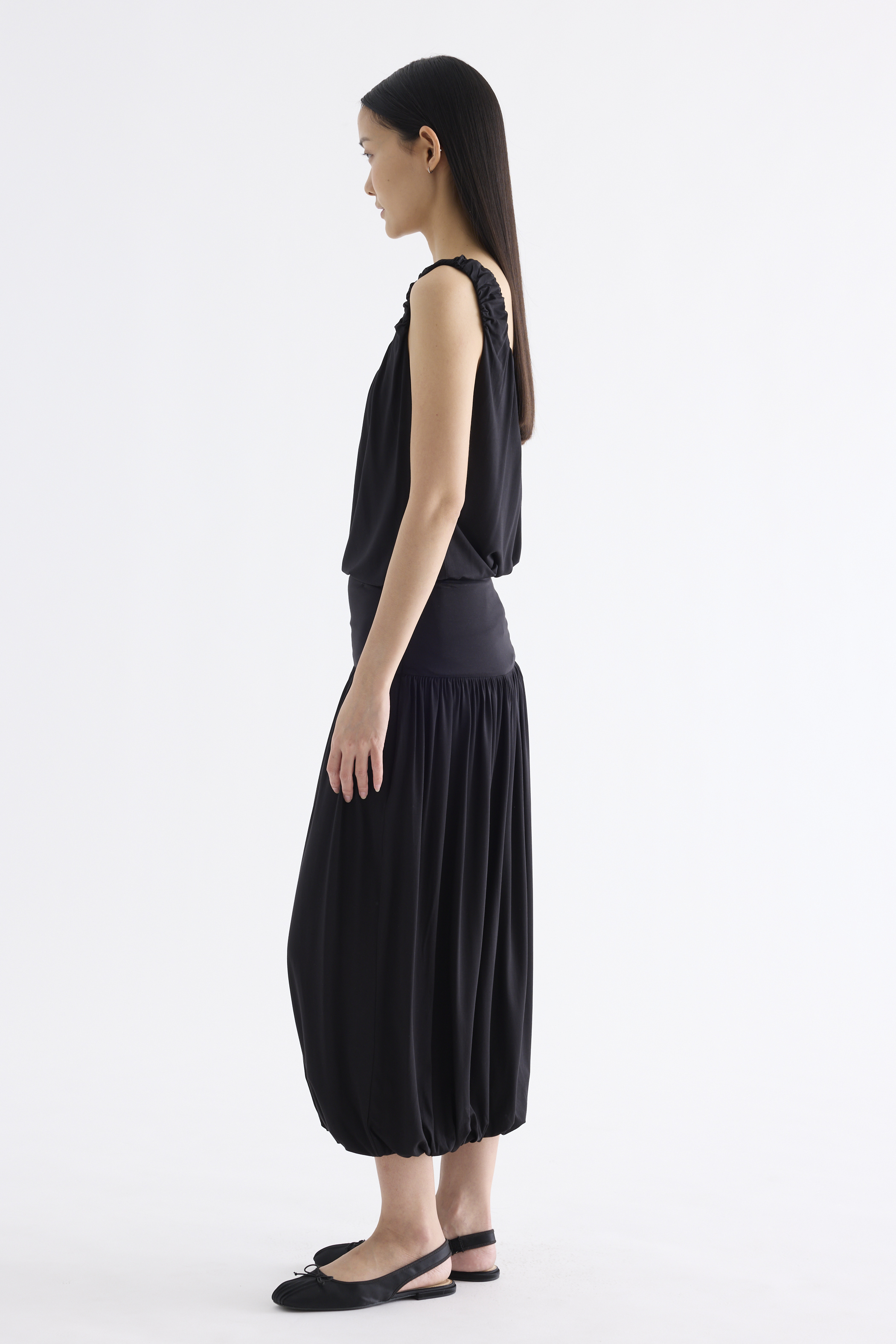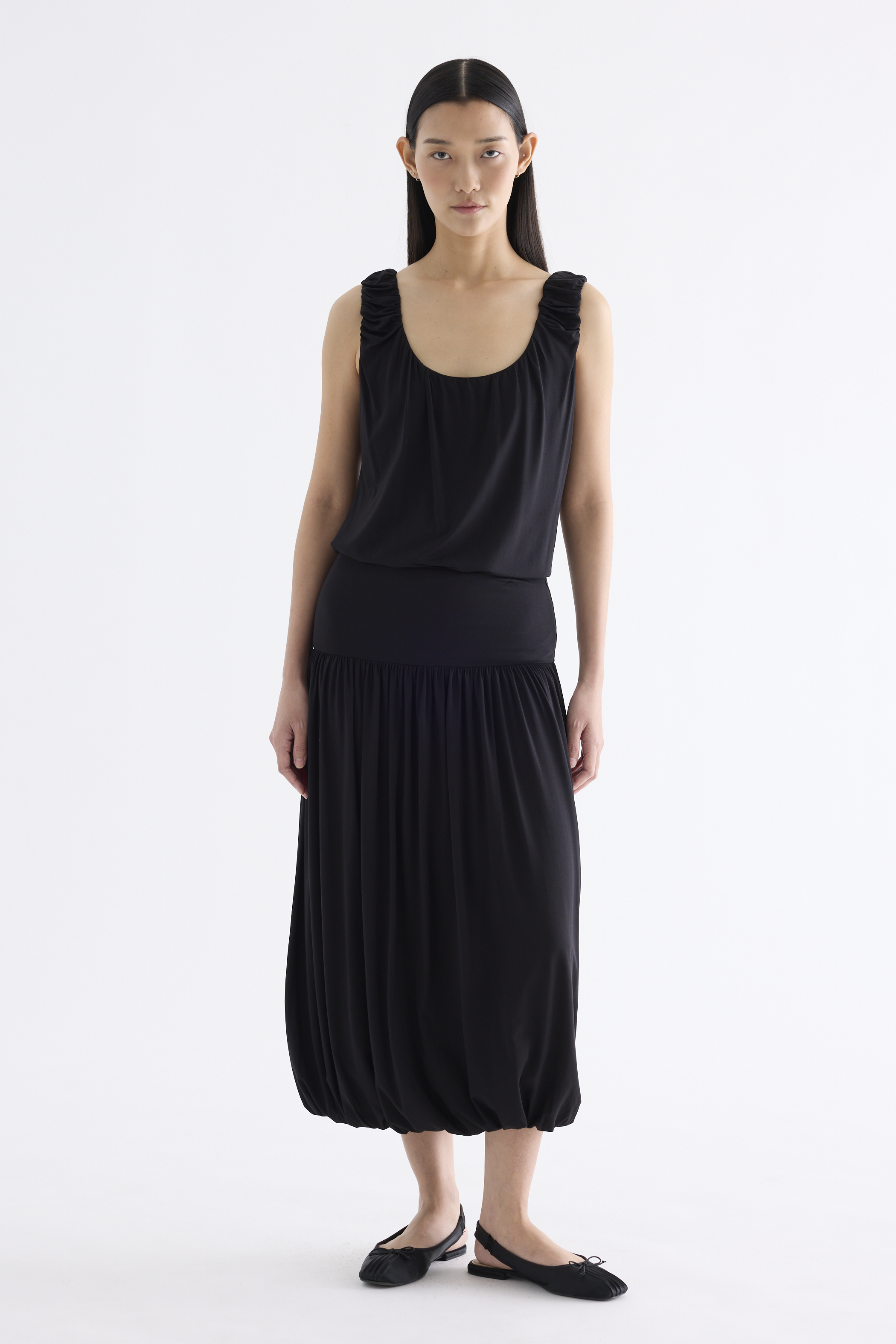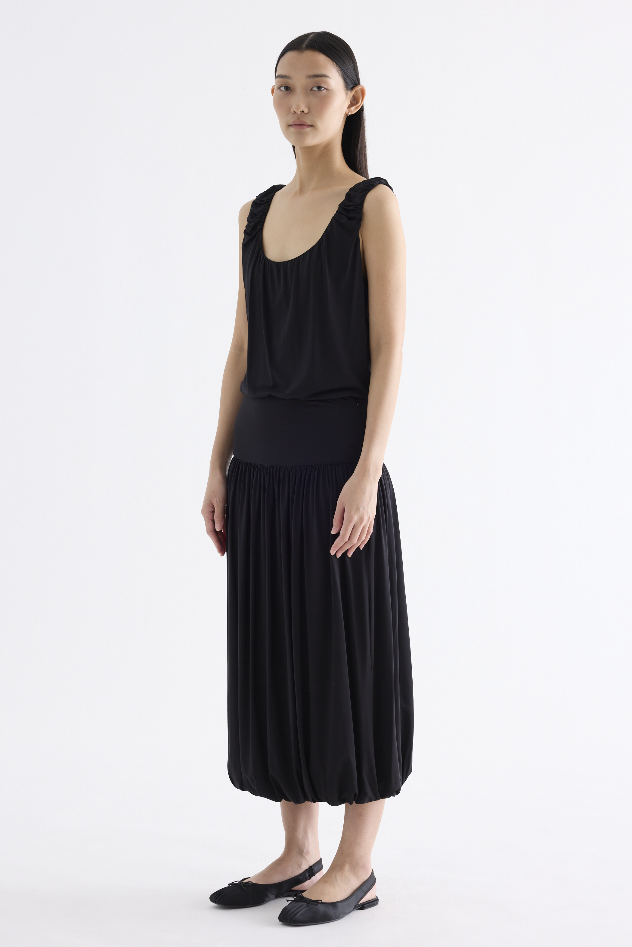 Volume, up. Made from smooth and stretchy fabric, this midi skirt features an extended waist panel and a gathered silhouette with a bubble hem. Worn in a relaxed fit with a size zip closure.