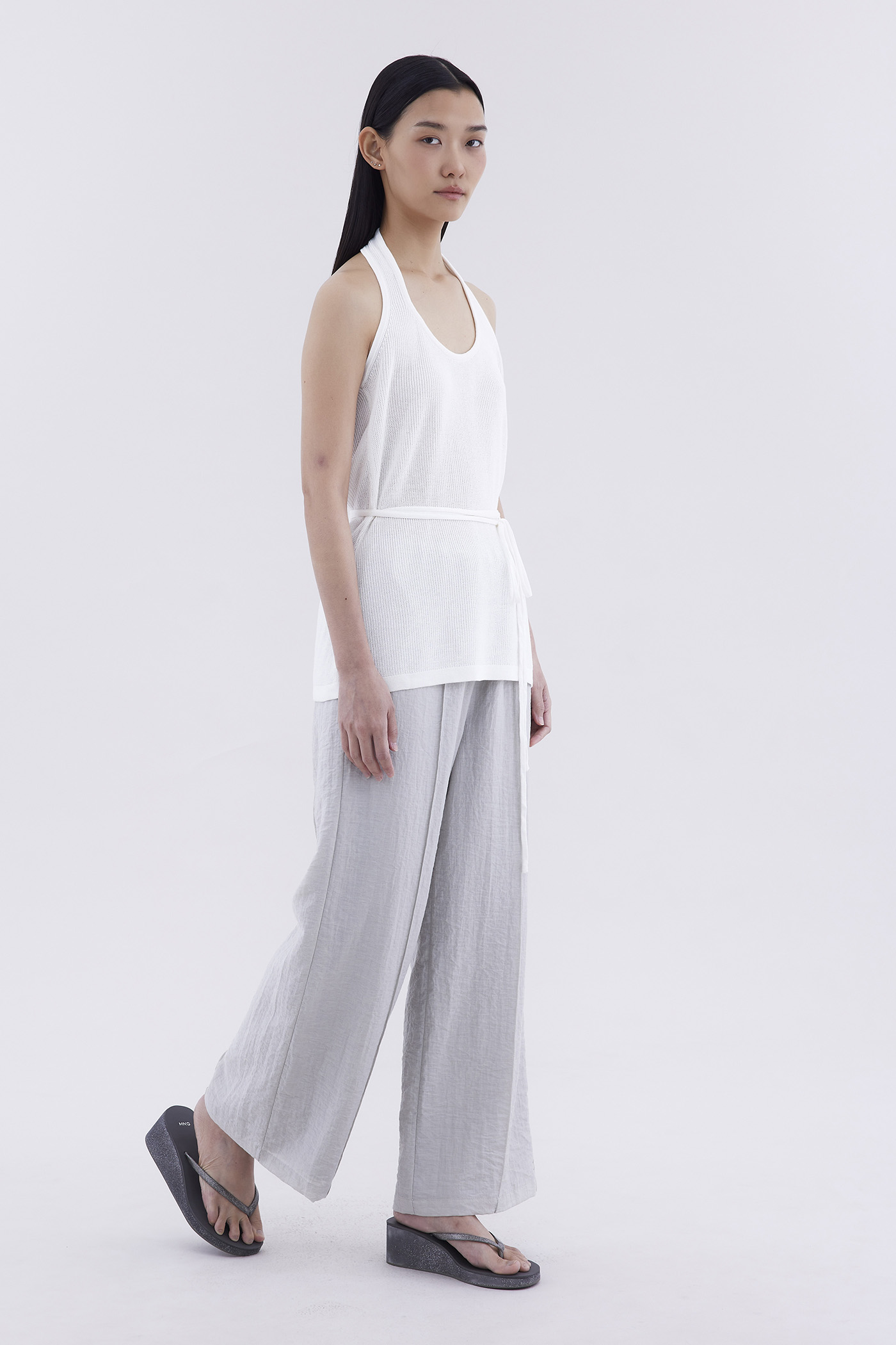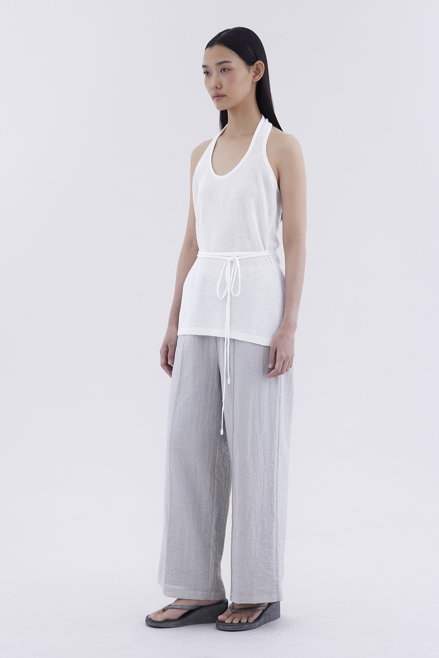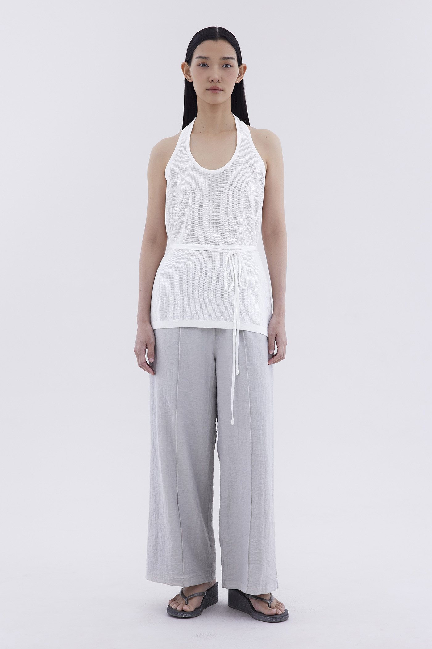Cool. Made from light and airy knit, this longline top features a halter neckline, an open back and an attached waist tie-strap. Worn in a slim fit.