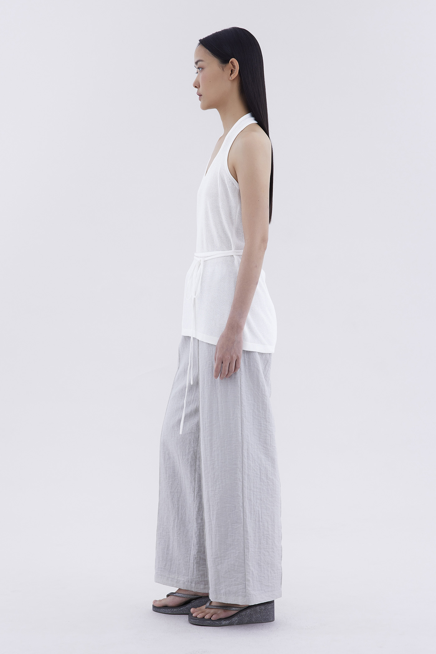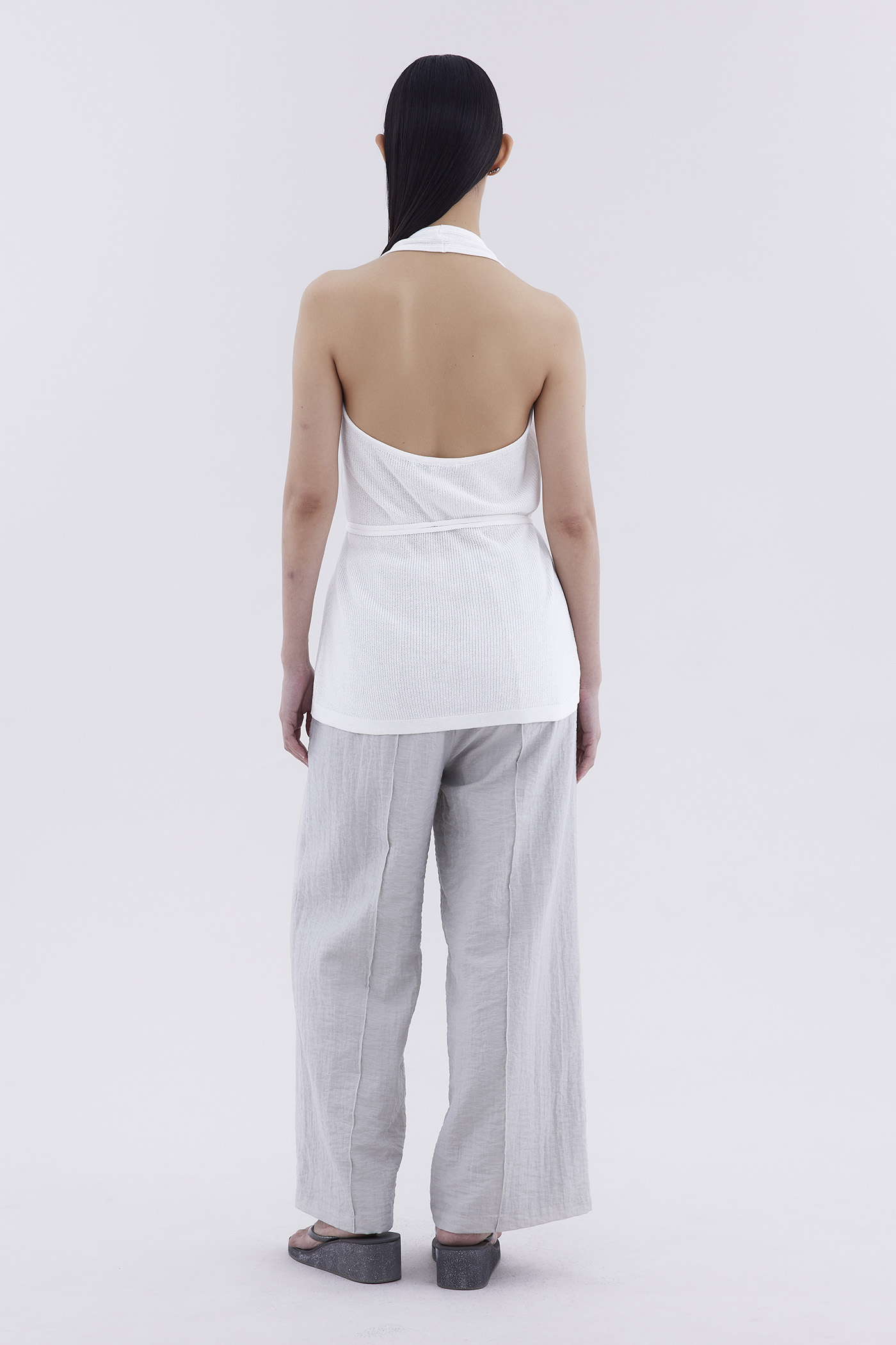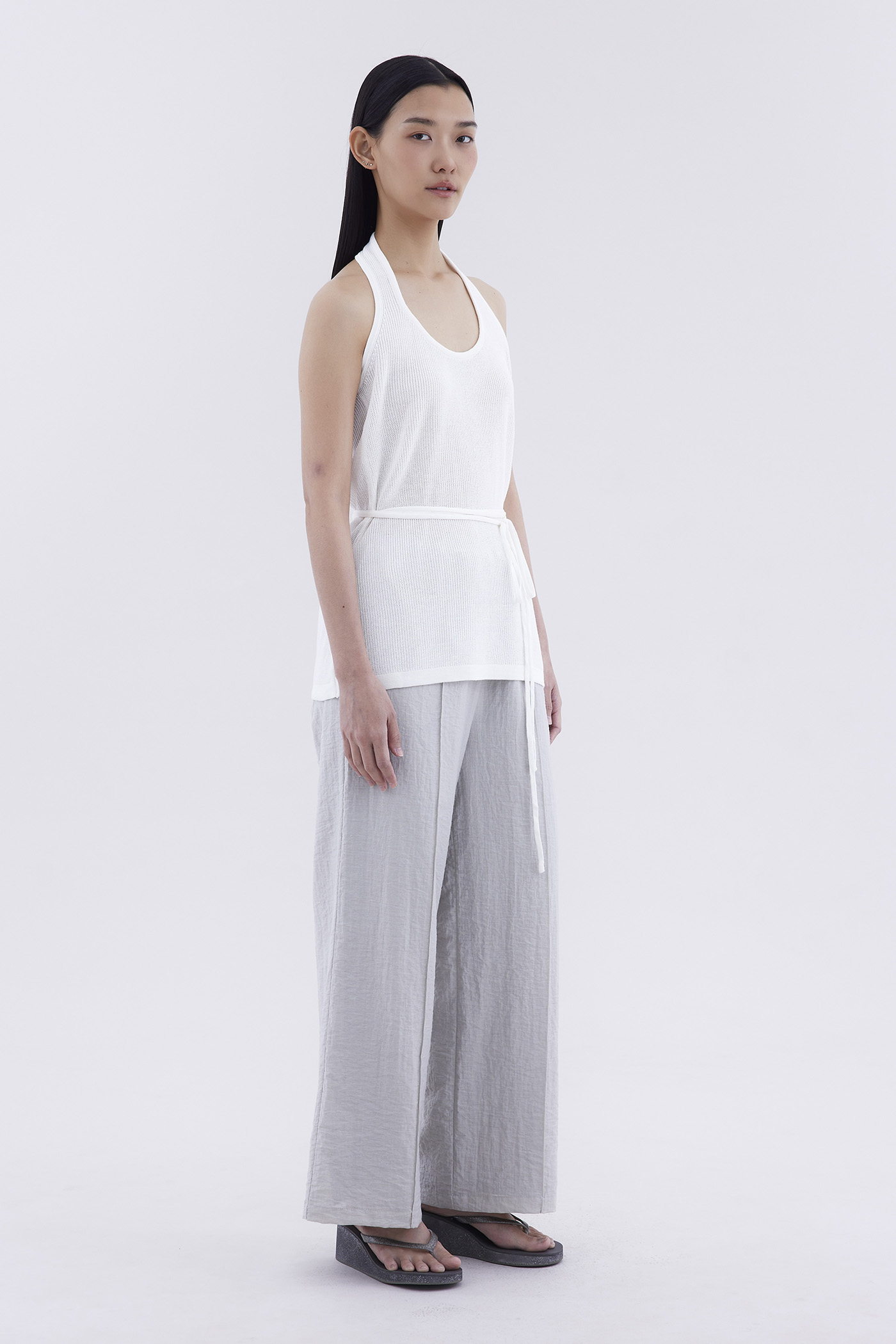 Cool. Made from light and airy knit, this longline top features a halter neckline, an open back and an attached waist tie-strap. Worn in a slim fit.