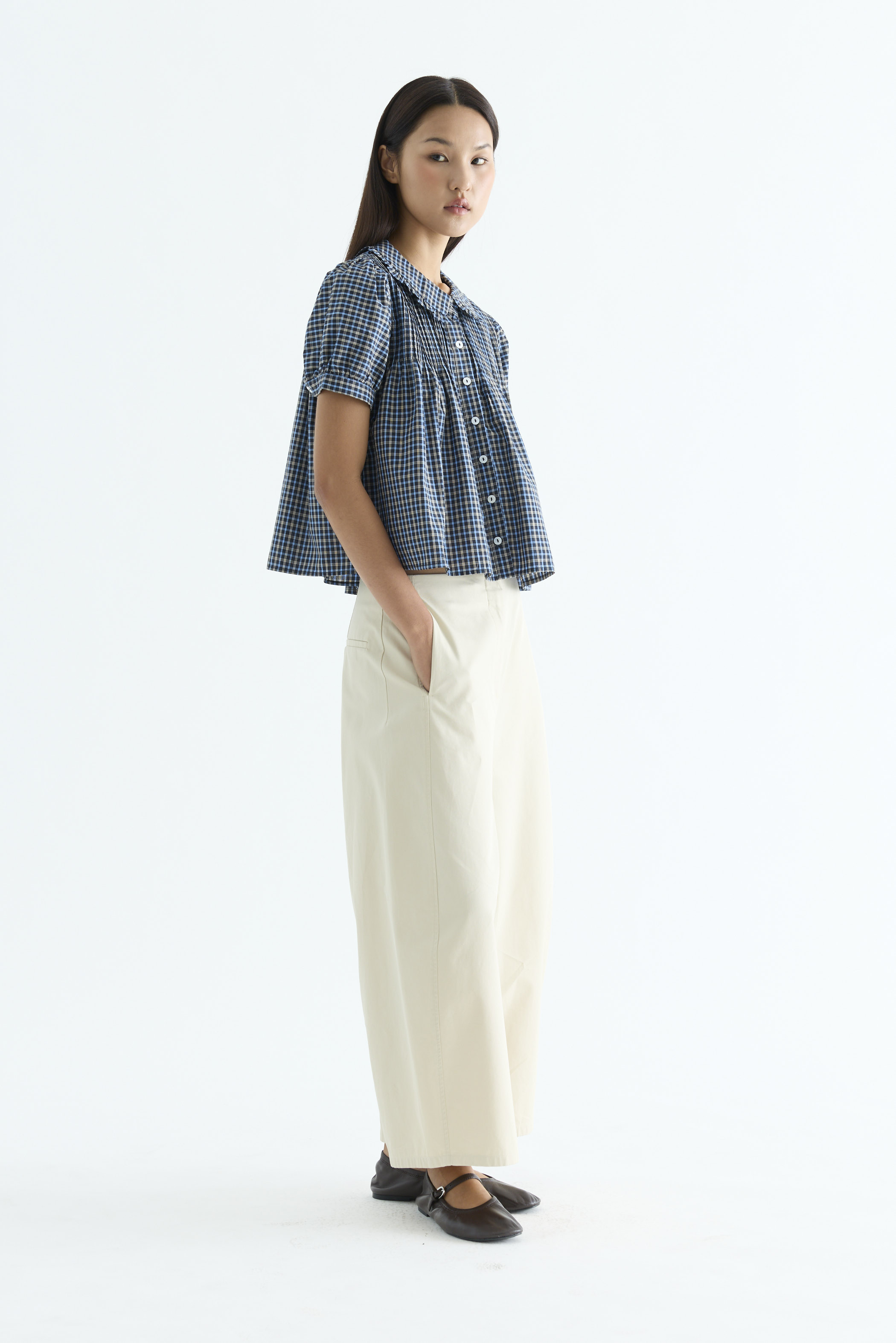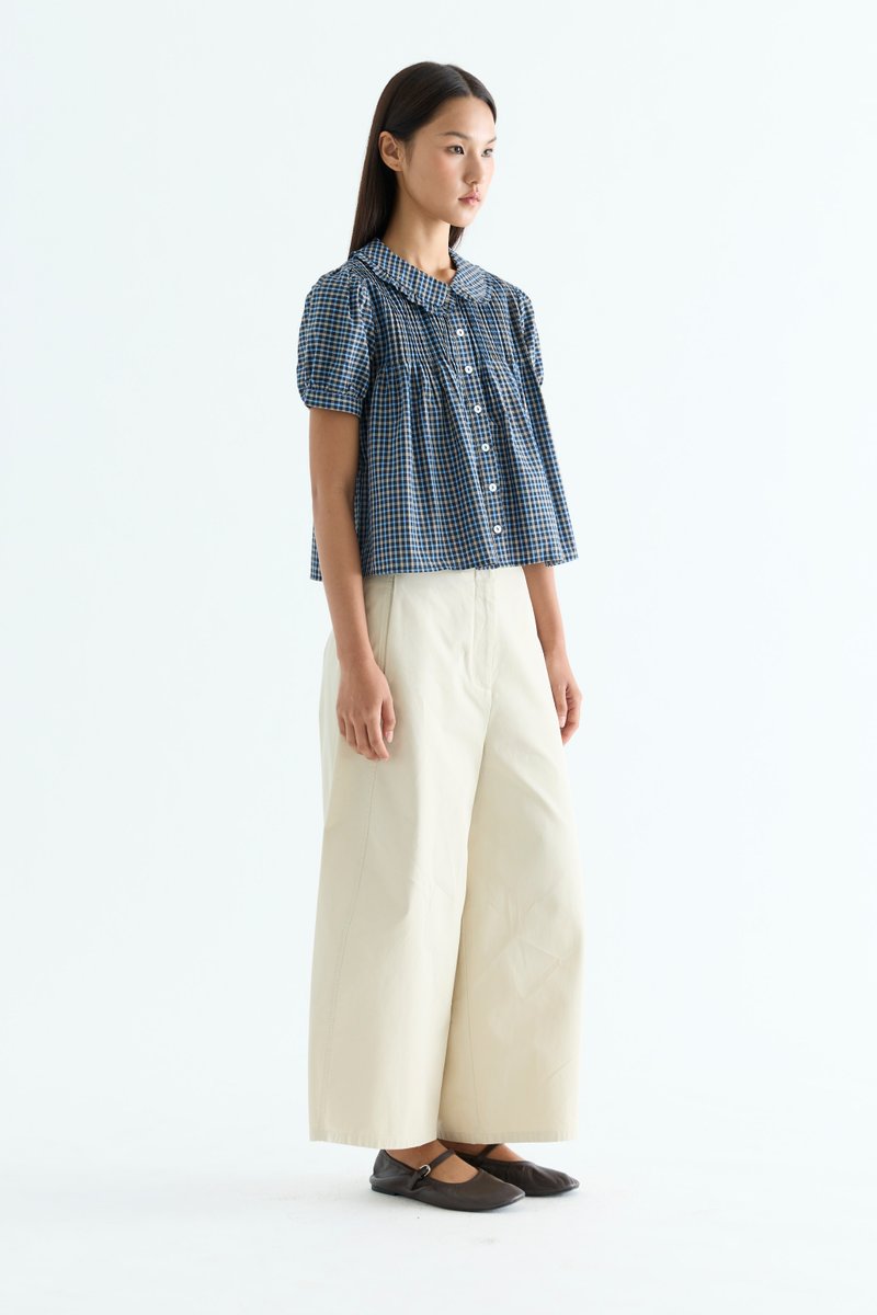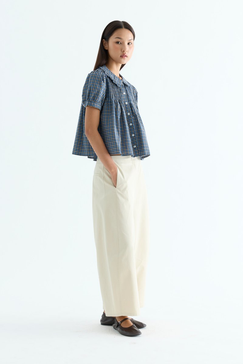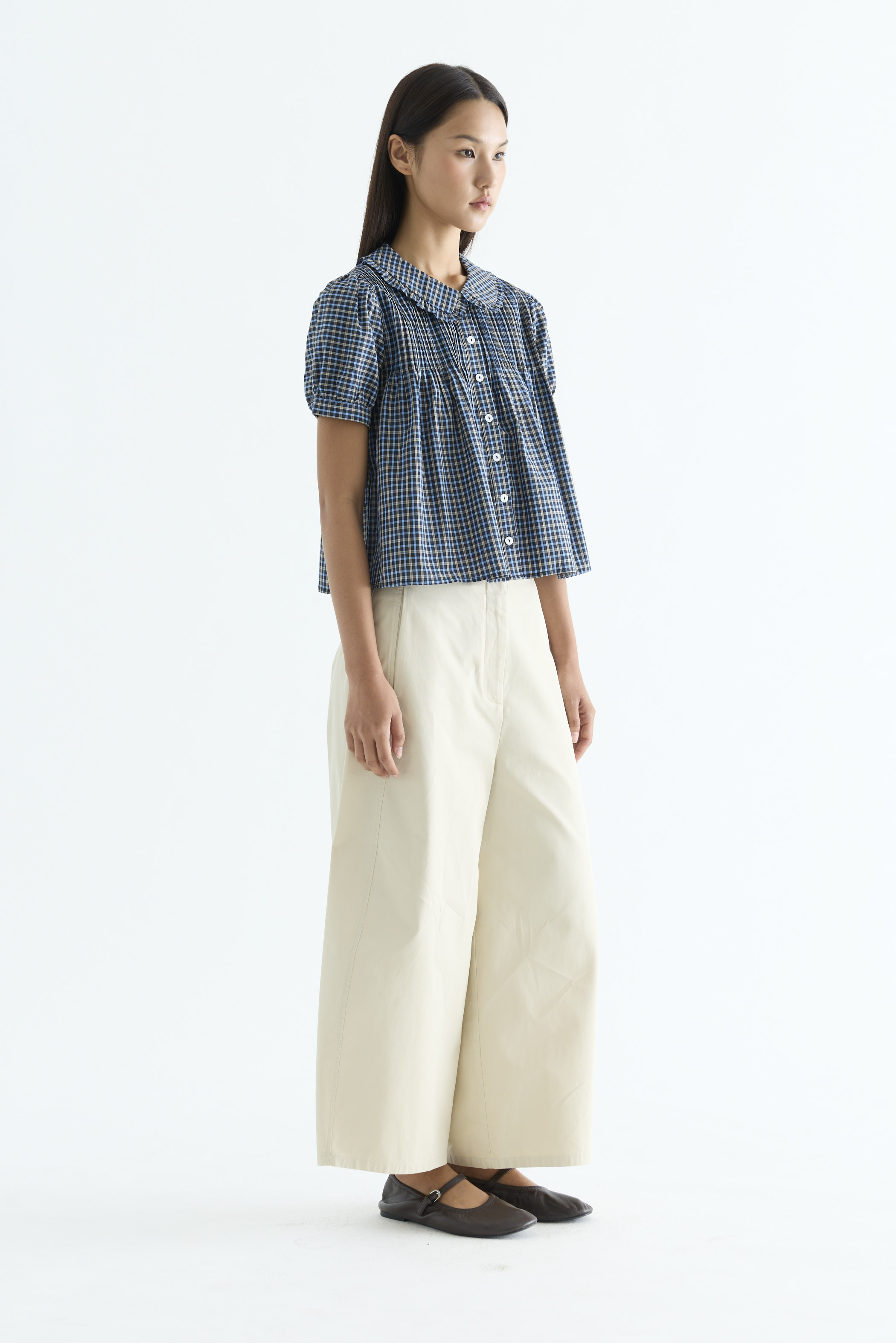 Volume up. Made from crisp and softly structured cotton, this shirt features a swishy, flared silhouette, pin-tuck pleats, a ruffle-trimmed collar, puffy short sleeves and a button-down front. Worn in a relaxed fit.