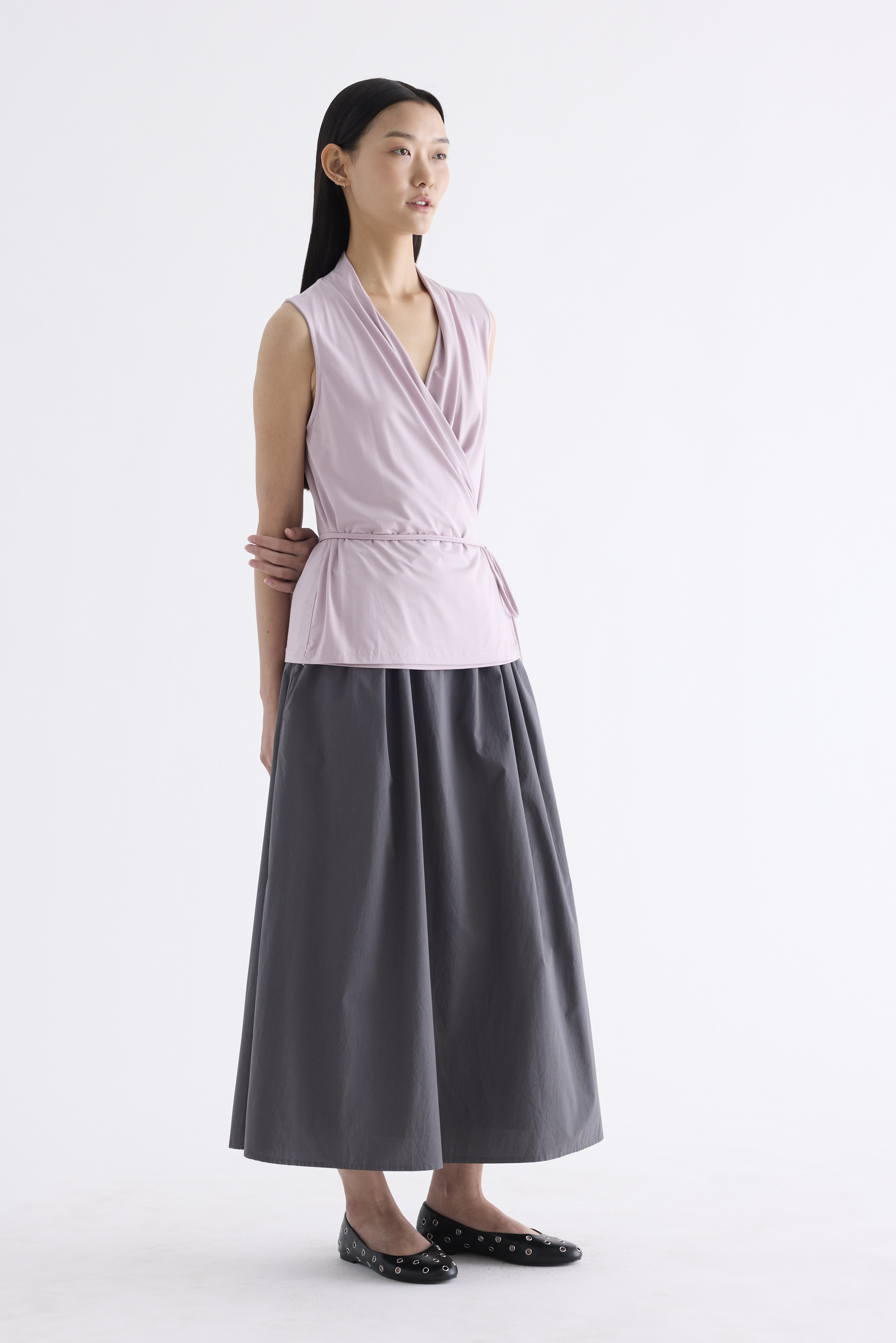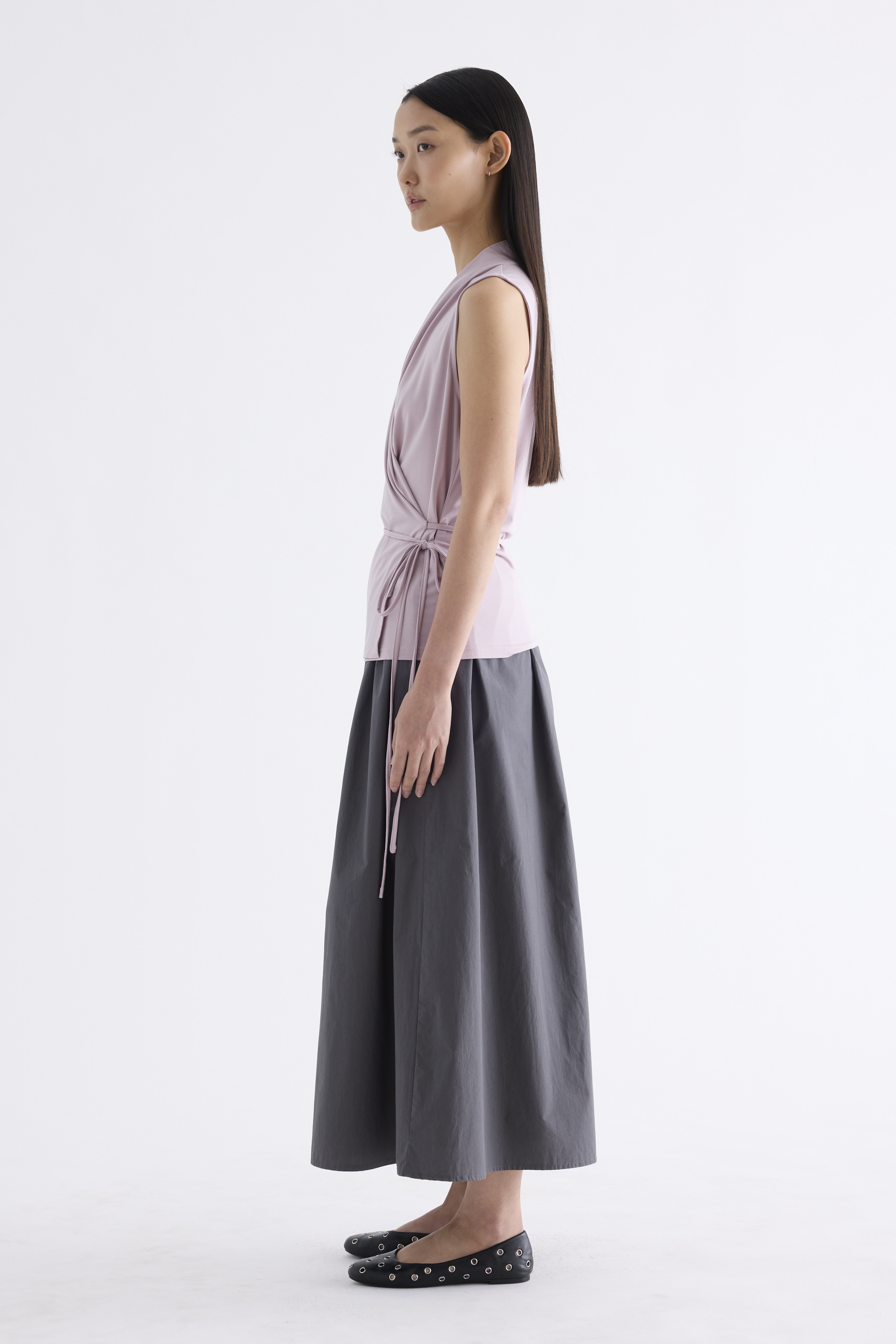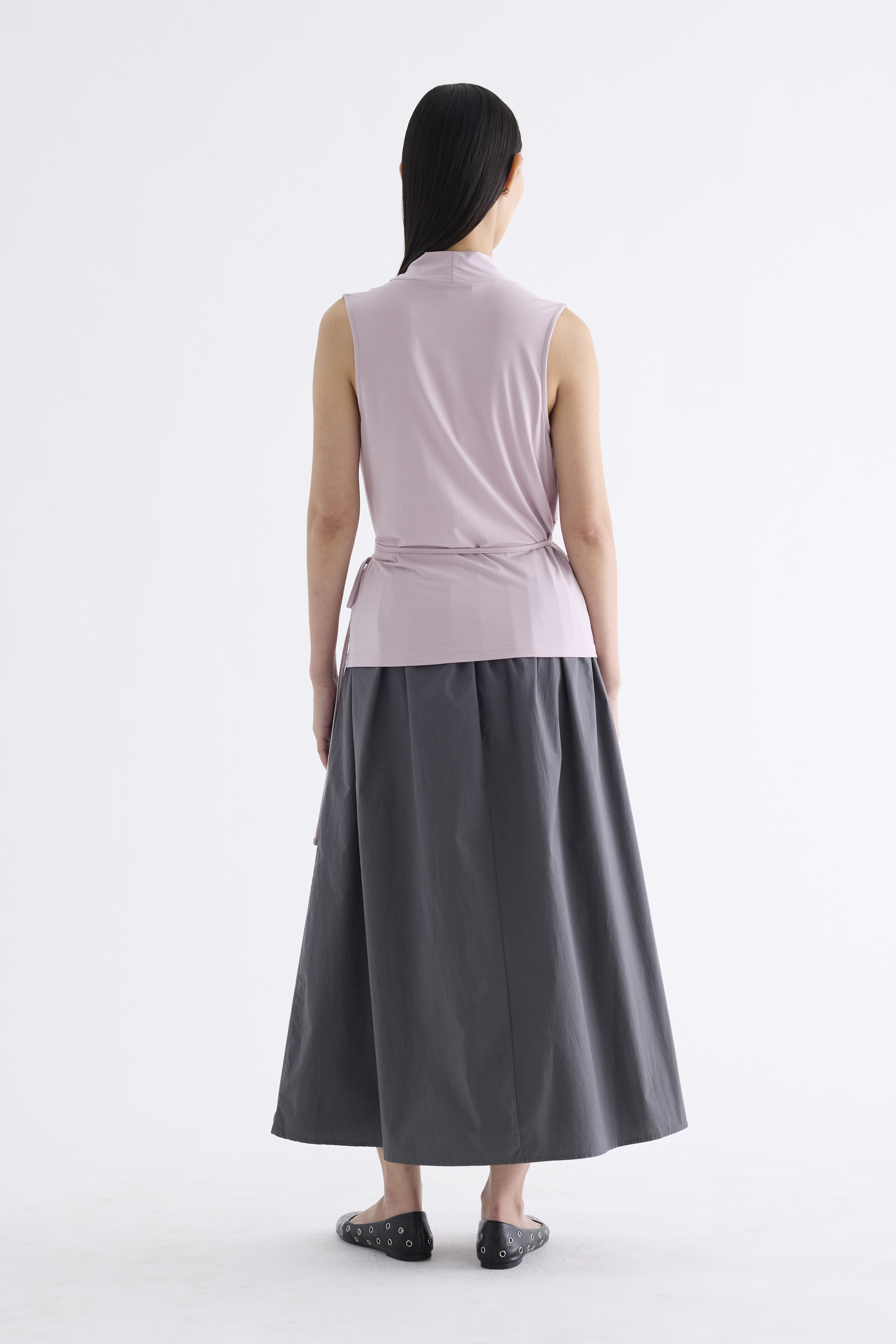 Fluid forms. Made from smooth and stretchy fabric, this sleeveless top features a wrapover neckline and waist tie-strap. Worn in a relaxed fit.