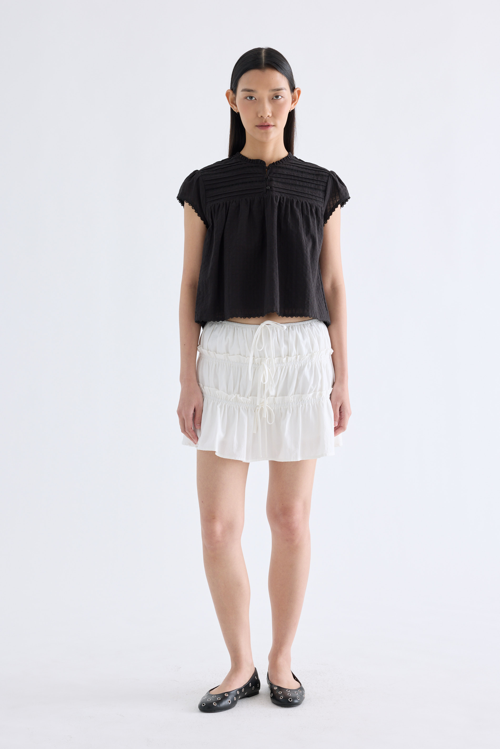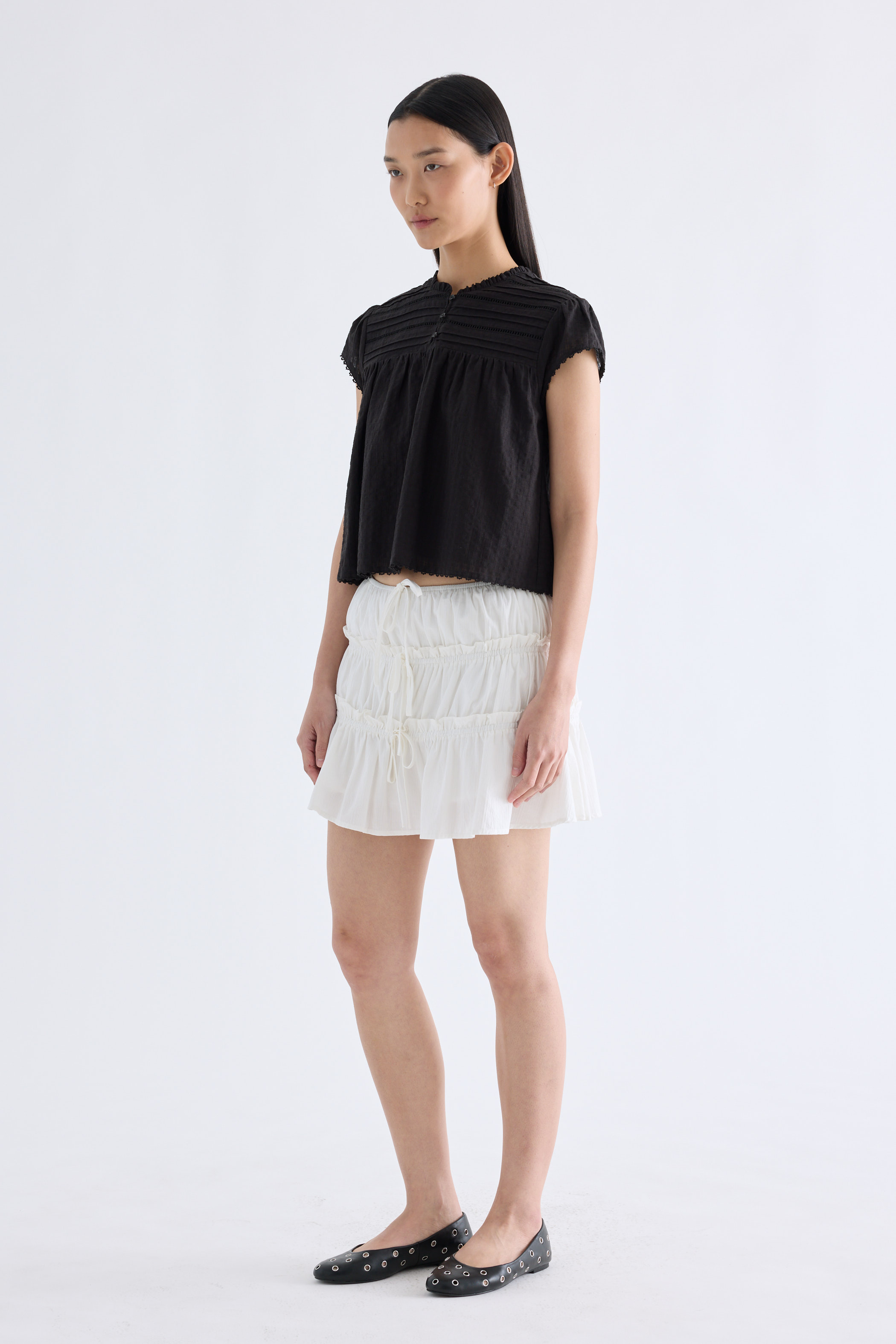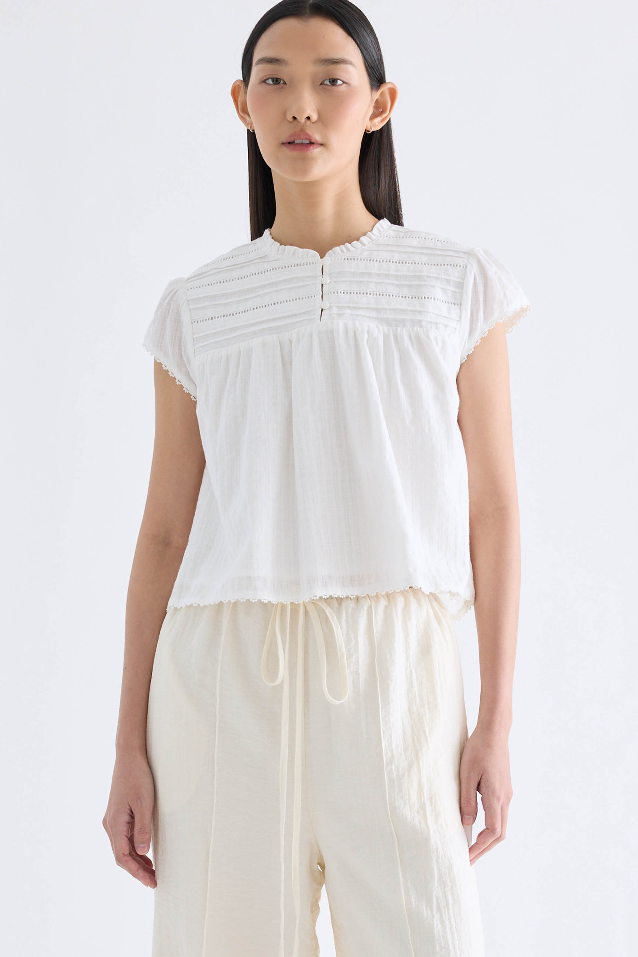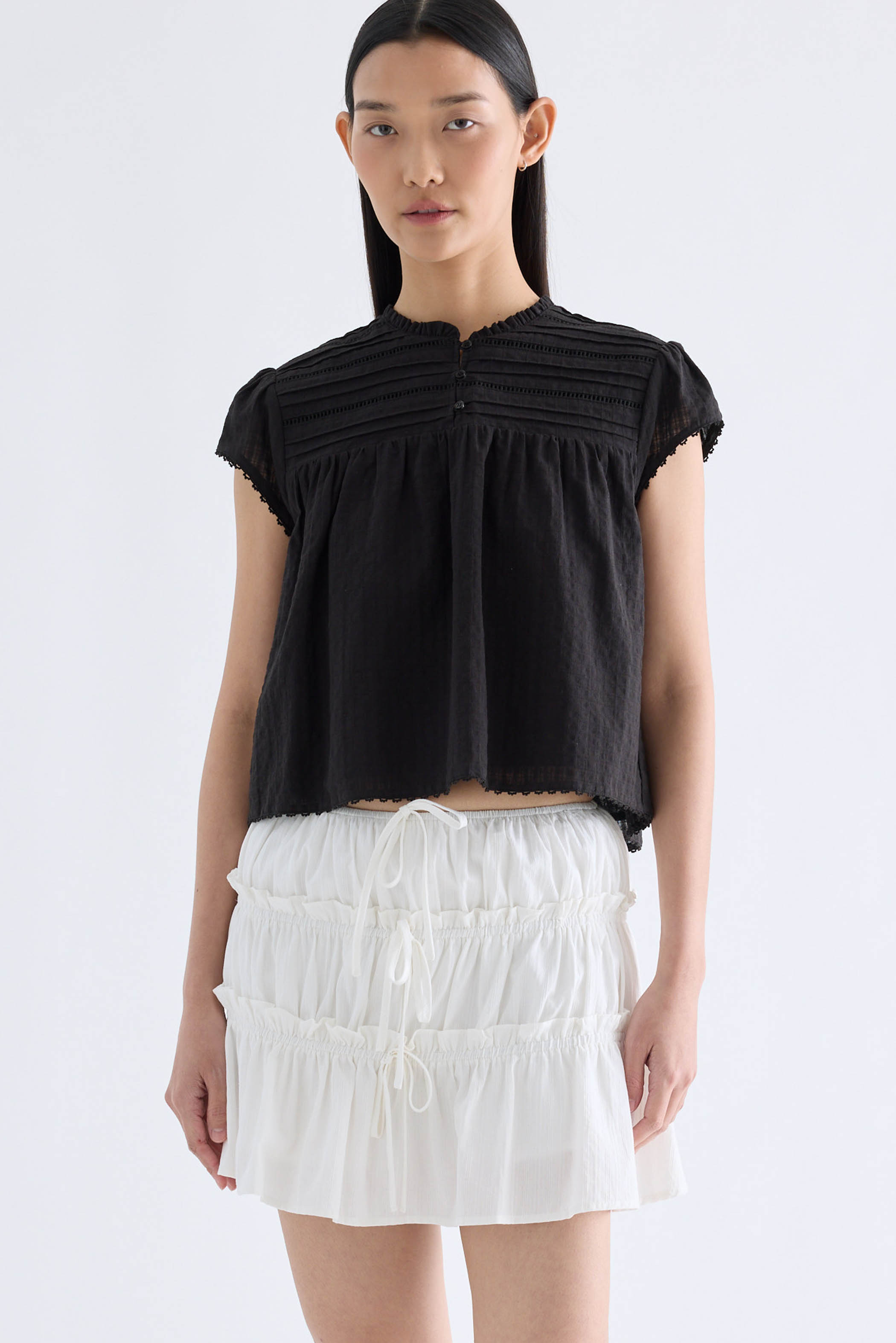 Summer’s best. Cut from airy and softly structured seersucker cotton, this top features a round ruffle-trimmed neckline, lace-trimmed cap sleeves, top pleats with lace accents, front loop buttons and a lace-trimmed hemline.