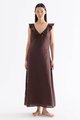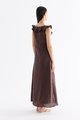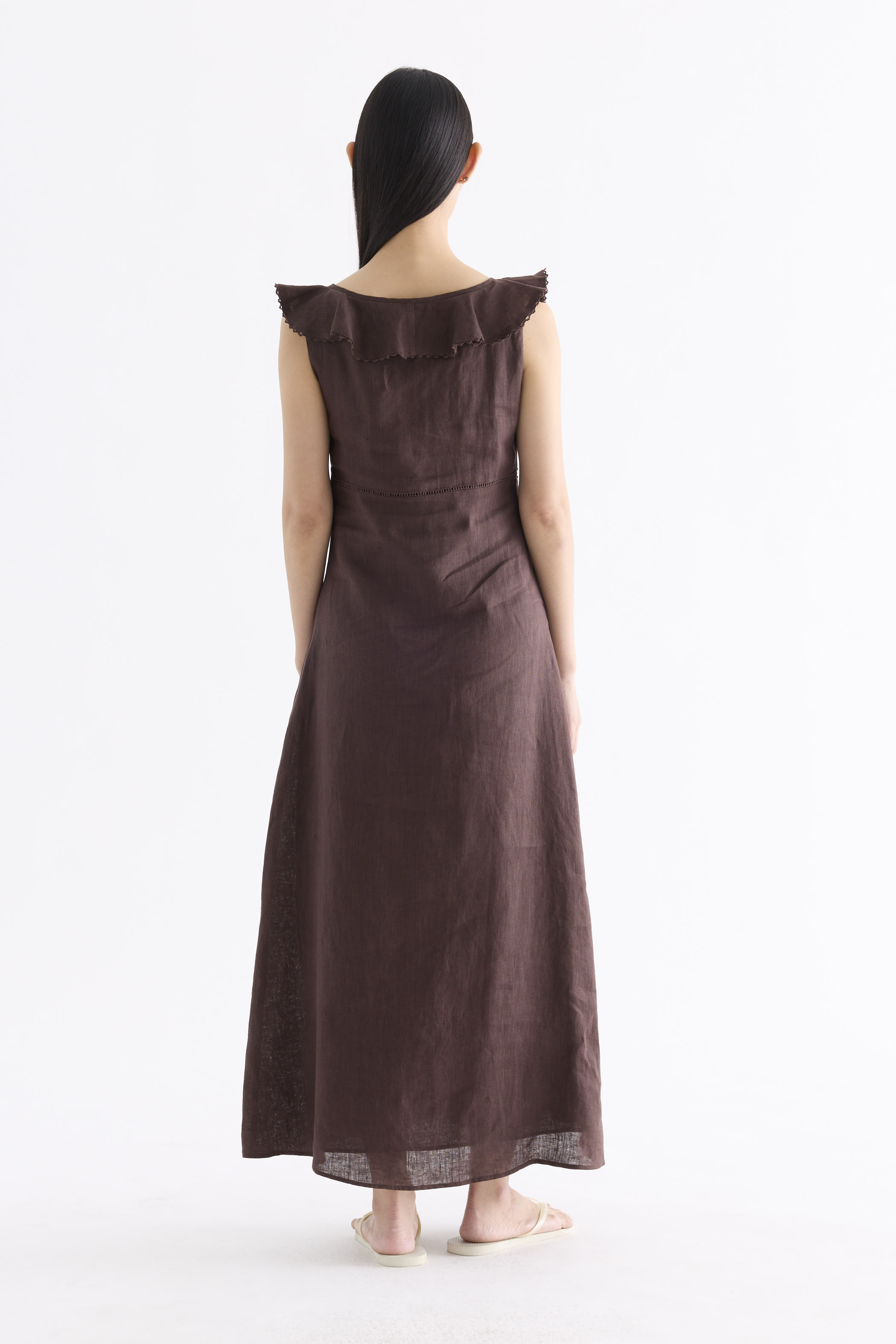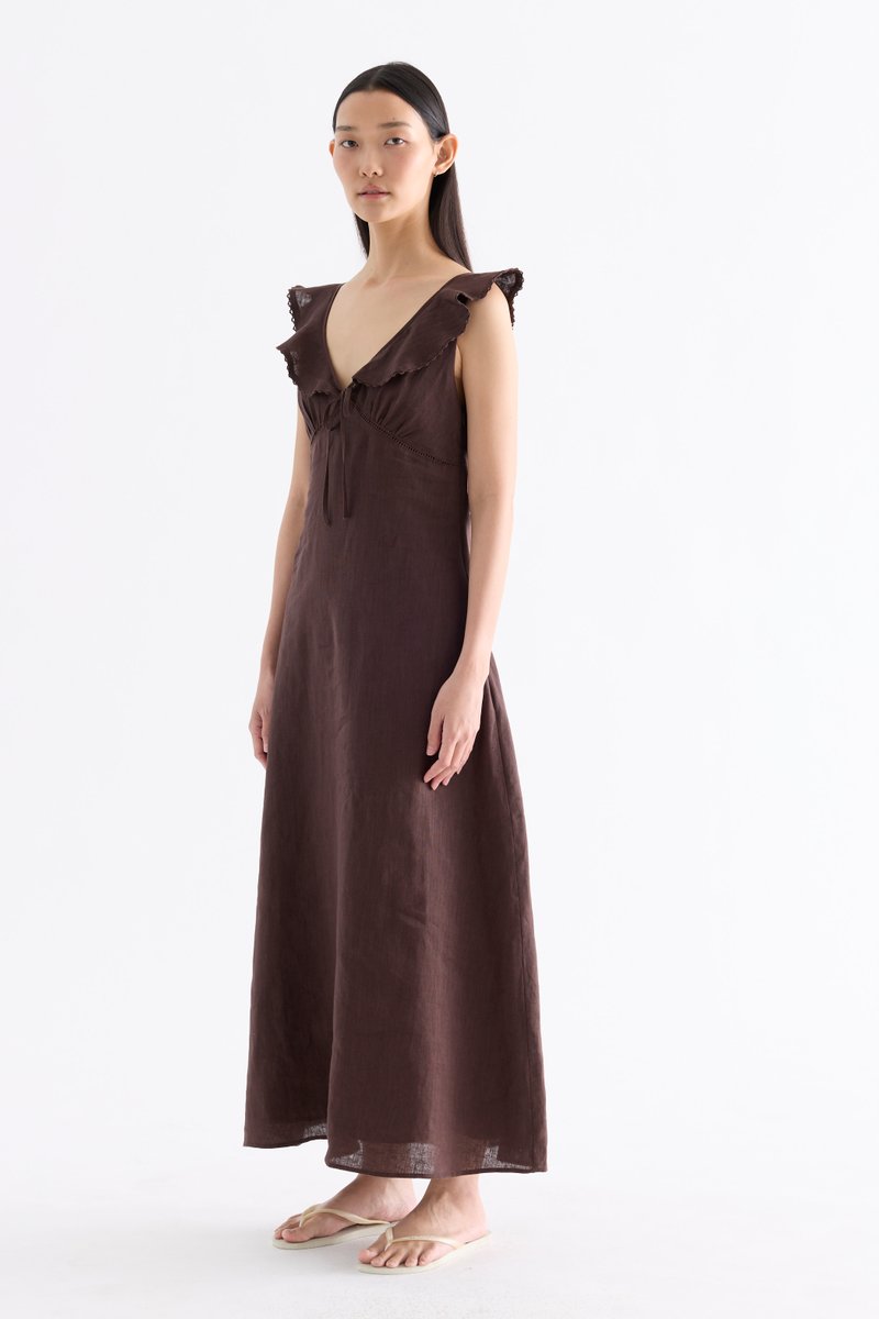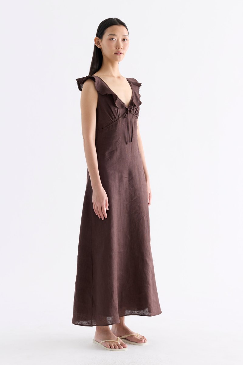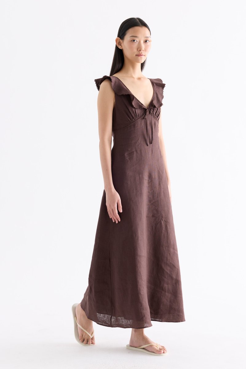 Statement collars. Cut from airy and gently tailored 100% linen, this sleeveless maxi dress features a V-neckline with ruffled and oversized lace-trimmed collars, a ruched bust with ladder lace details and a front tie-strap. Fits slim with a side zip closure.