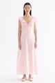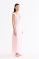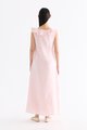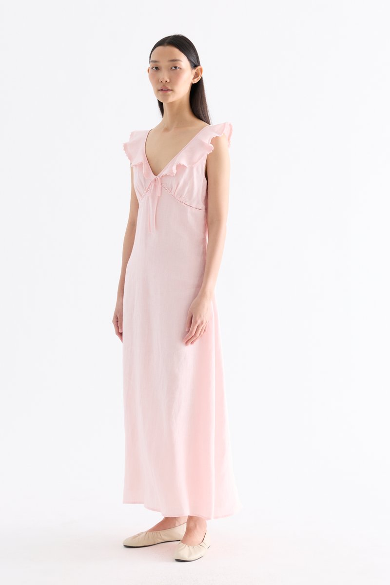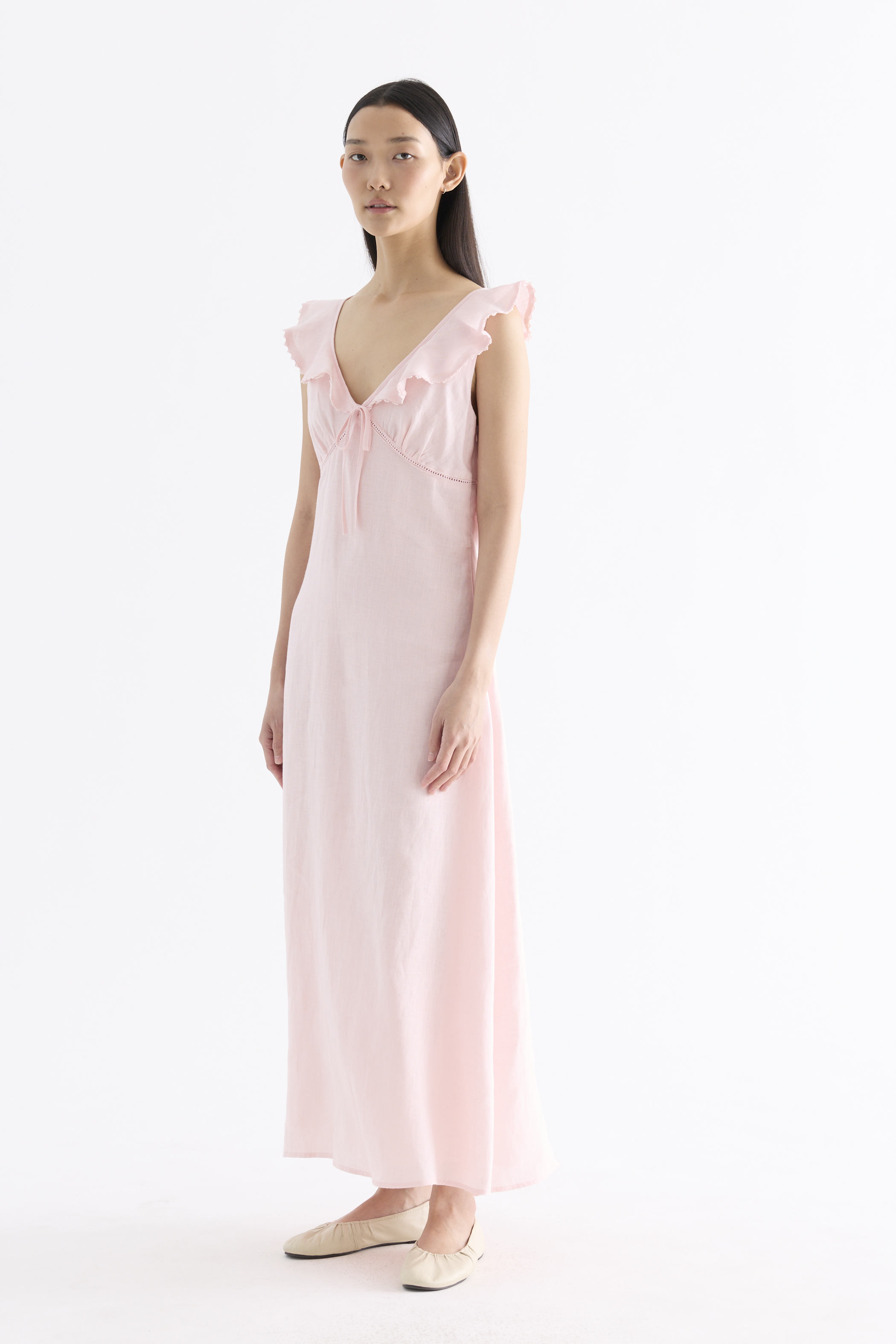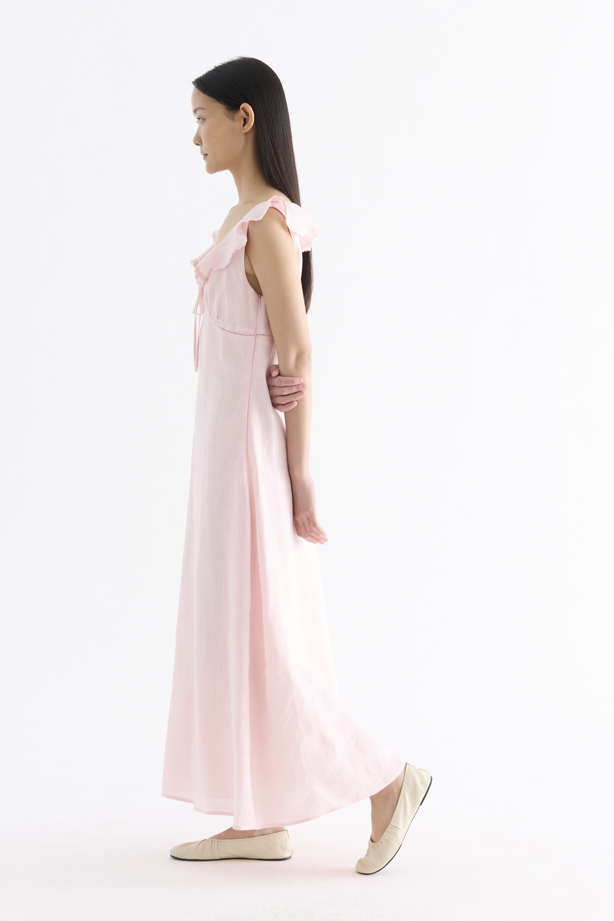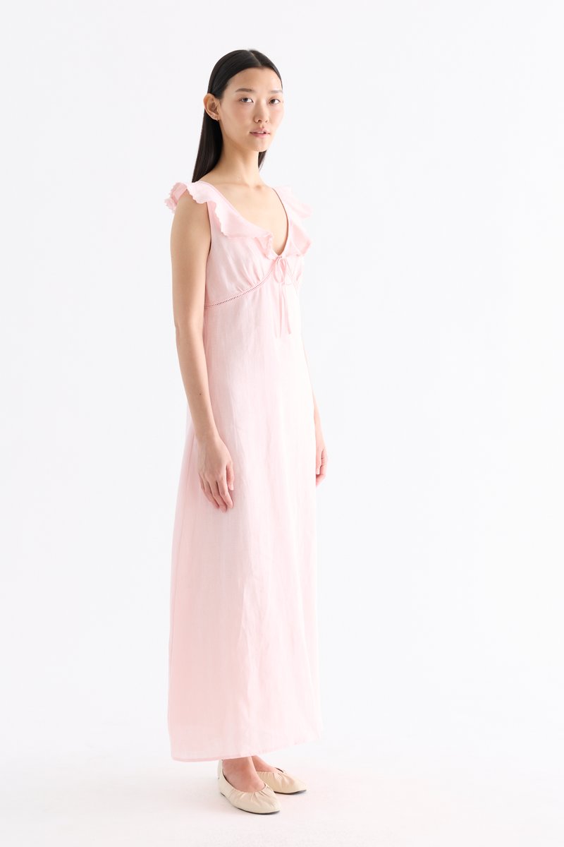 Statement collars. Cut from airy and gently tailored 100% linen, this sleeveless maxi dress features a V-neckline with ruffled and oversized lace-trimmed collars, a ruched bust with ladder lace details and a front tie-strap. Fits slim with a side zip closure.