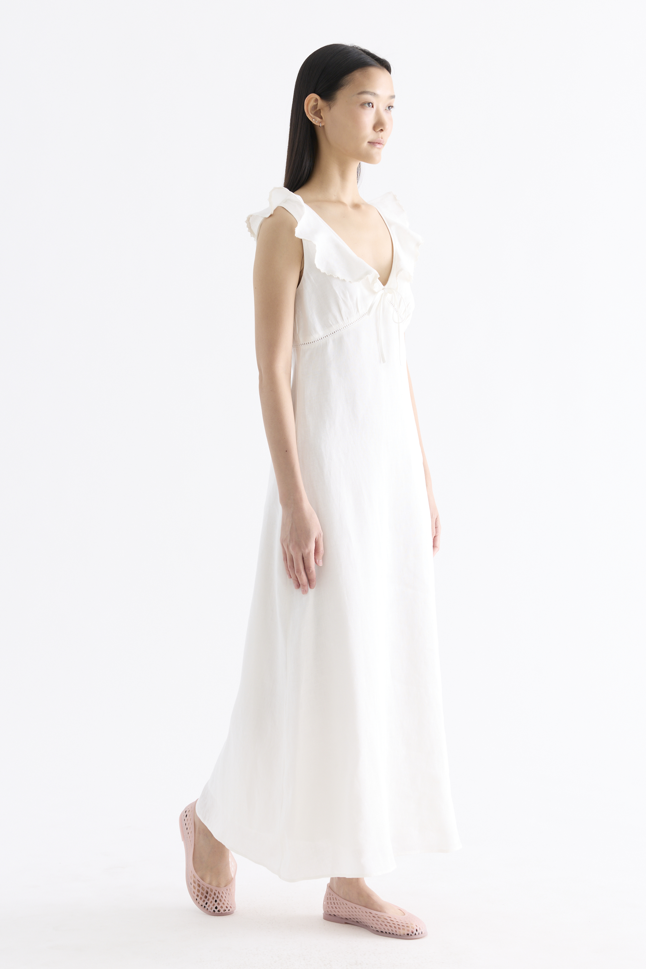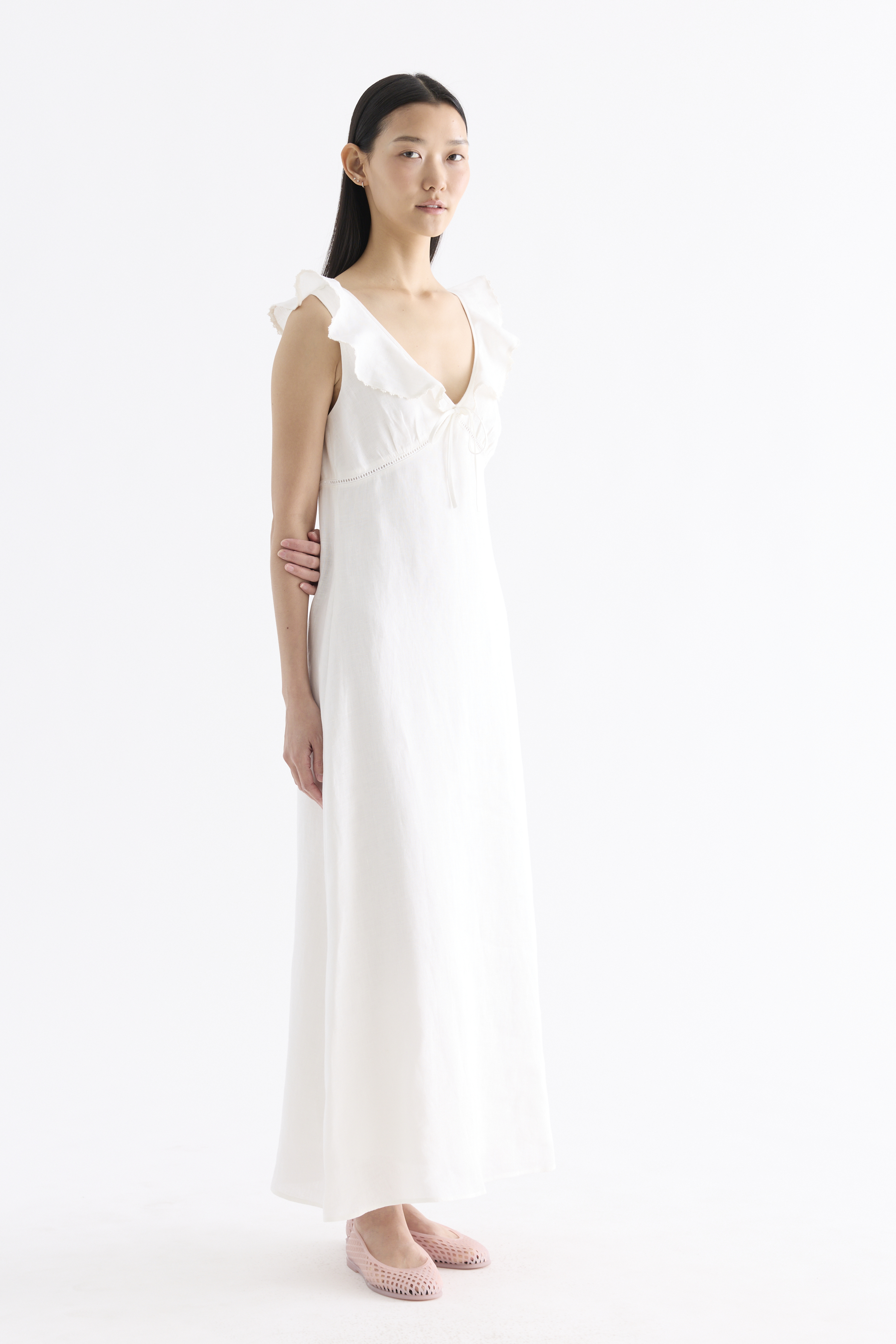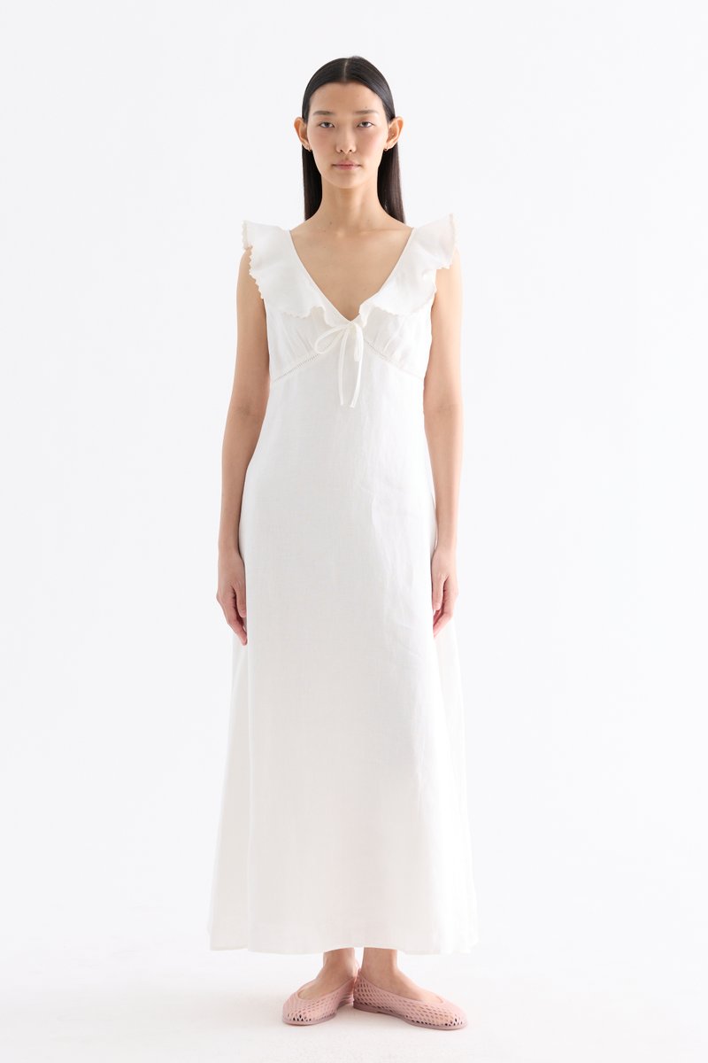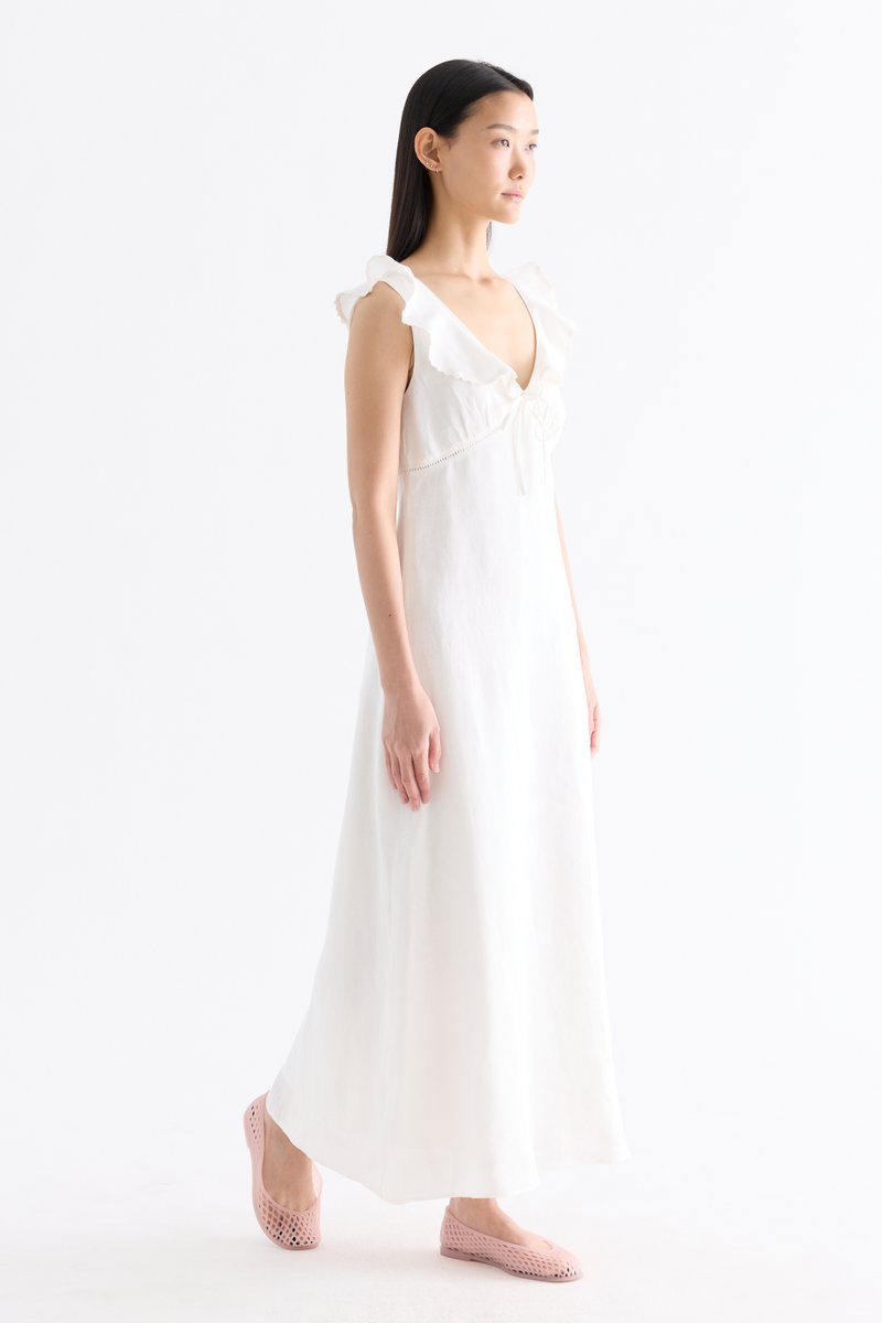 Statement collars. Cut from airy and gently tailored 100% linen, this sleeveless maxi dress features a V-neckline with ruffled and oversized lace-trimmed collars, a ruched bust with ladder lace details and a front tie-strap. Fits slim with a side zip closure.