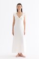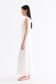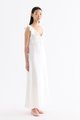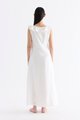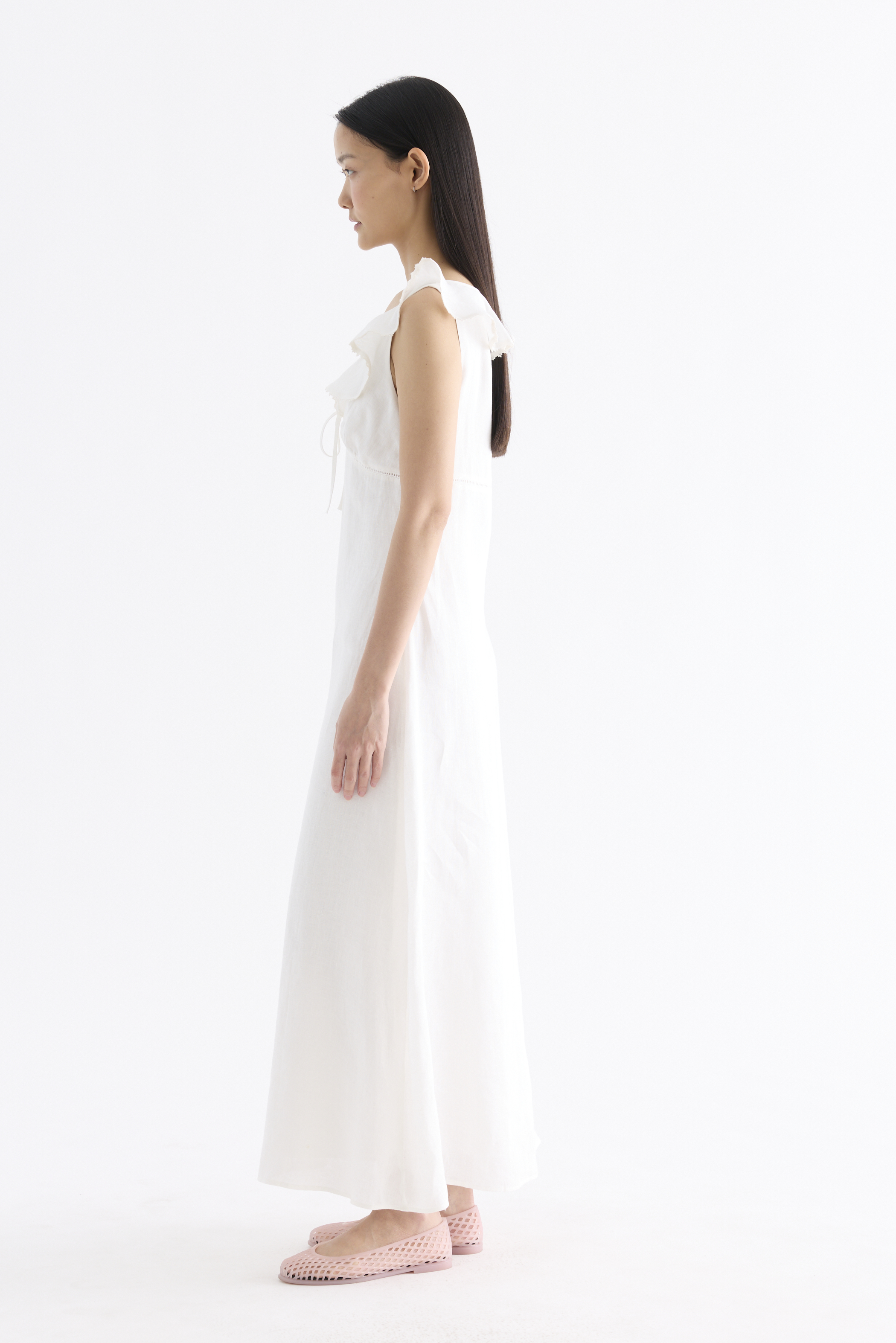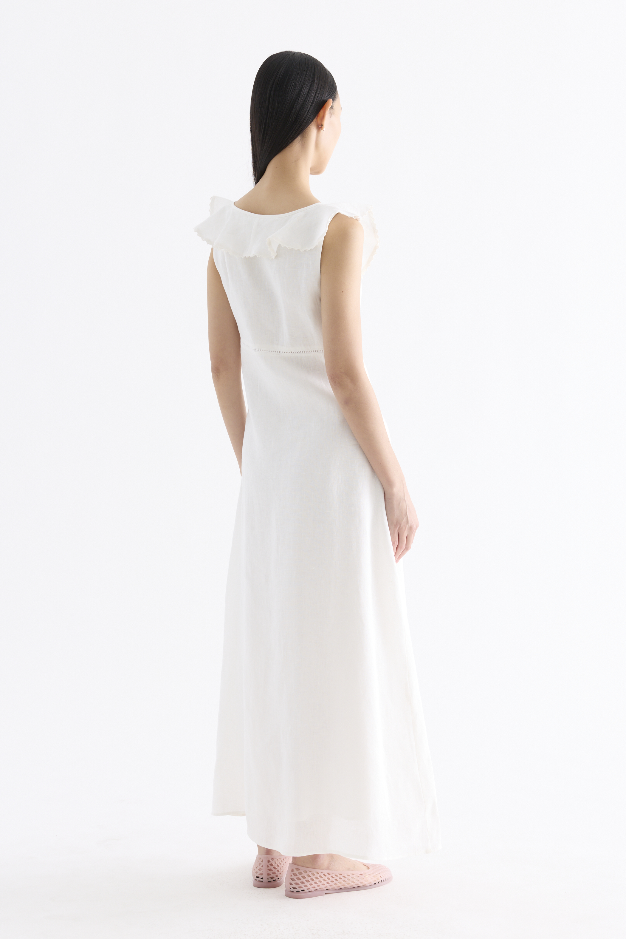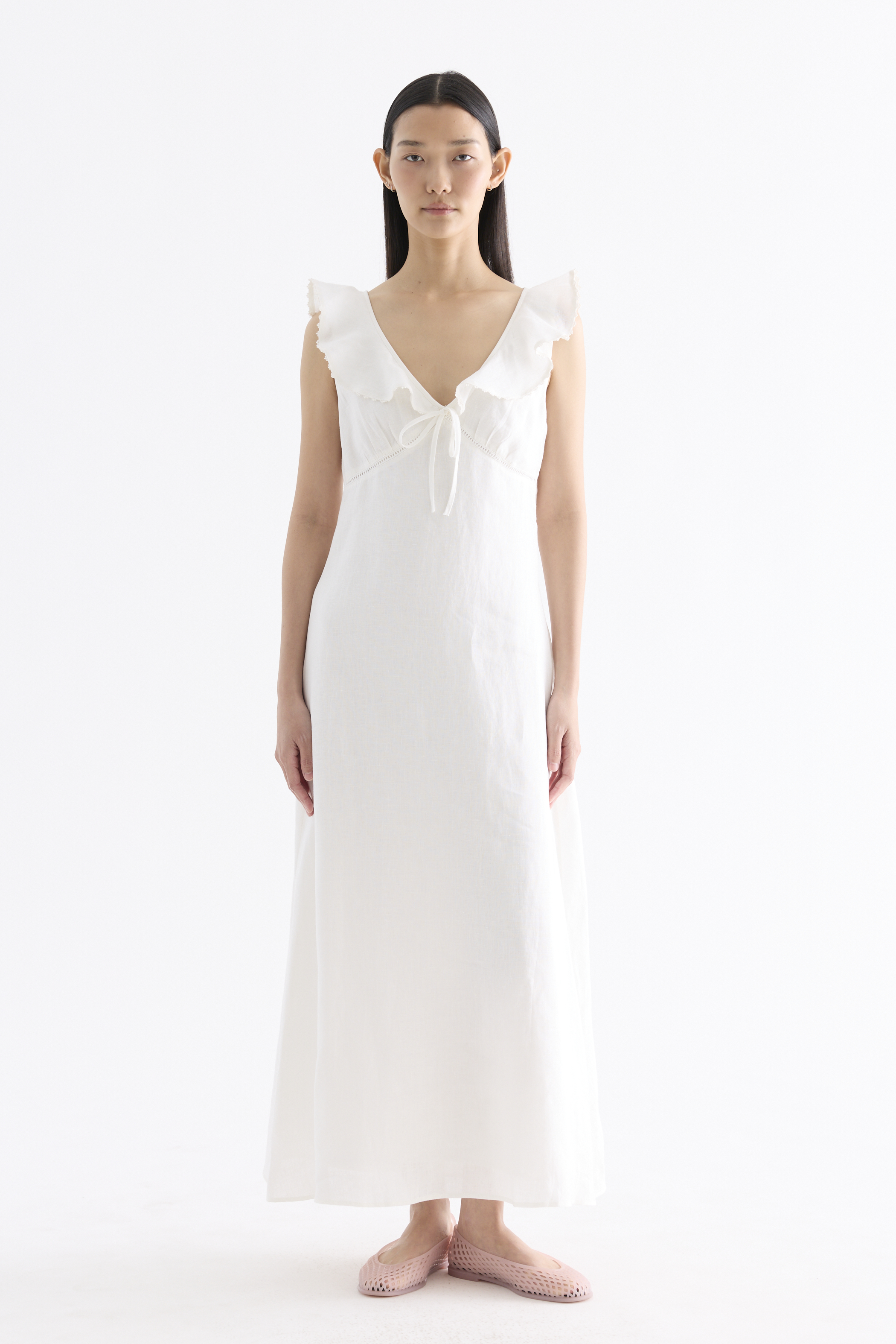 Statement collars. Cut from airy and gently tailored 100% linen, this sleeveless maxi dress features a V-neckline with ruffled and oversized lace-trimmed collars, a ruched bust with ladder lace details and a front tie-strap. Fits slim with a side zip closure.