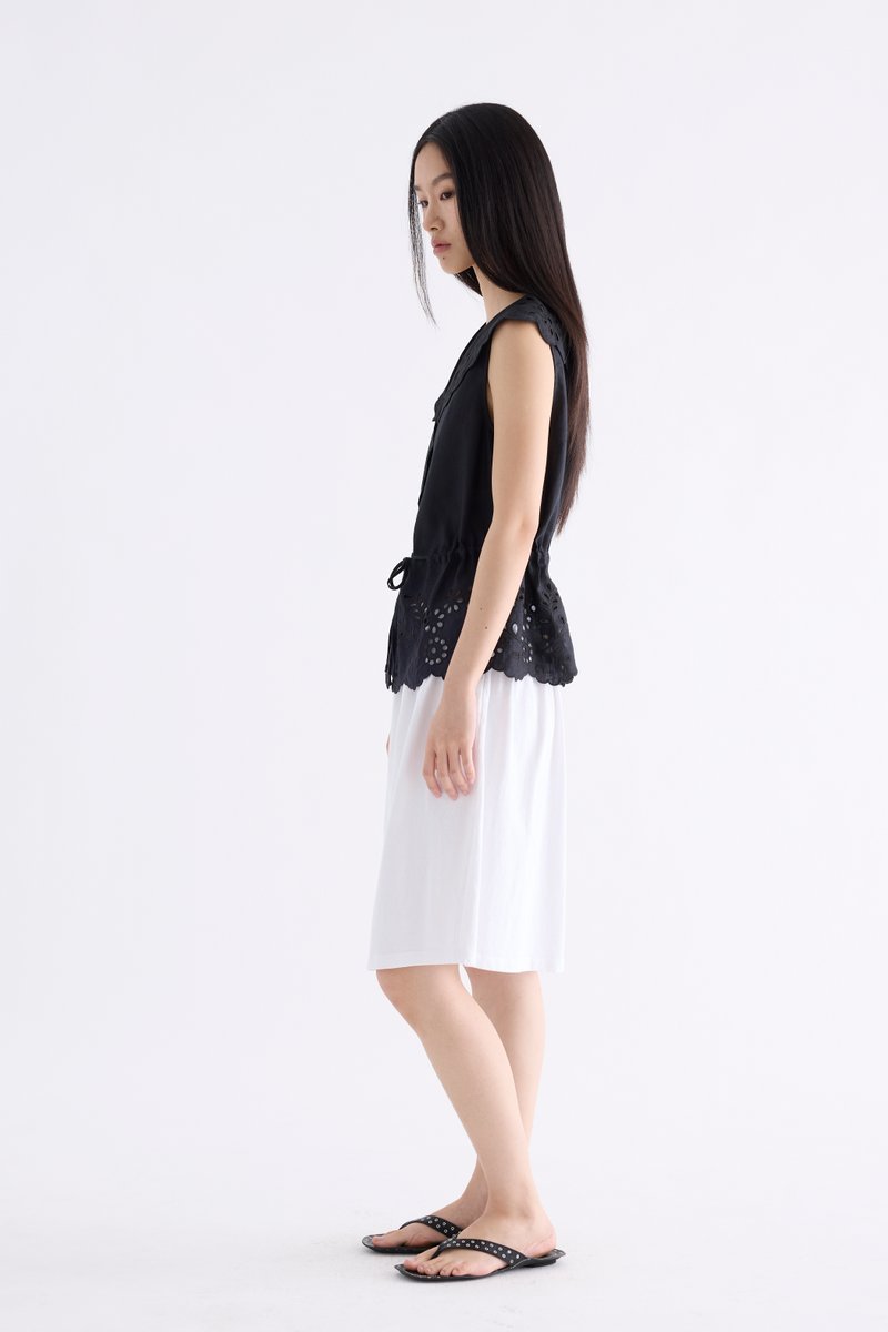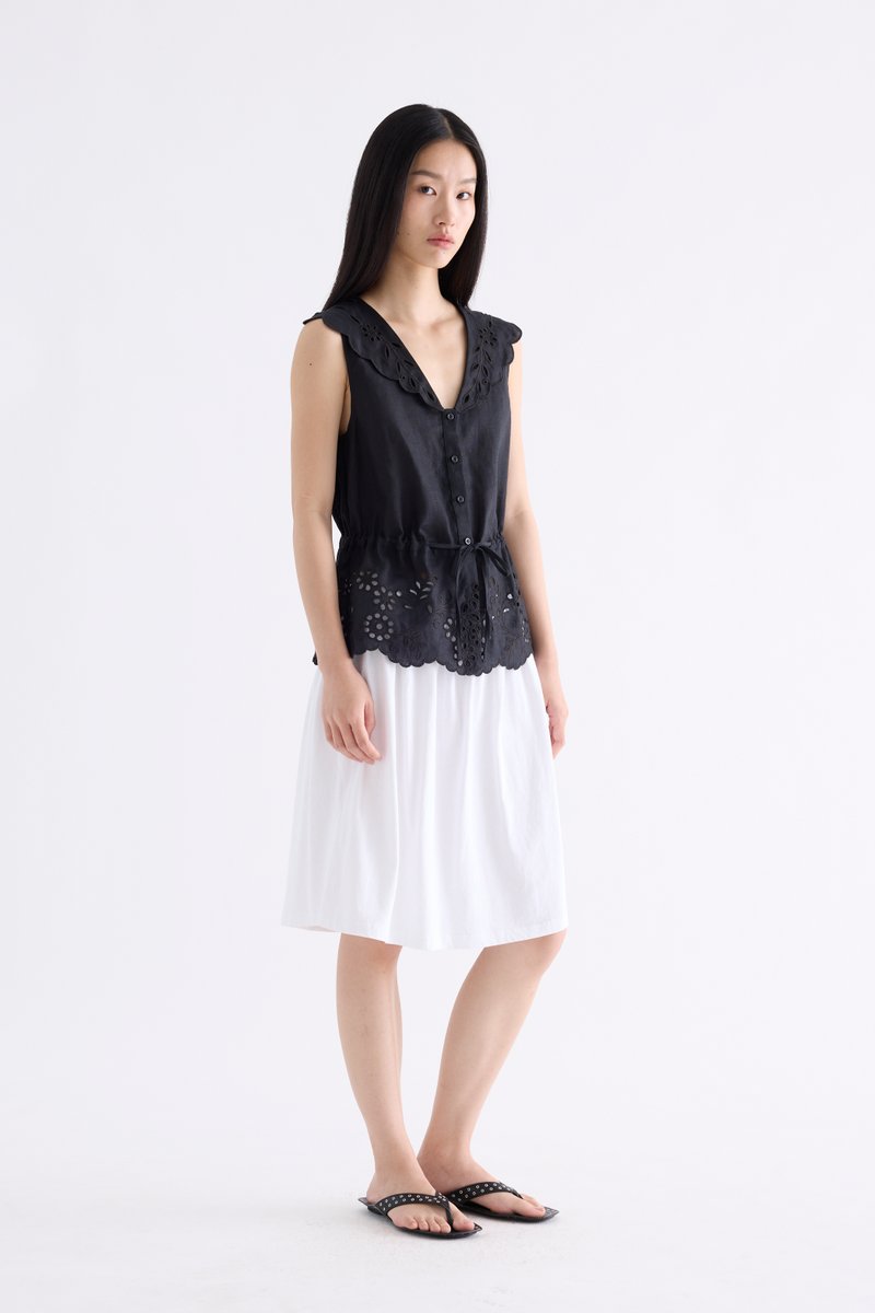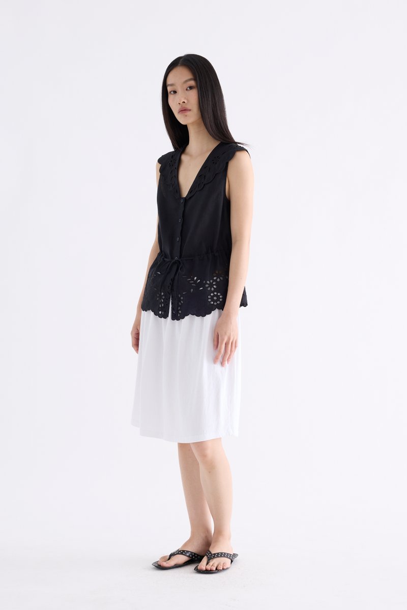 From the Postscript collection. This sleeveless top features statement lace collars and a lace hem, a V-neckline and a button-down front. Its fit is adjustable via a drawstring waist tie.
