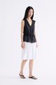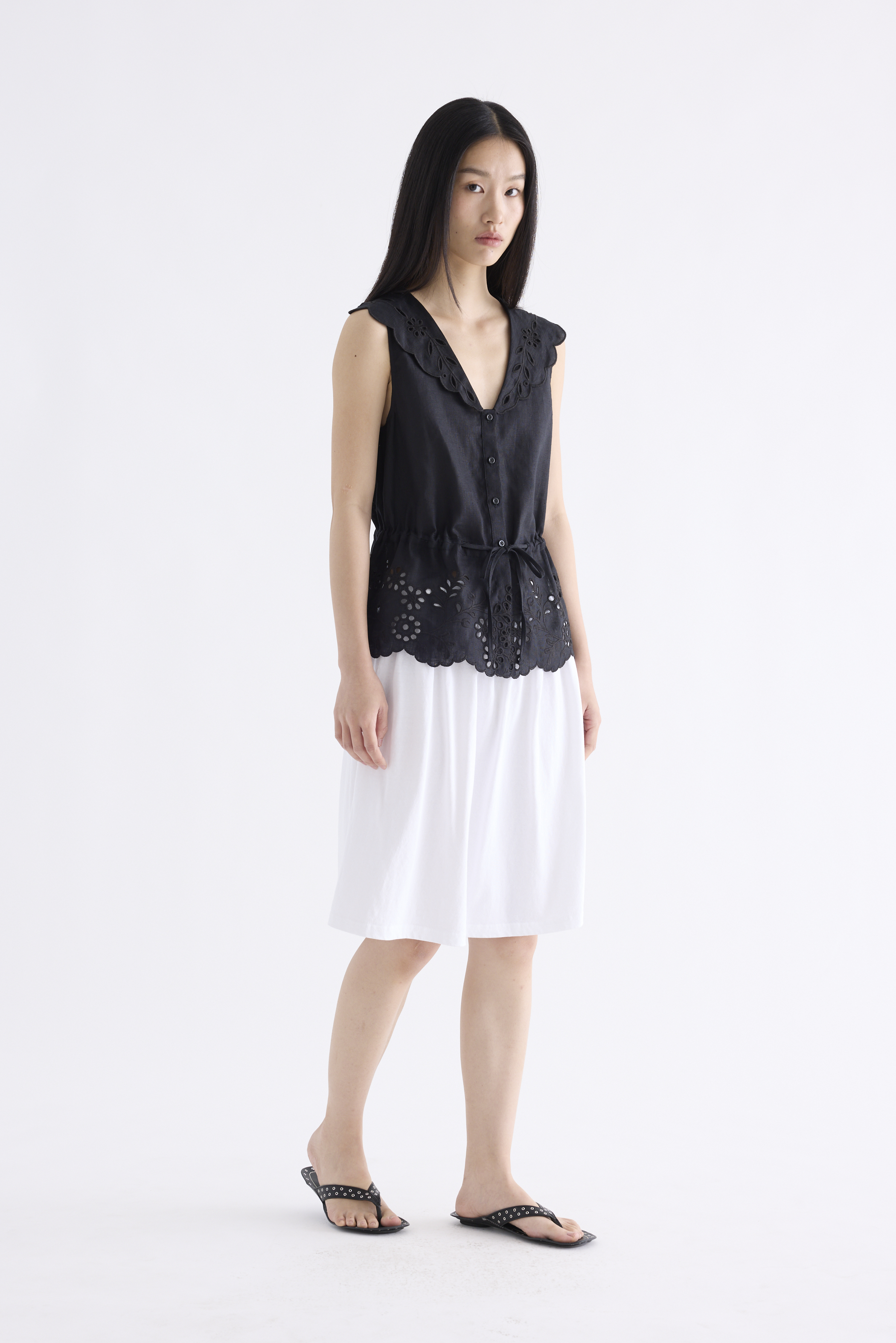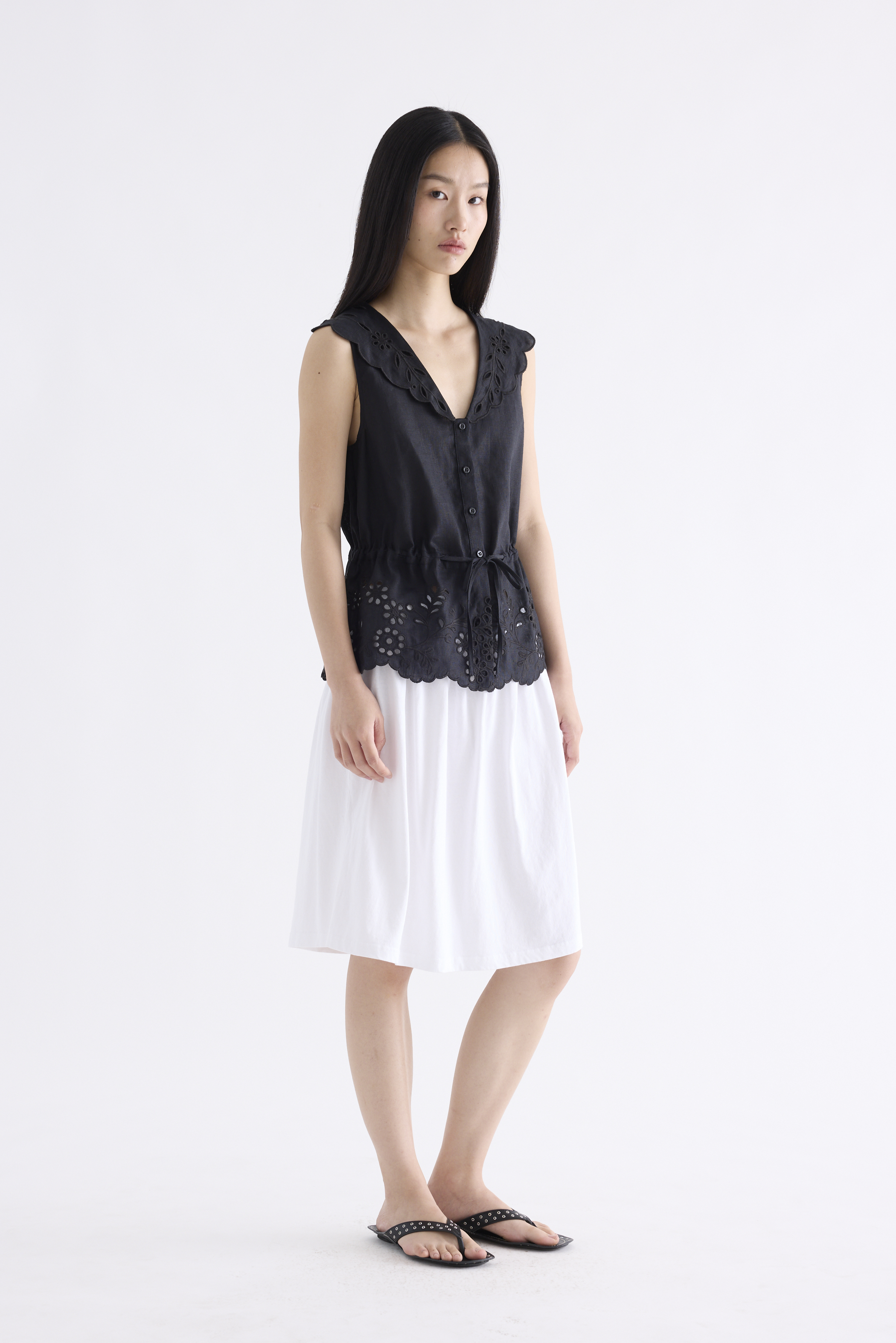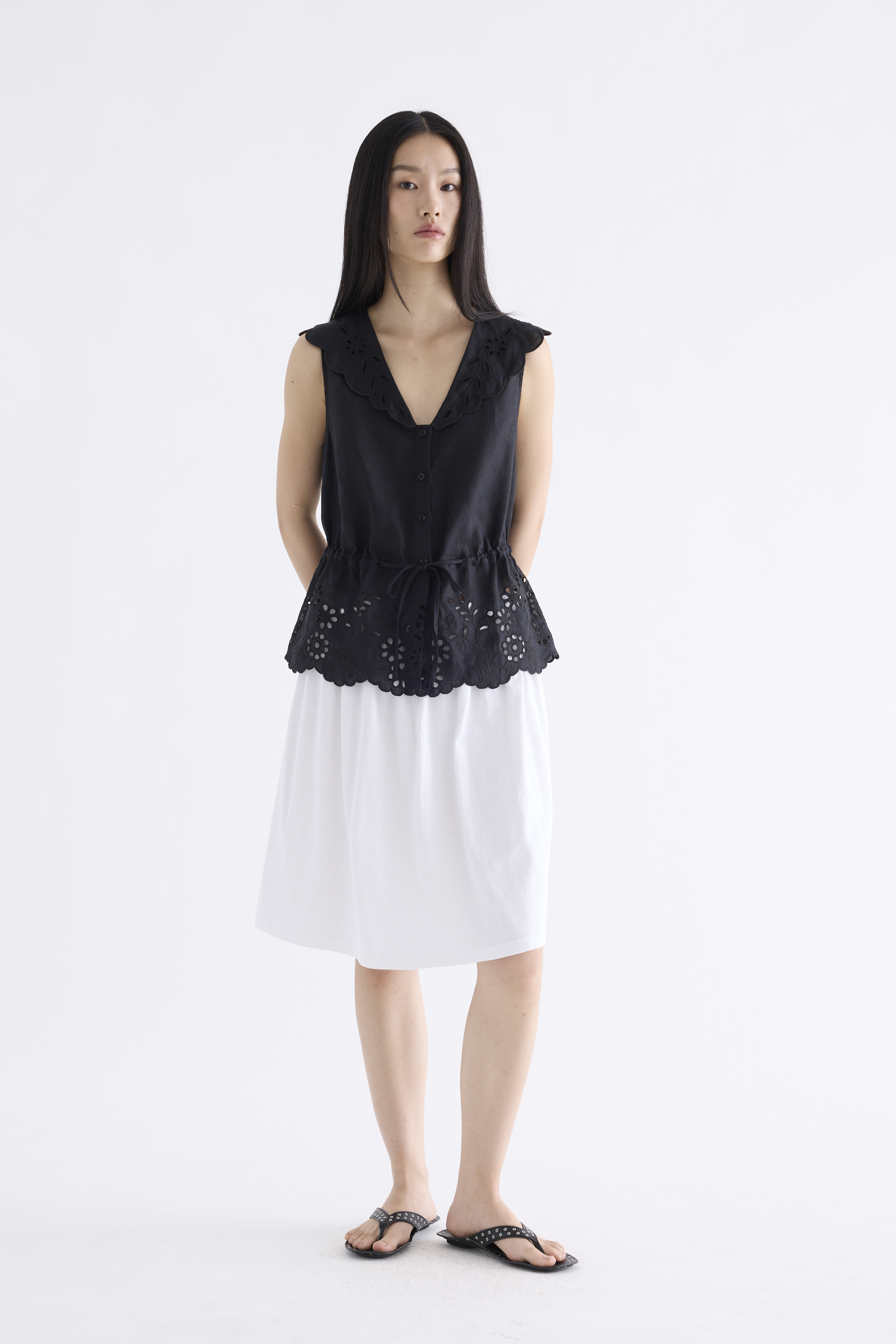 From the Postscript collection. This sleeveless top features statement lace collars and a lace hem, a V-neckline and a button-down front. Its fit is adjustable via a drawstring waist tie.