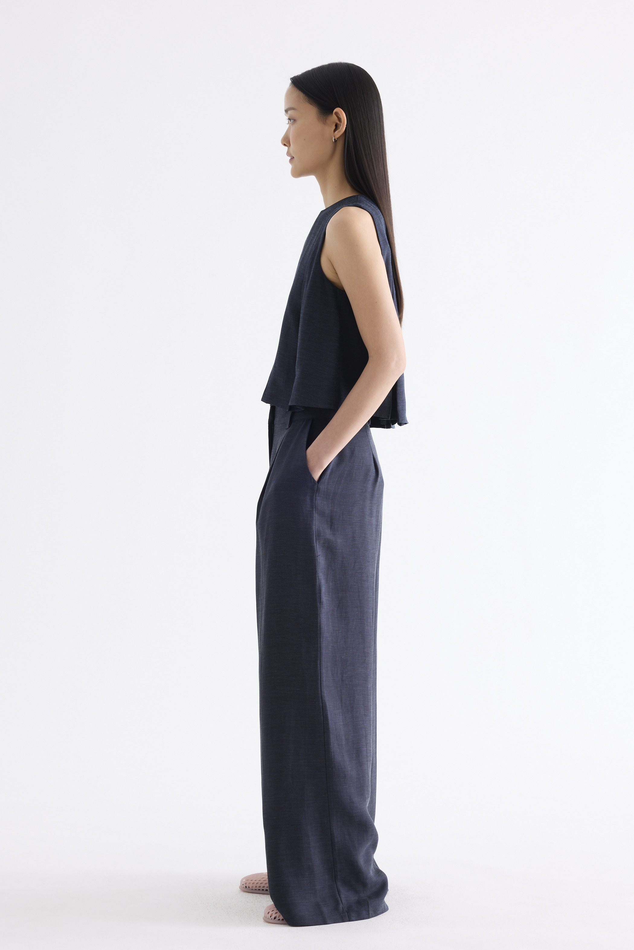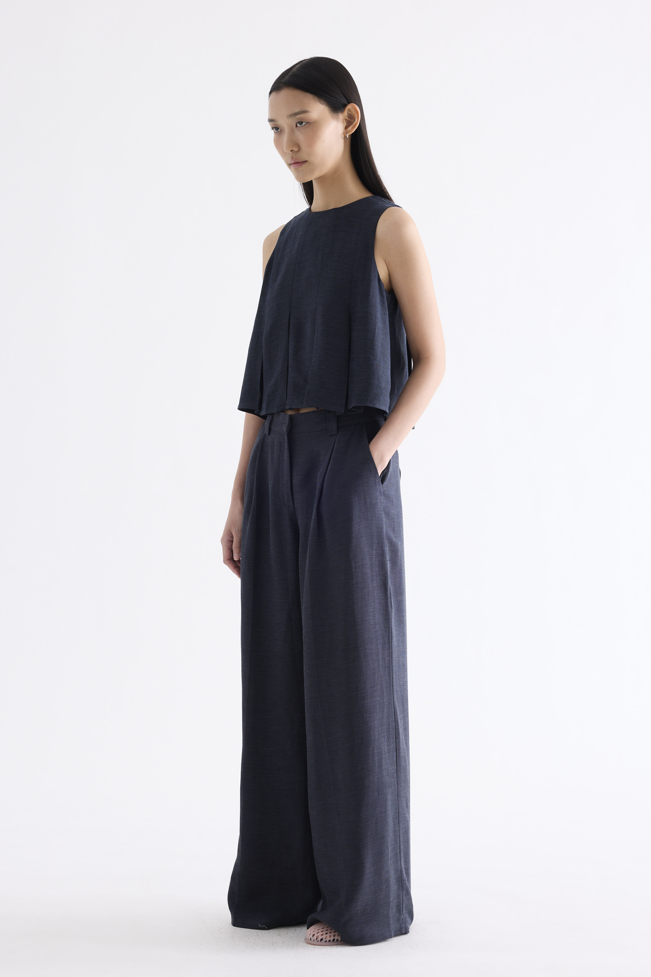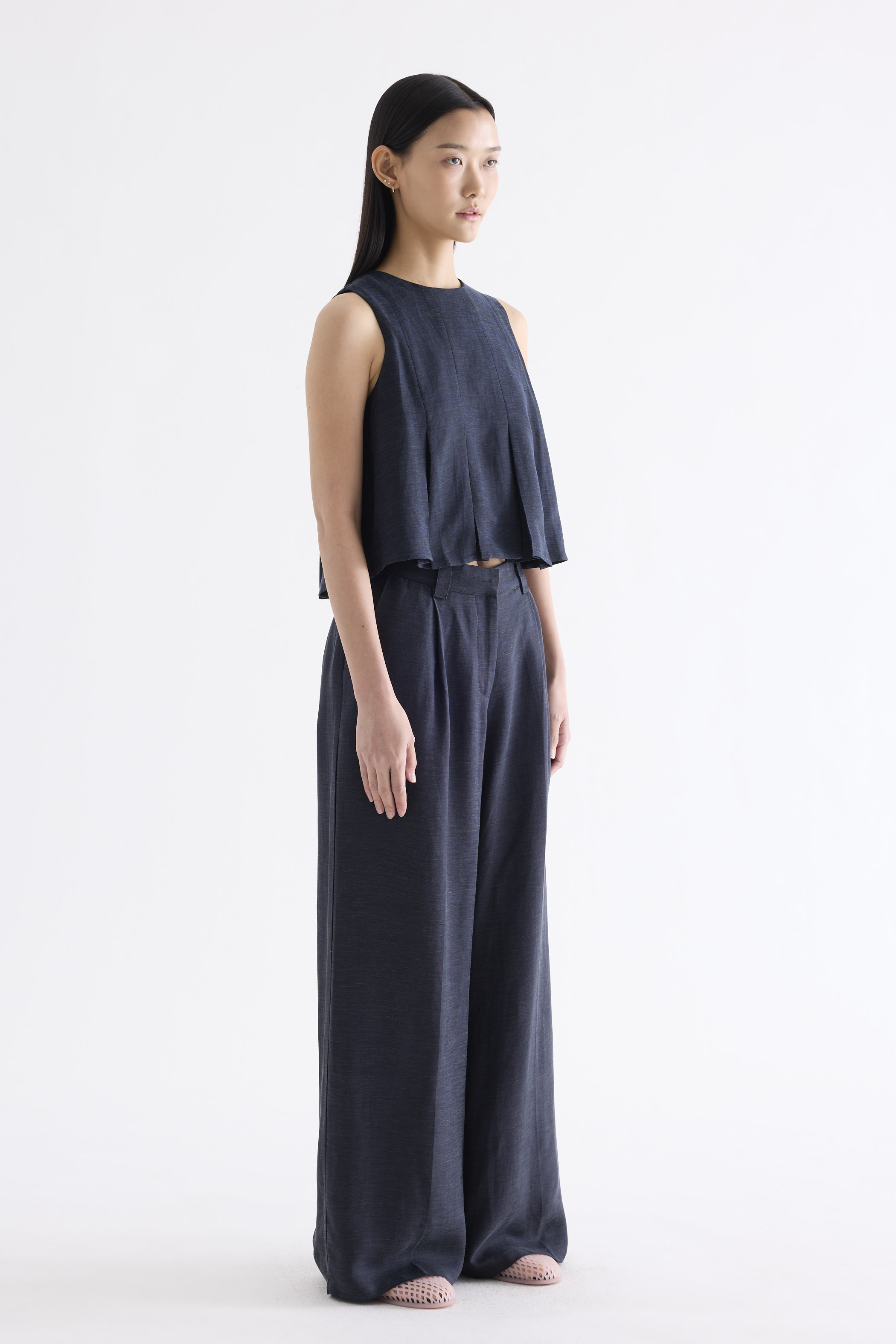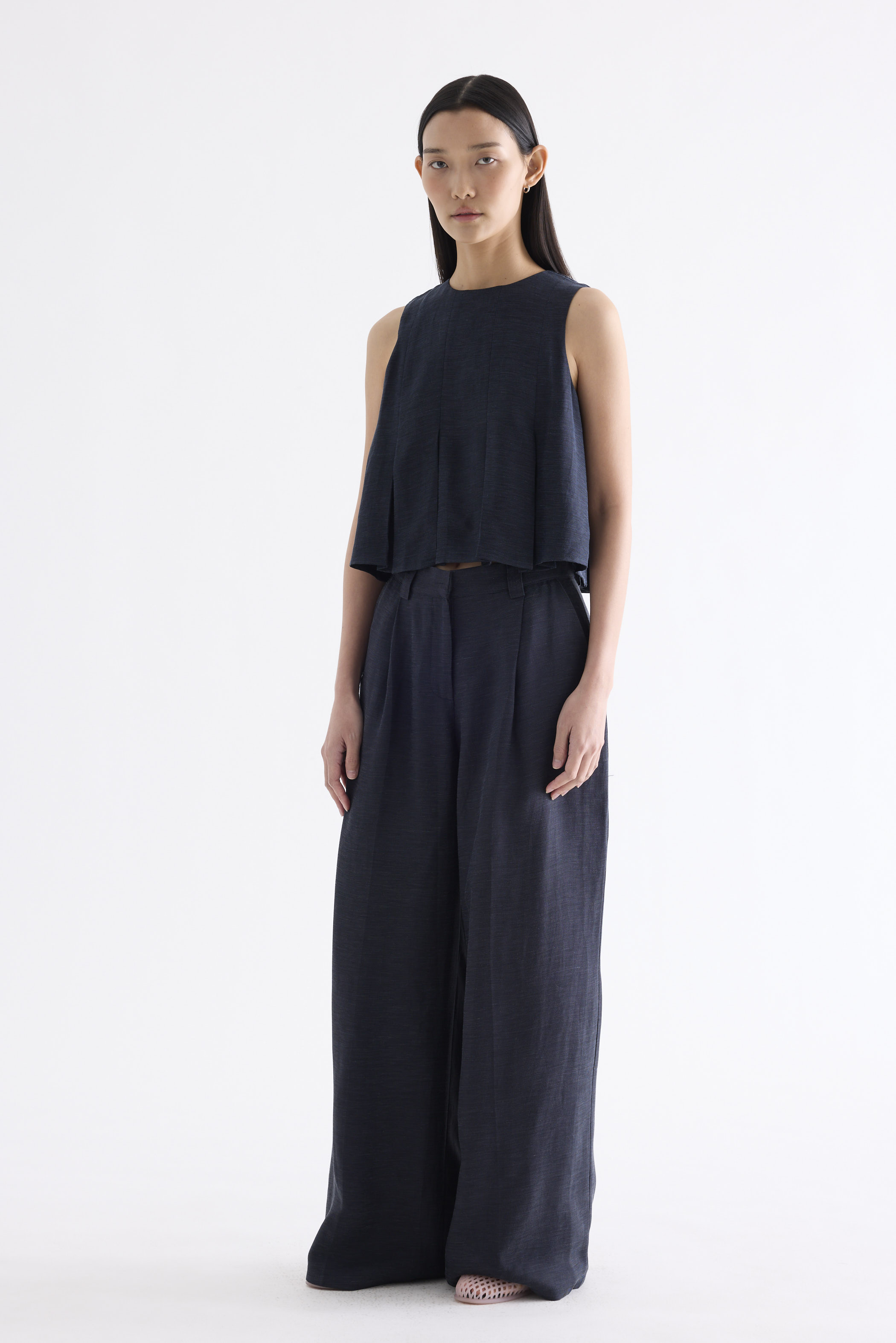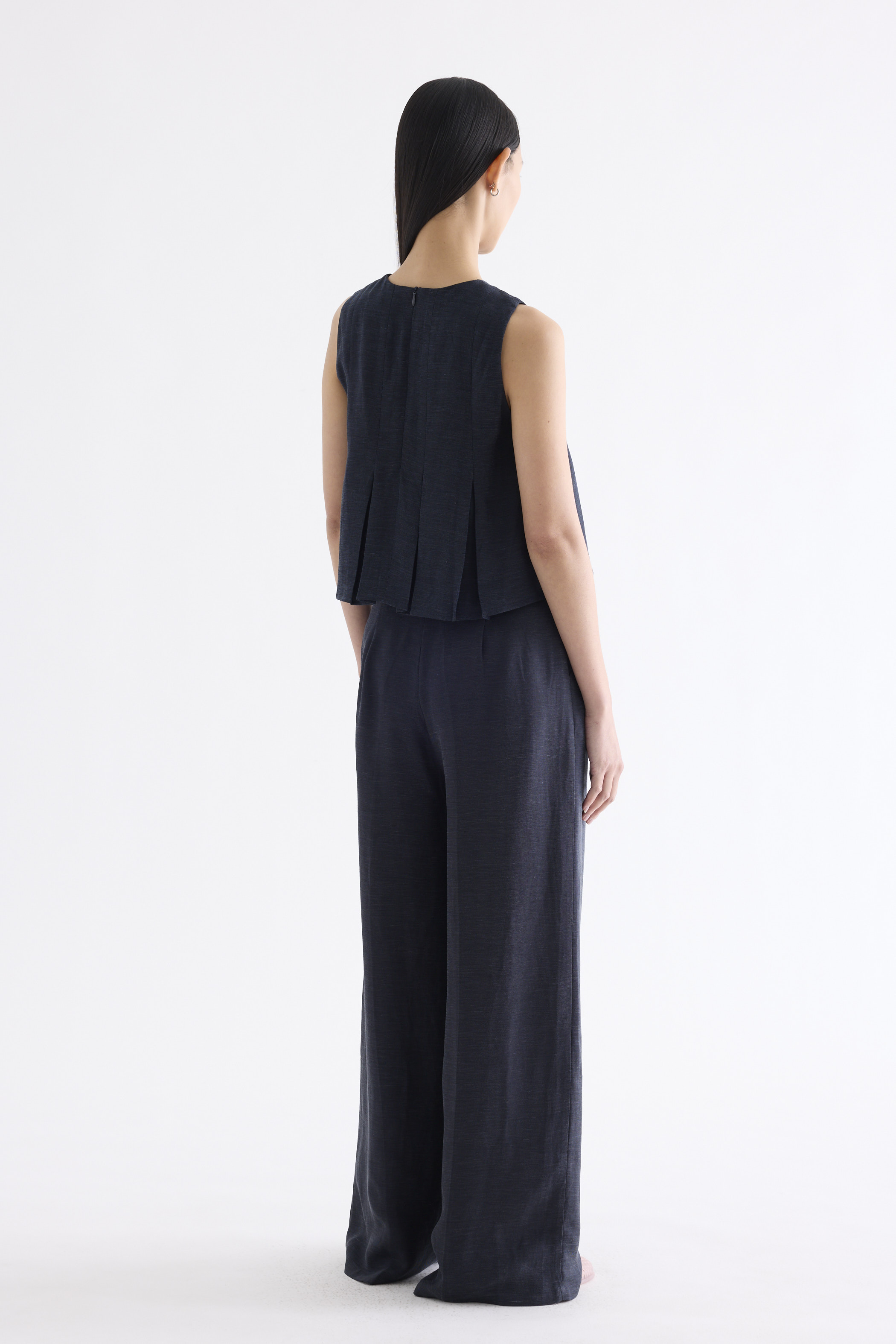 Clean lines. Cut from smooth and softly tailored fabric, this sleeveless top features a round-neckline, cut-in shoulders, box pleats and a panelled construction. Fits relaxed with a back zip closure.