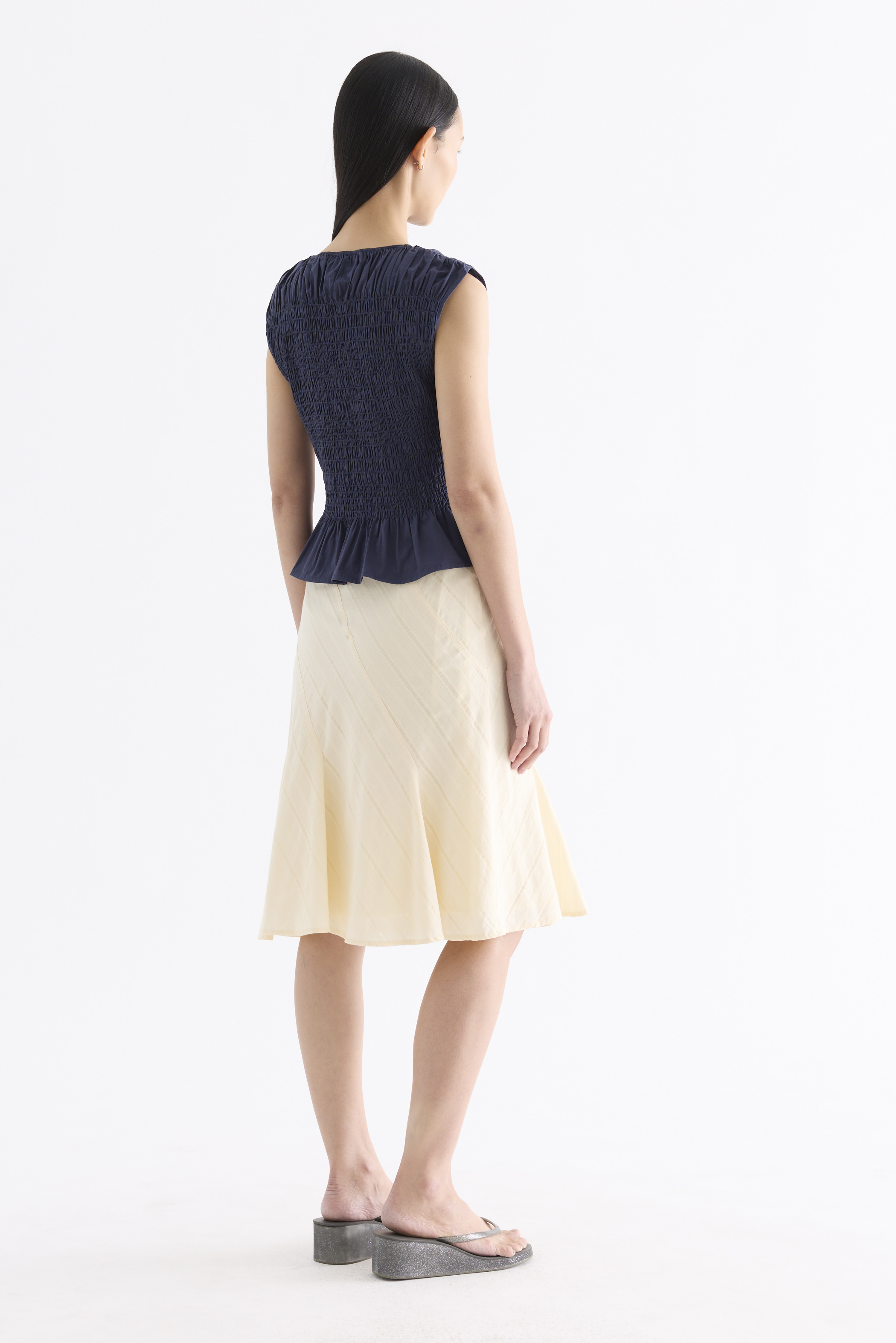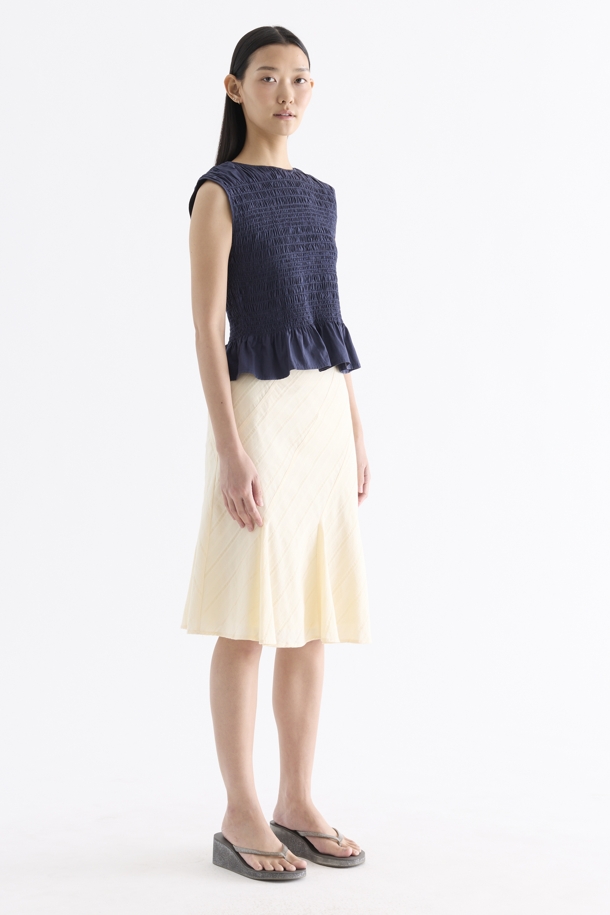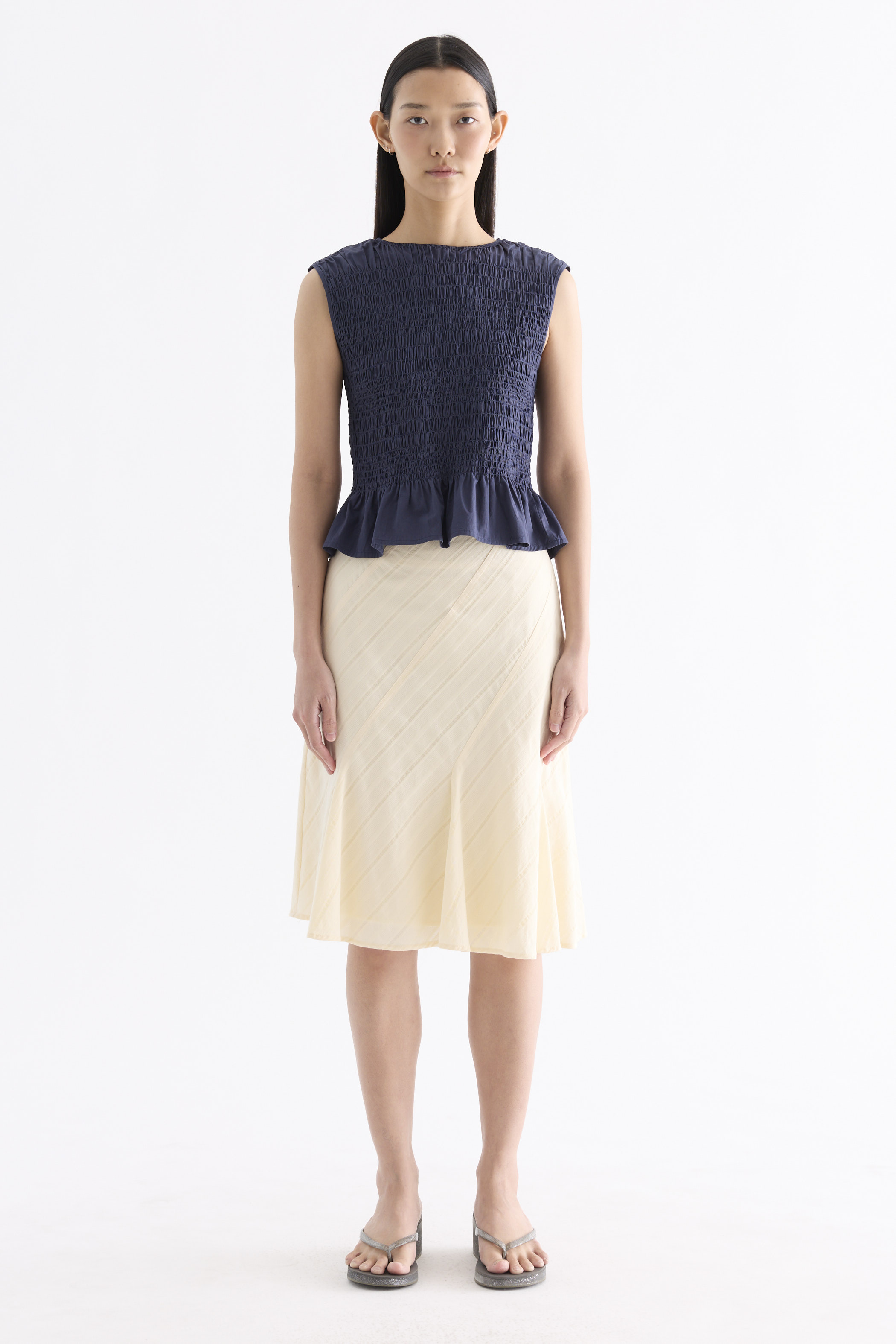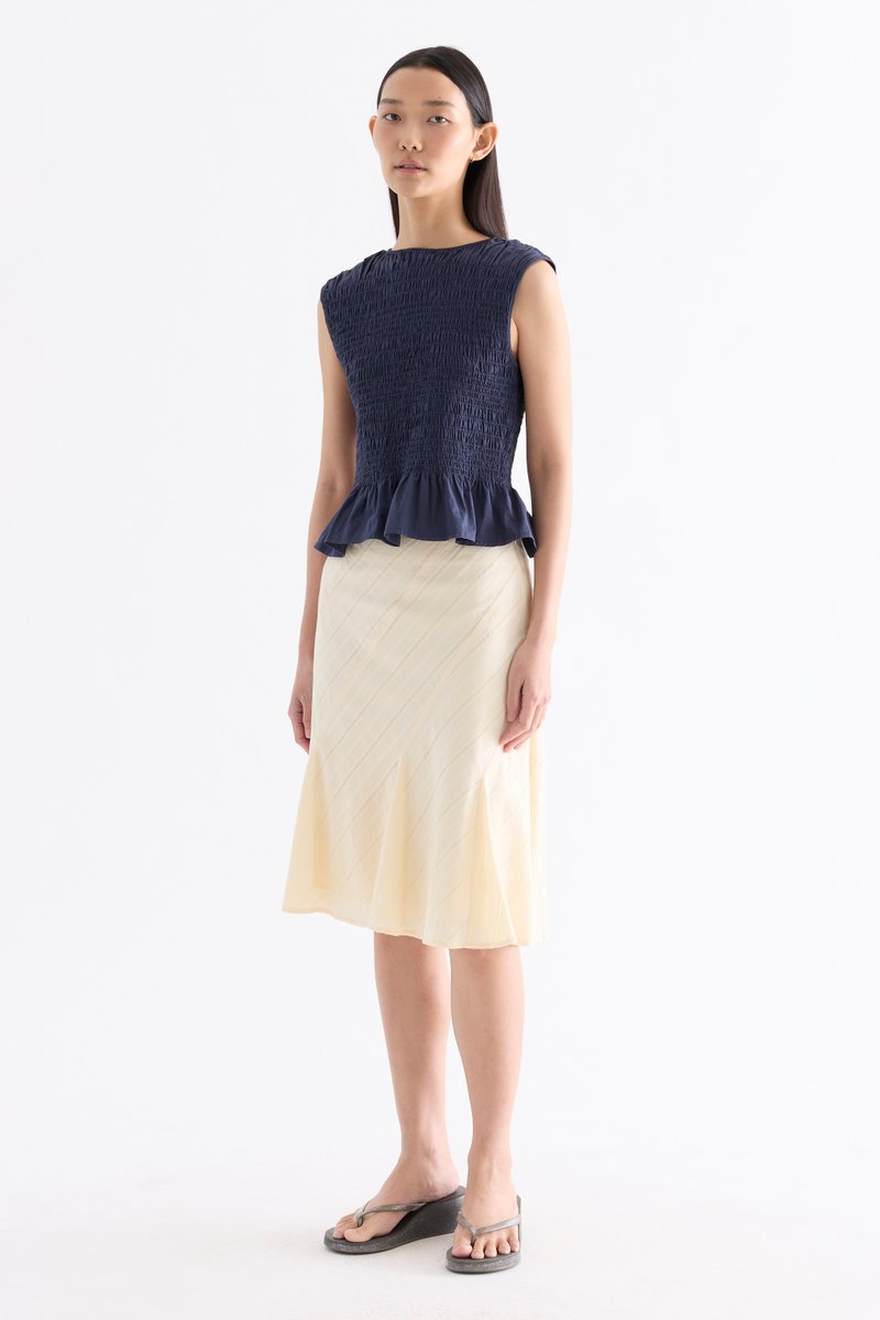 But first, textures. Cut from crisp and softly structured cotton, this sleeveless top features a smocked bodice, gathered round neckline and frilled hem. Fits slim.