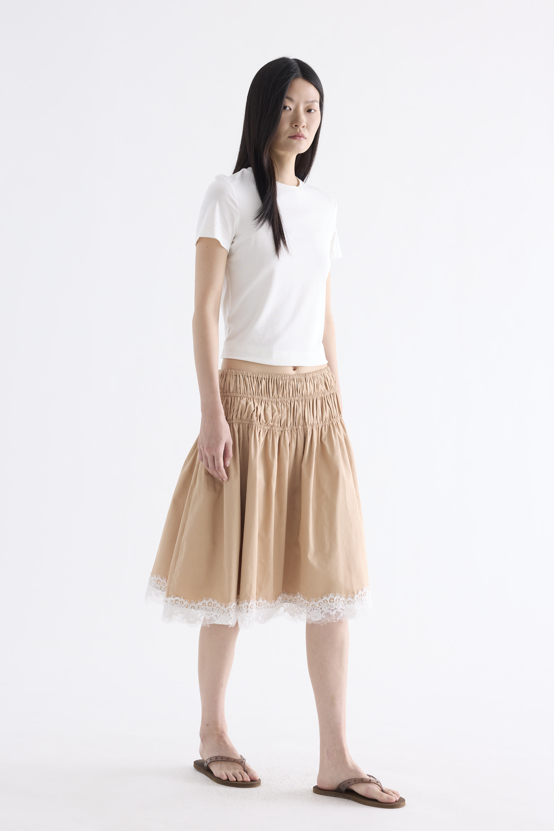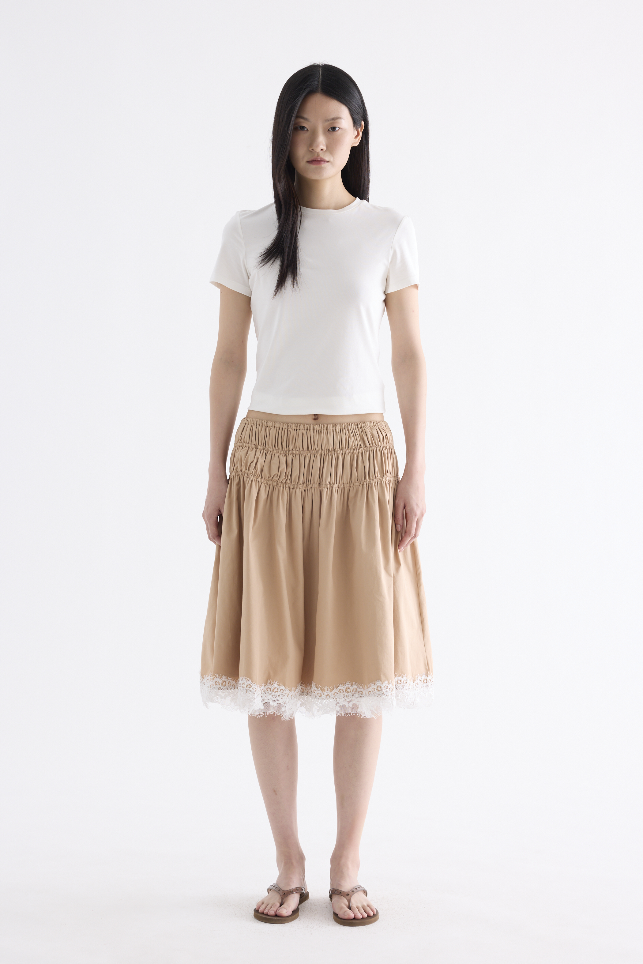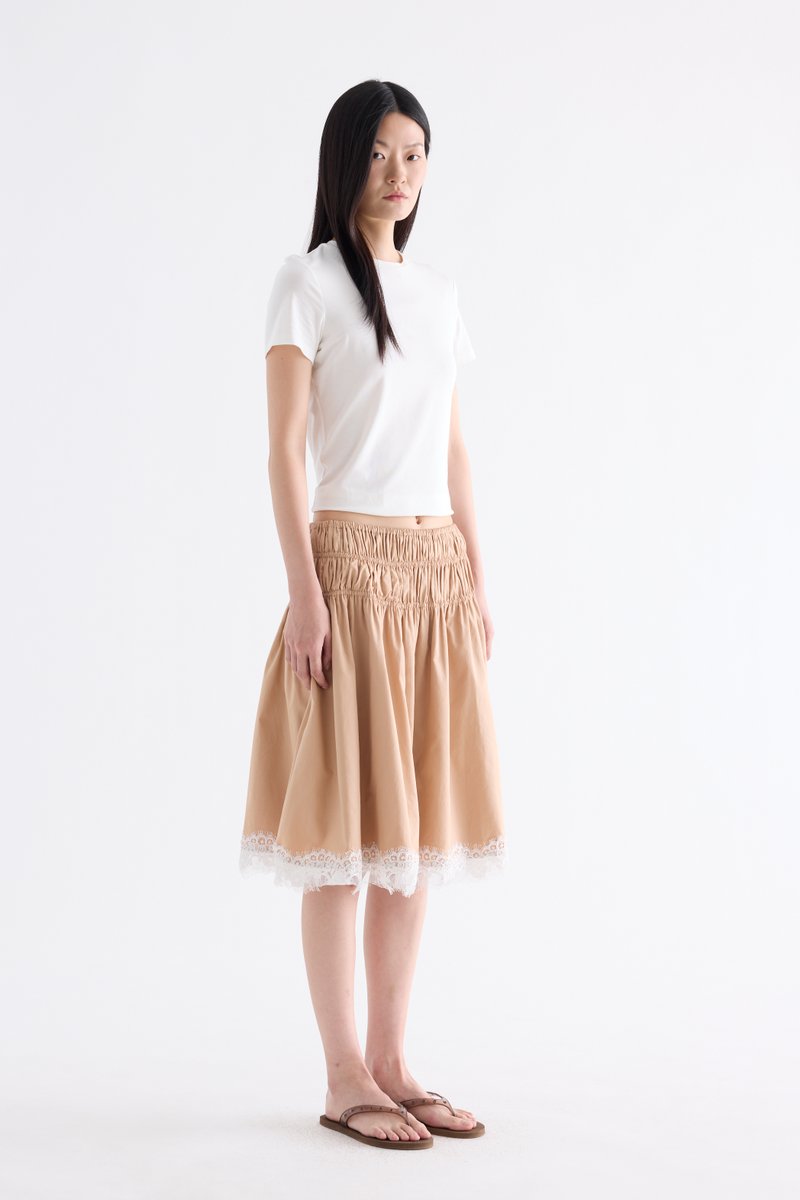 From the Postscript collection. Cut from smooth and softly structured cotton, this knee-length skirt features a stretchy shirred waist and lace along its hem. Fits slim through the waist and hips, before flowing out in a relaxed A-line silhouette.