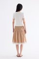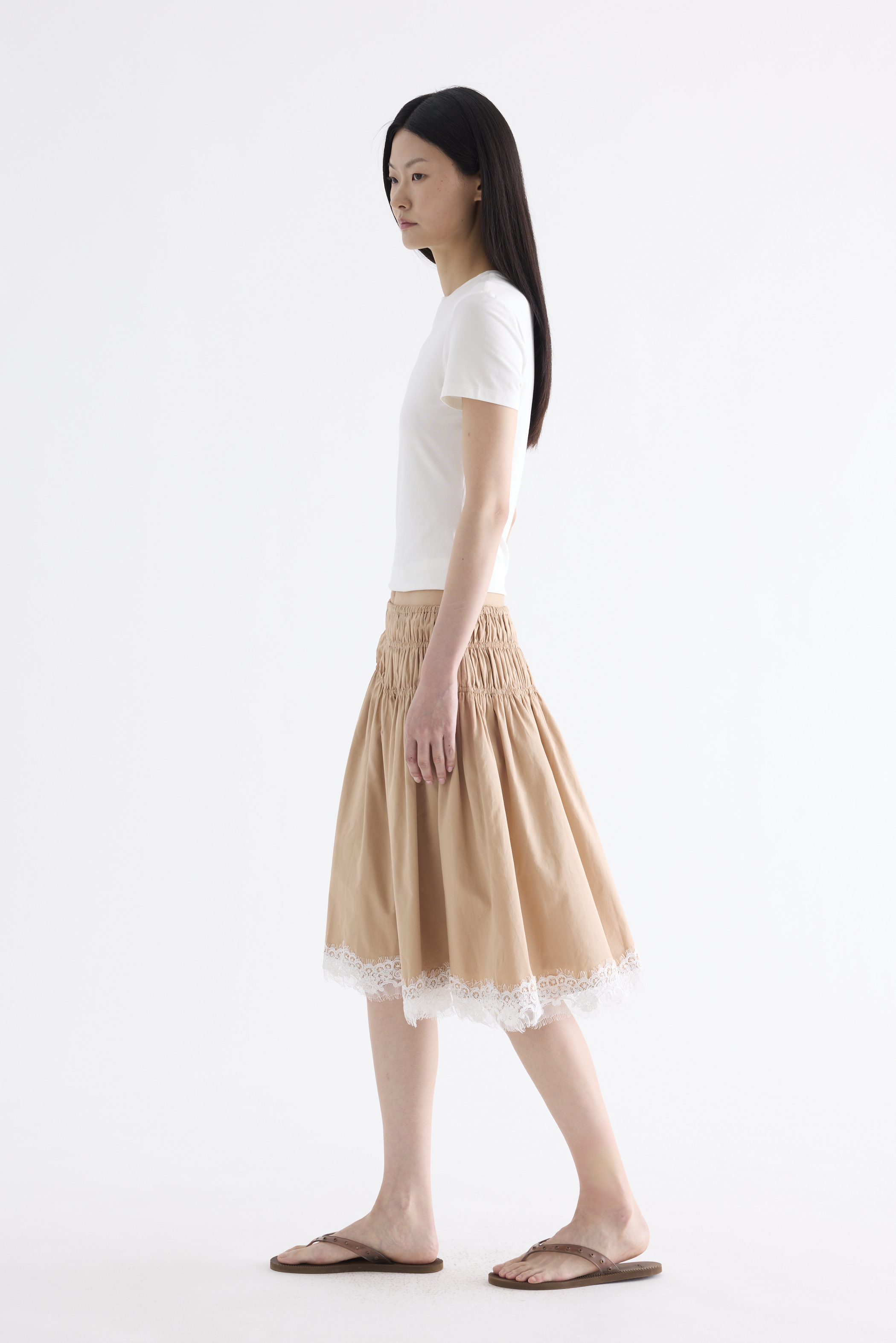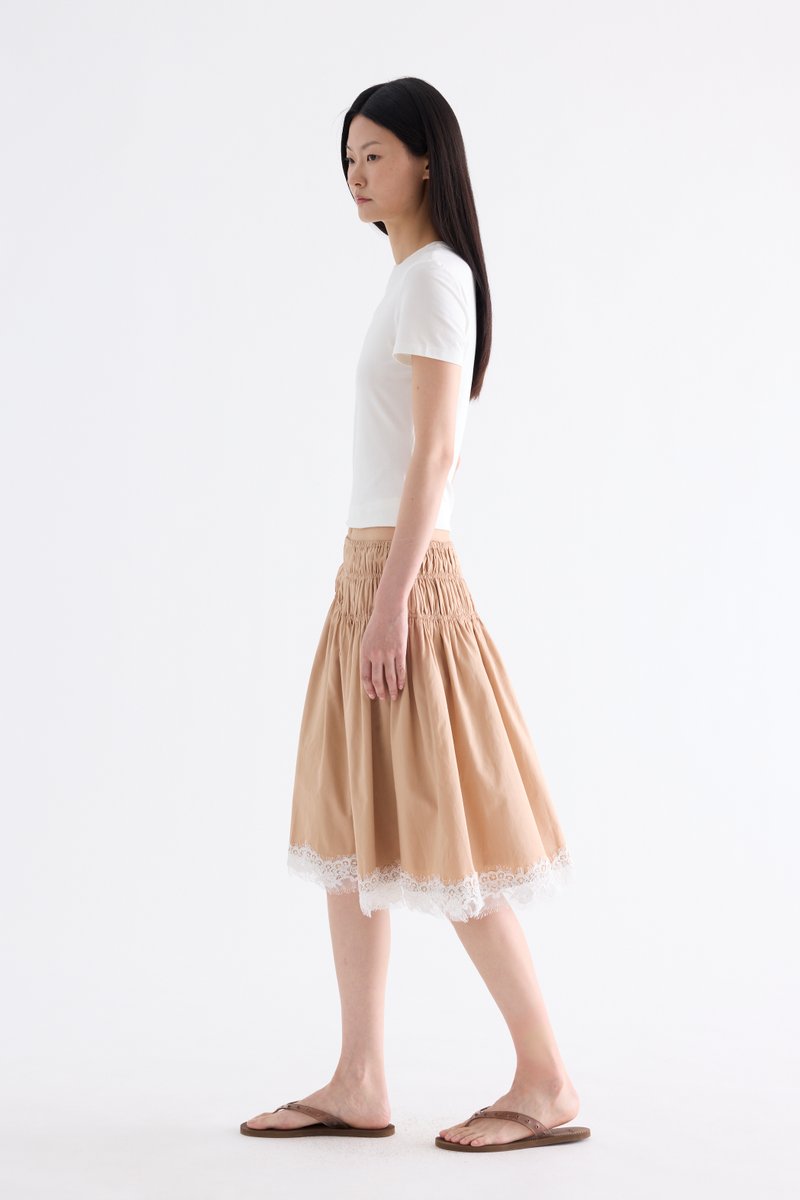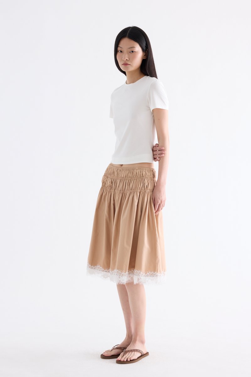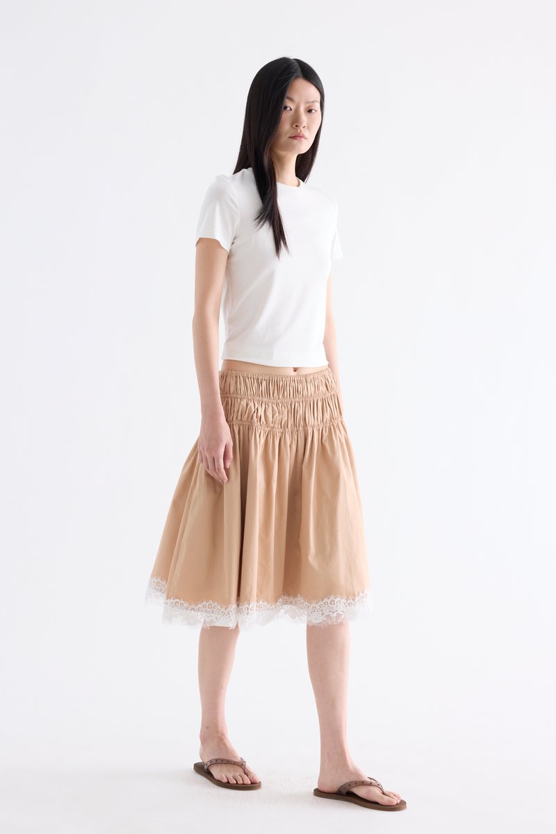 From the Postscript collection. Cut from smooth and softly structured cotton, this knee-length skirt features a stretchy shirred waist and lace along its hem. Fits slim through the waist and hips, before flowing out in a relaxed A-line silhouette.