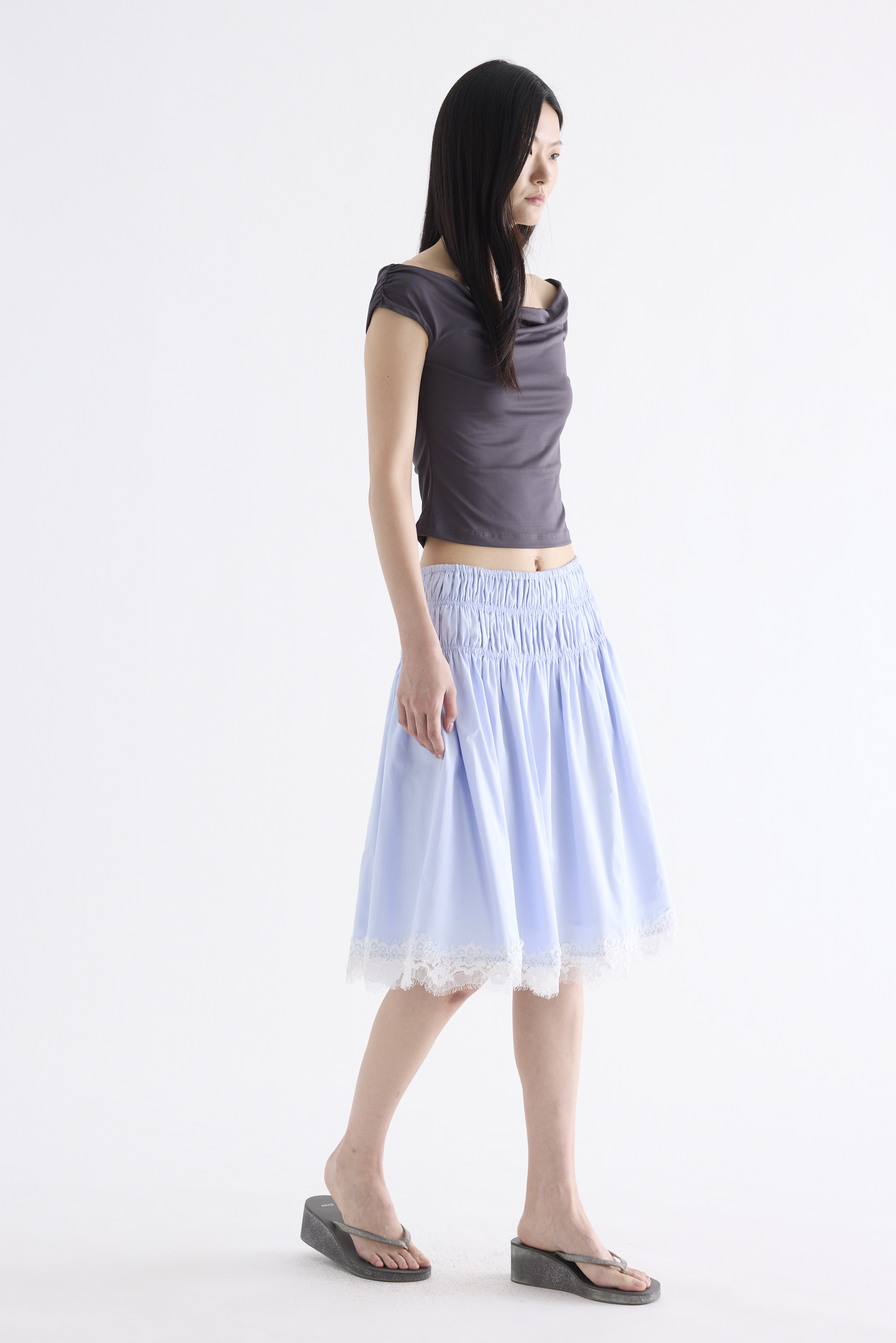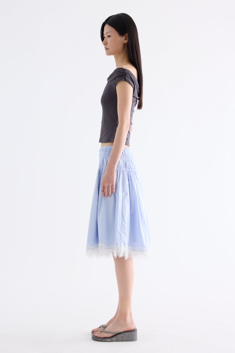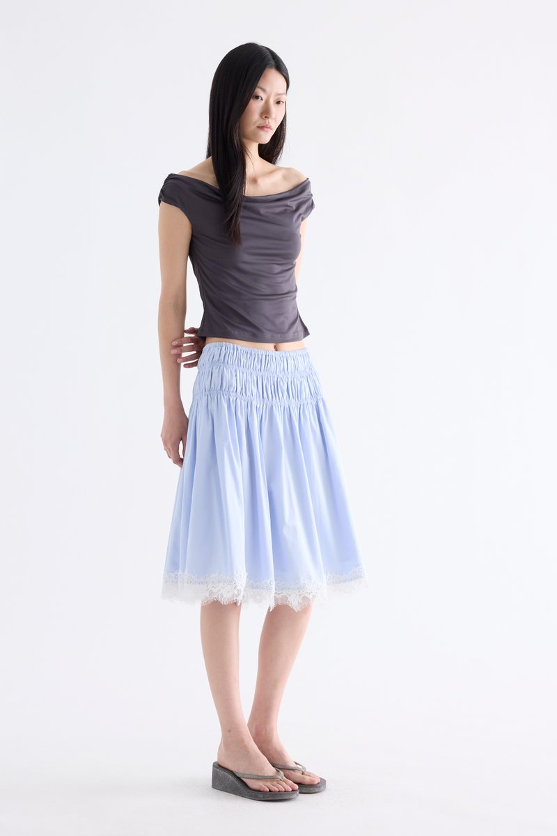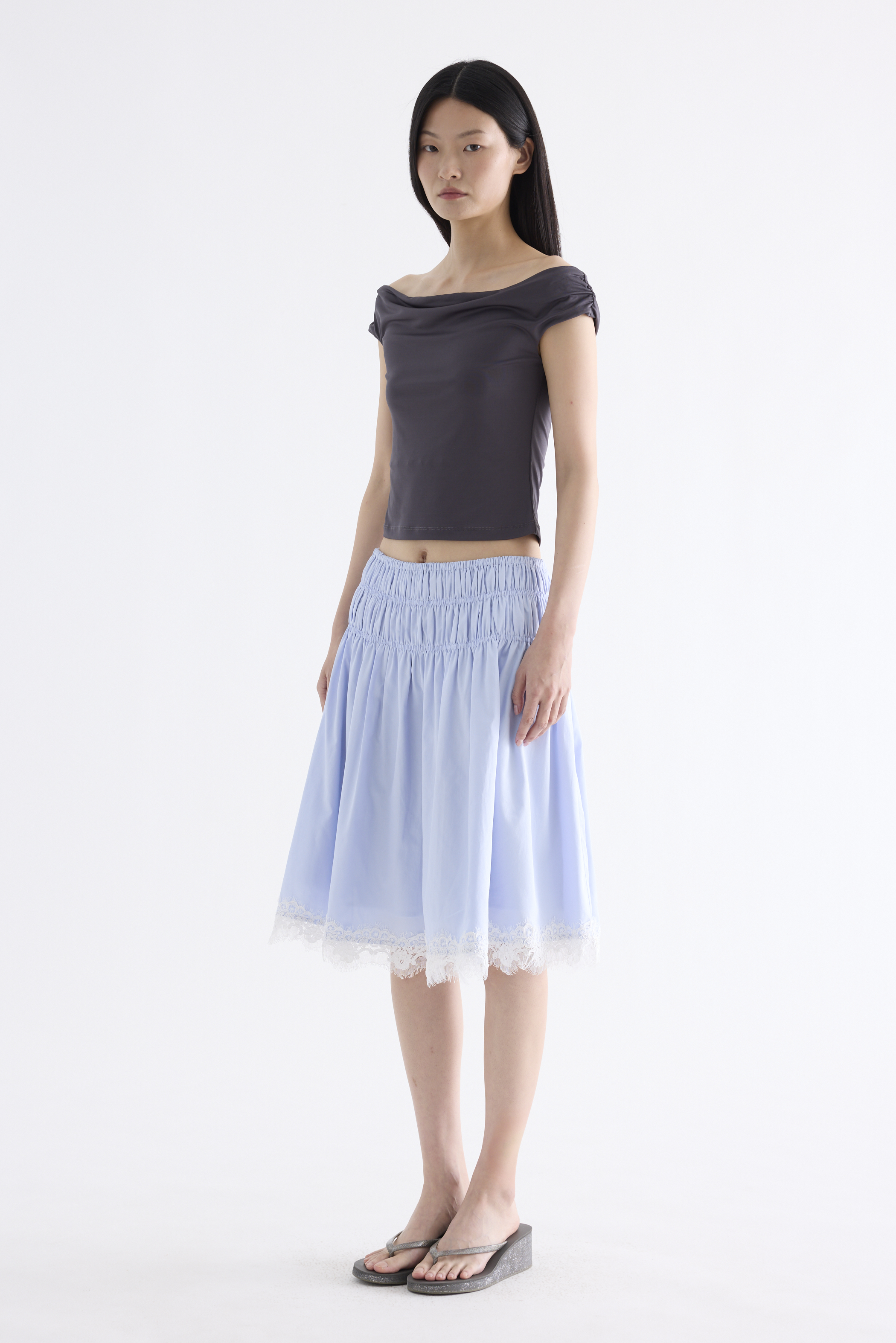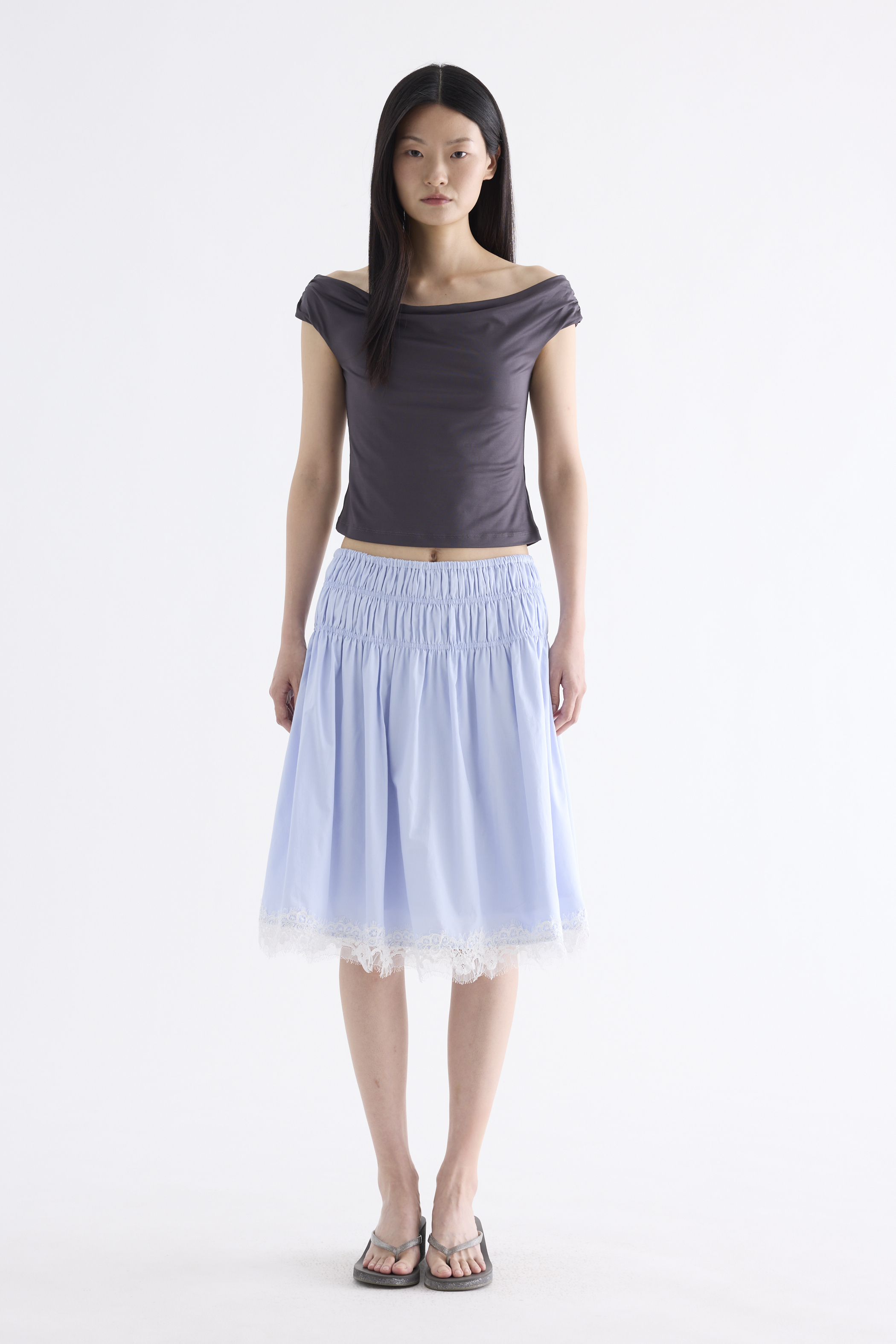 From the Postscript collection. Cut from smooth and softly structured cotton, this knee-length skirt features a stretchy shirred waist and lace along its hem. Fits slim through the waist and hips, before flowing out in a relaxed A-line silhouette.