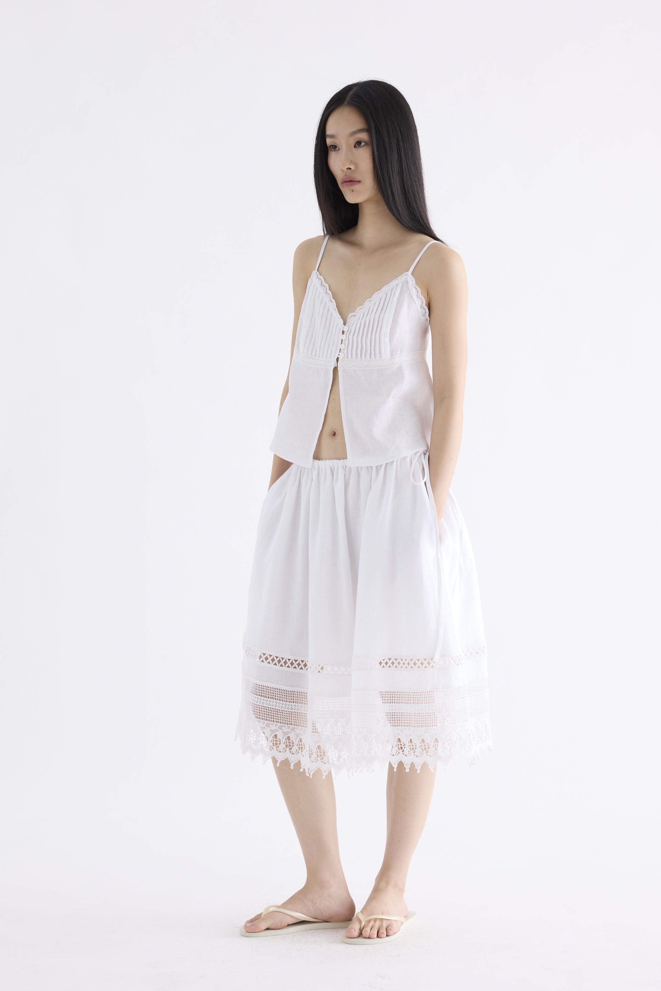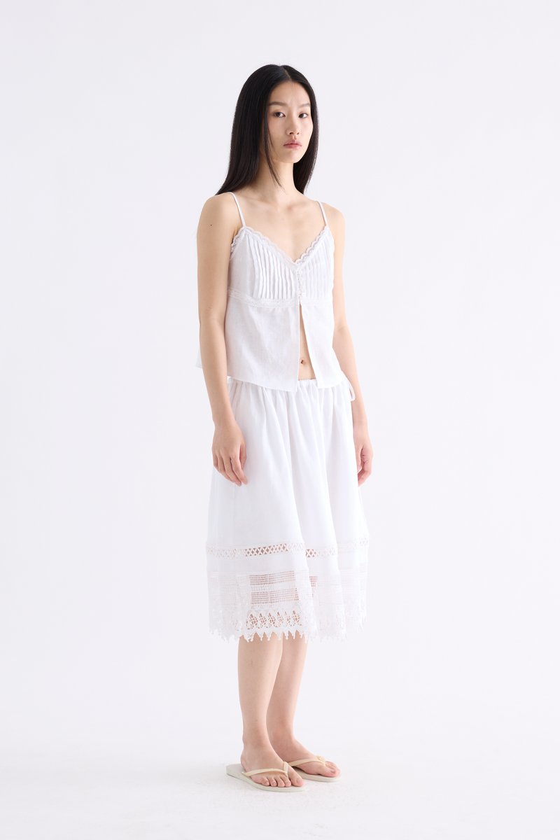 From the Postscript collection. This midi skirt is cut from fully lined 100% linen with an airy and softly structured finish. Features an A-line silhouette, crochet hem and elasticated drawstring waistband with a side tie-strap. Fits relaxed.