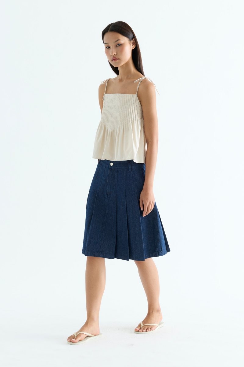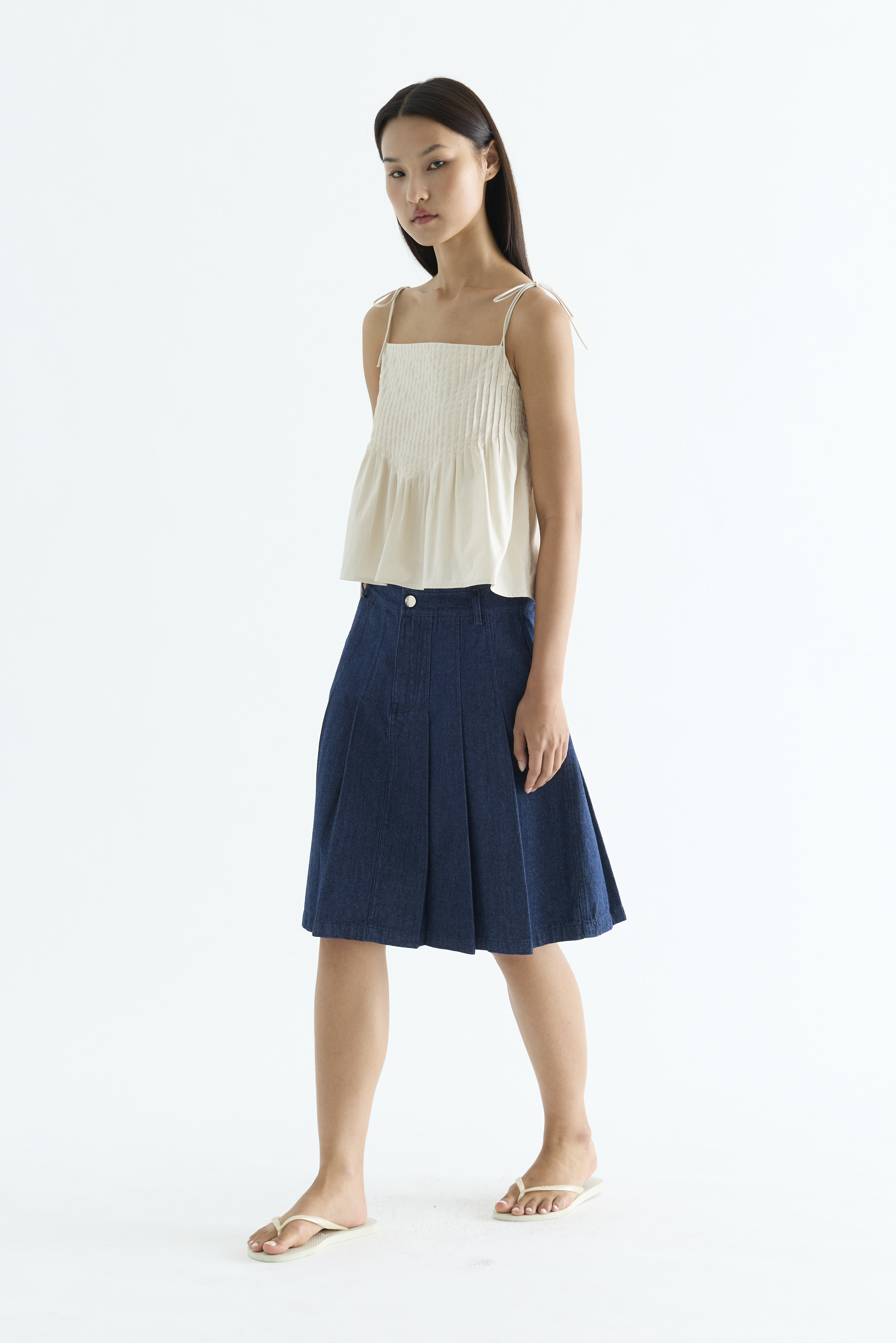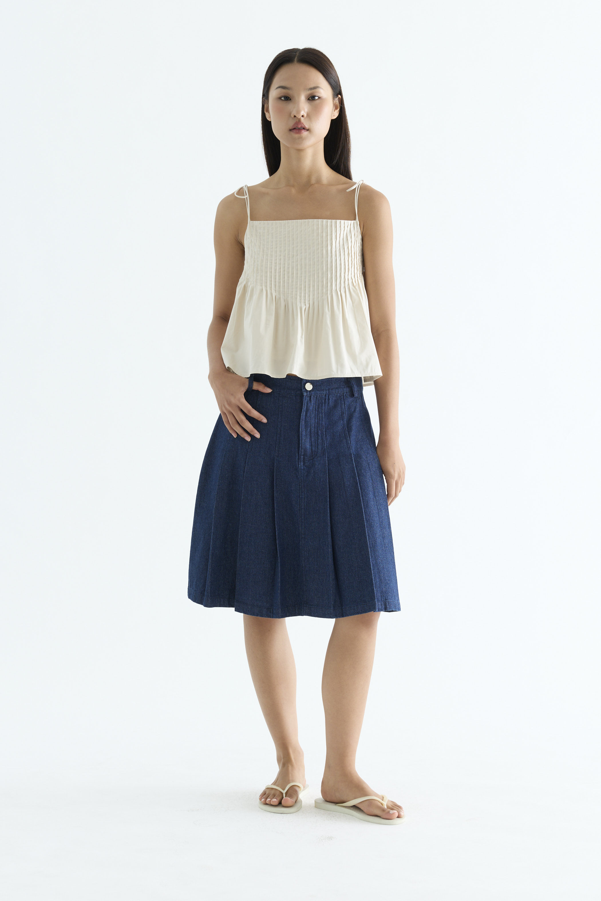 Tactile. Made from light and crisp cotton, this sleeveless top features pin-tuck pleats, a straight neckline and slim self-tying shoulder straps. Worn in a relaxed fit.