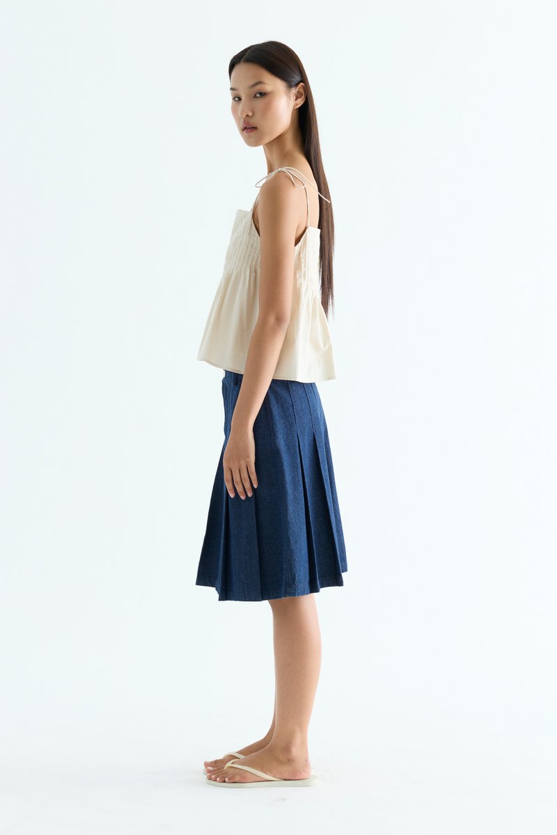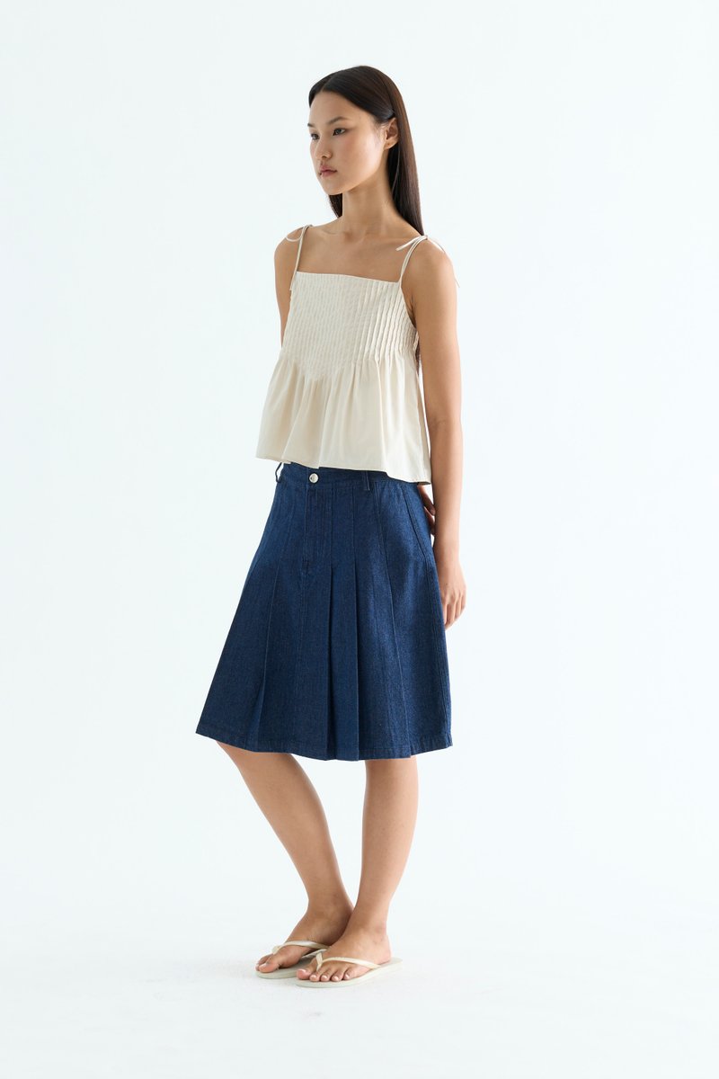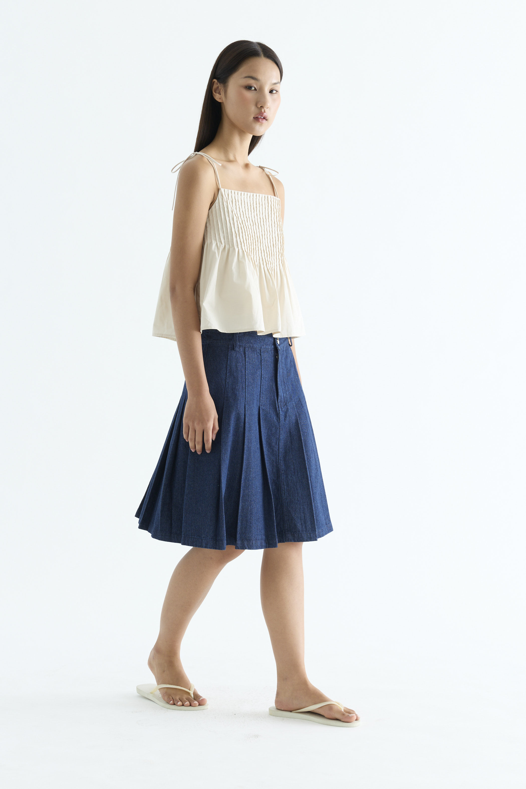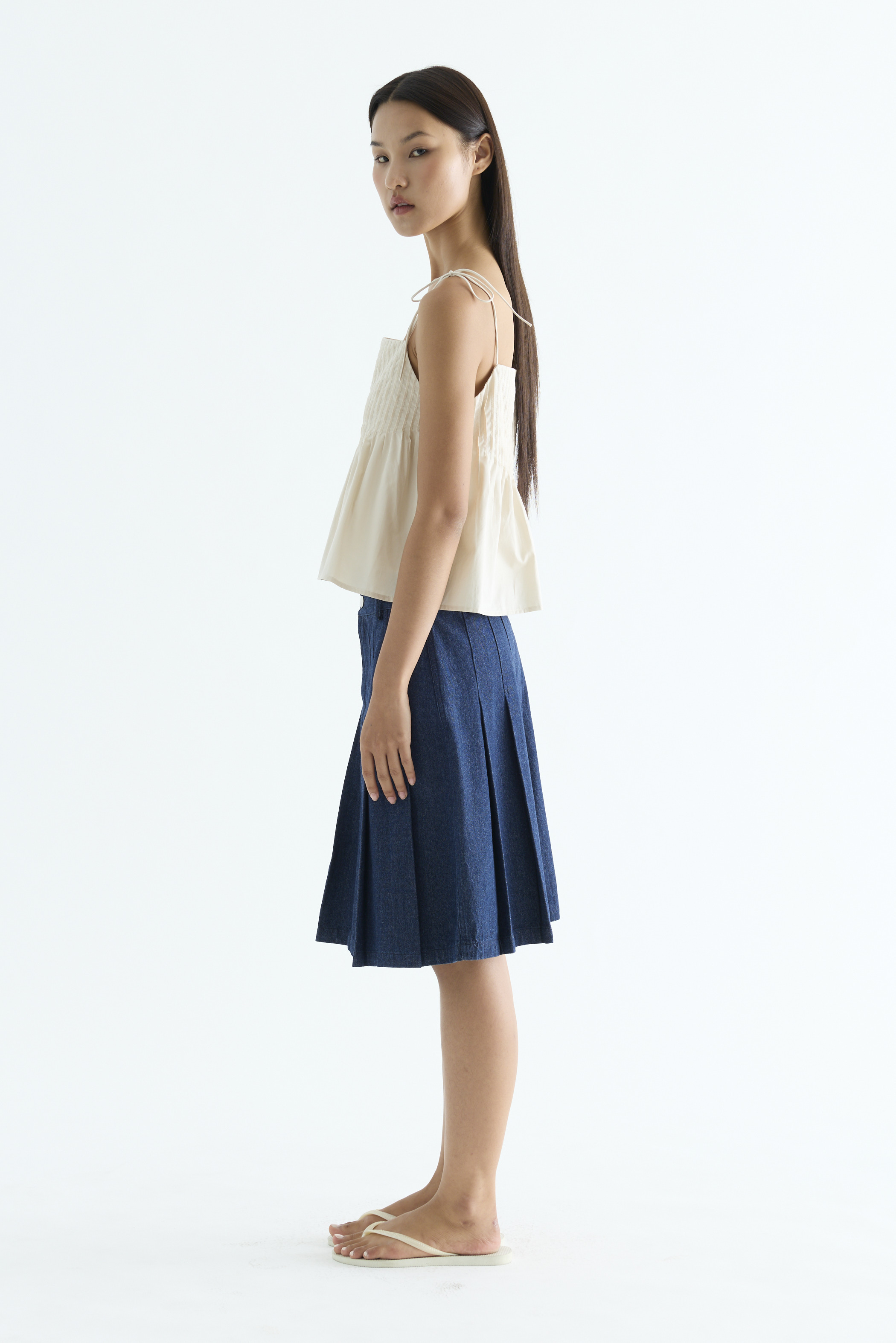 Tactile. Made from light and crisp cotton, this sleeveless top features pin-tuck pleats, a straight neckline and slim self-tying shoulder straps. Worn in a relaxed fit.