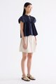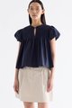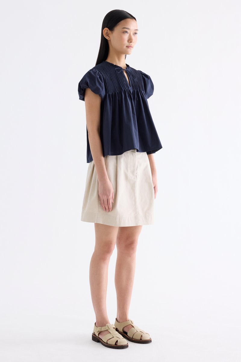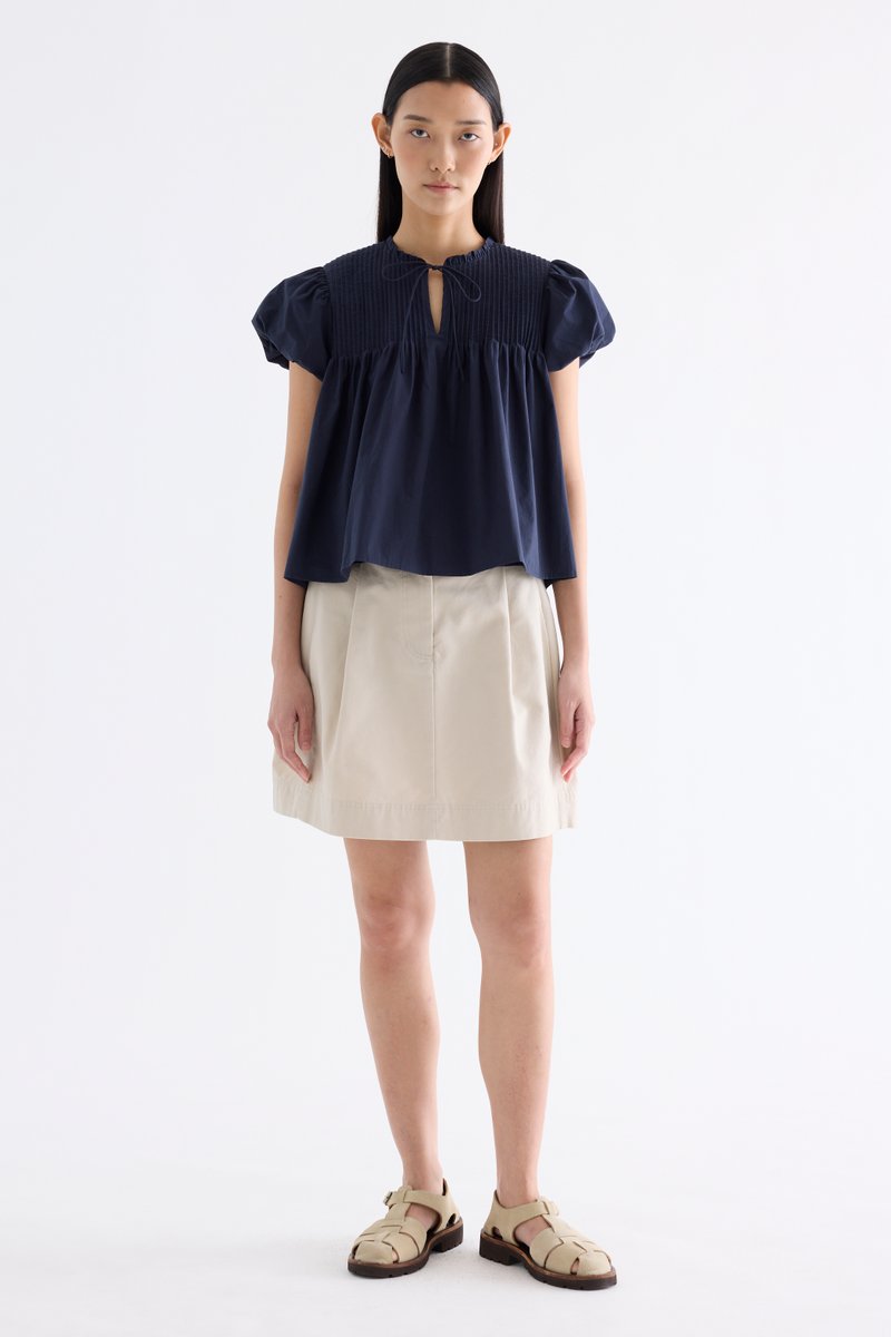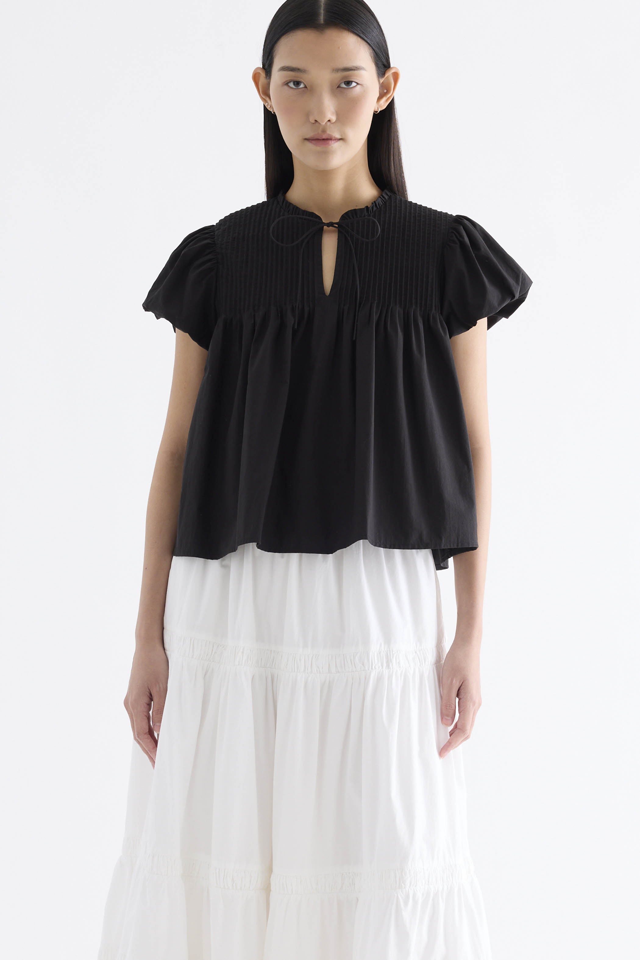 Here for the flare. Cut from crisp and softly structured cotton, this top features a frill-trimmed neckline, front opening with tie-strap, pin-tuck pleats and elasticated puffy sleeves. Worn in a relaxed swing silhouette.
