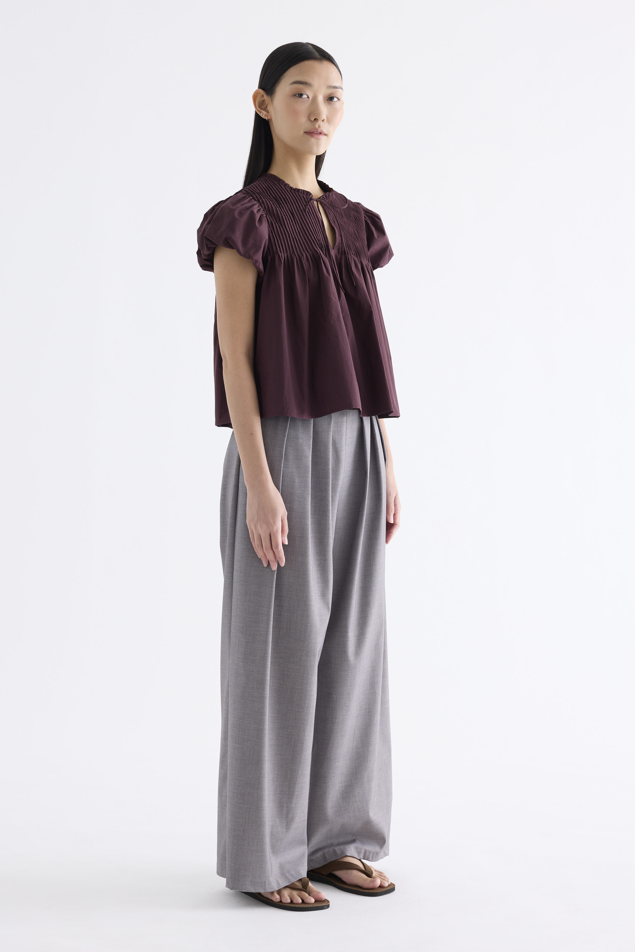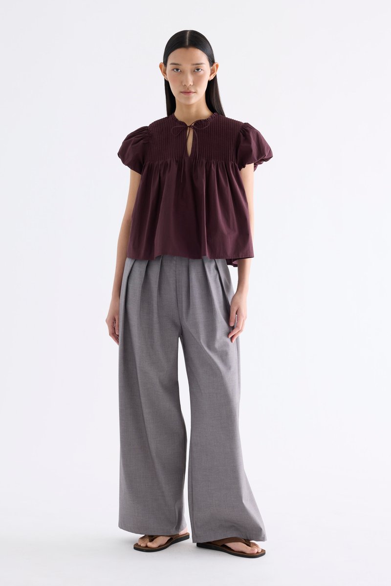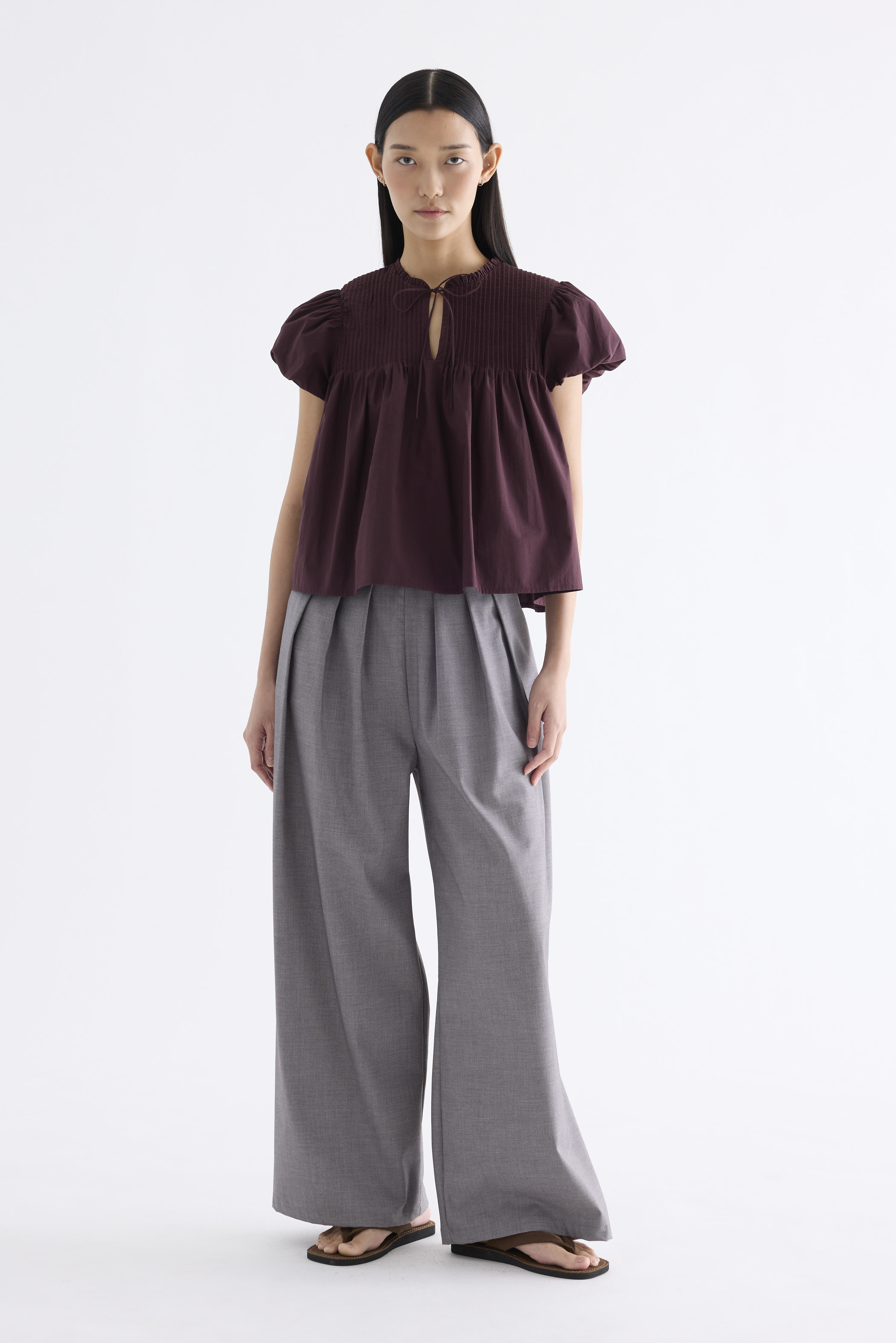 Here for the flare. Cut from crisp and softly structured cotton, this top features a frill-trimmed neckline, front opening with tie-strap, pin-tuck pleats and elasticated puffy sleeves. Worn in a relaxed swing silhouette.