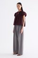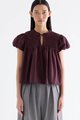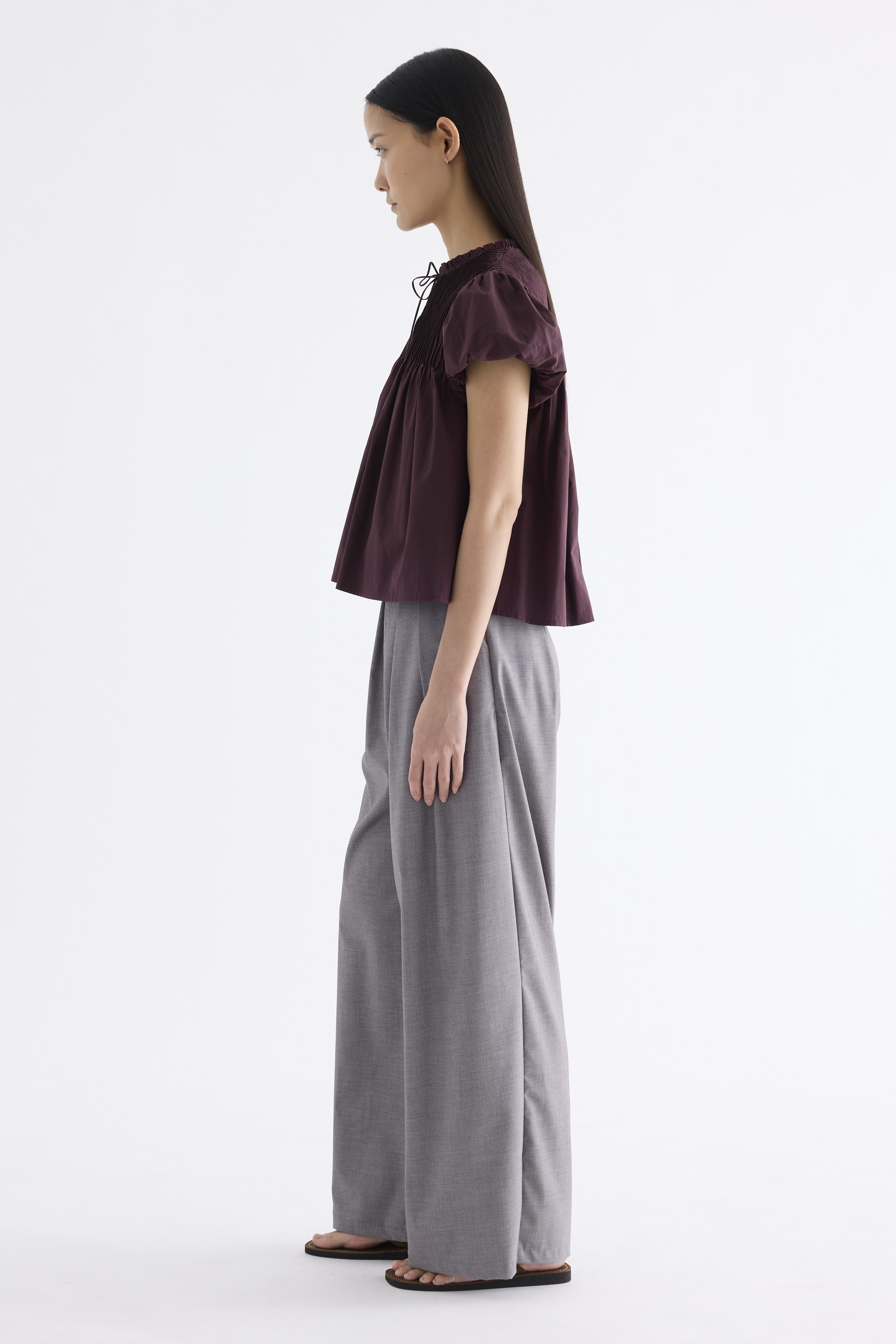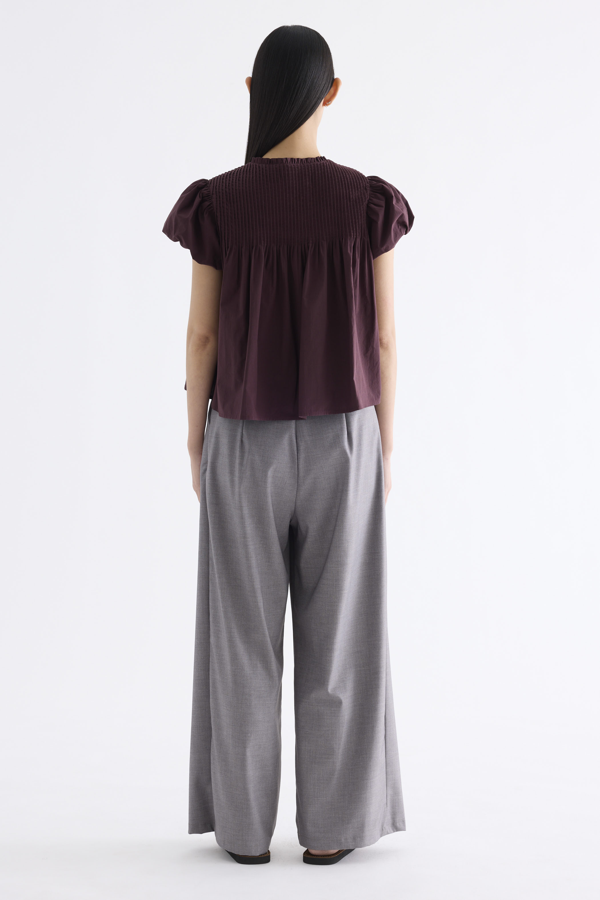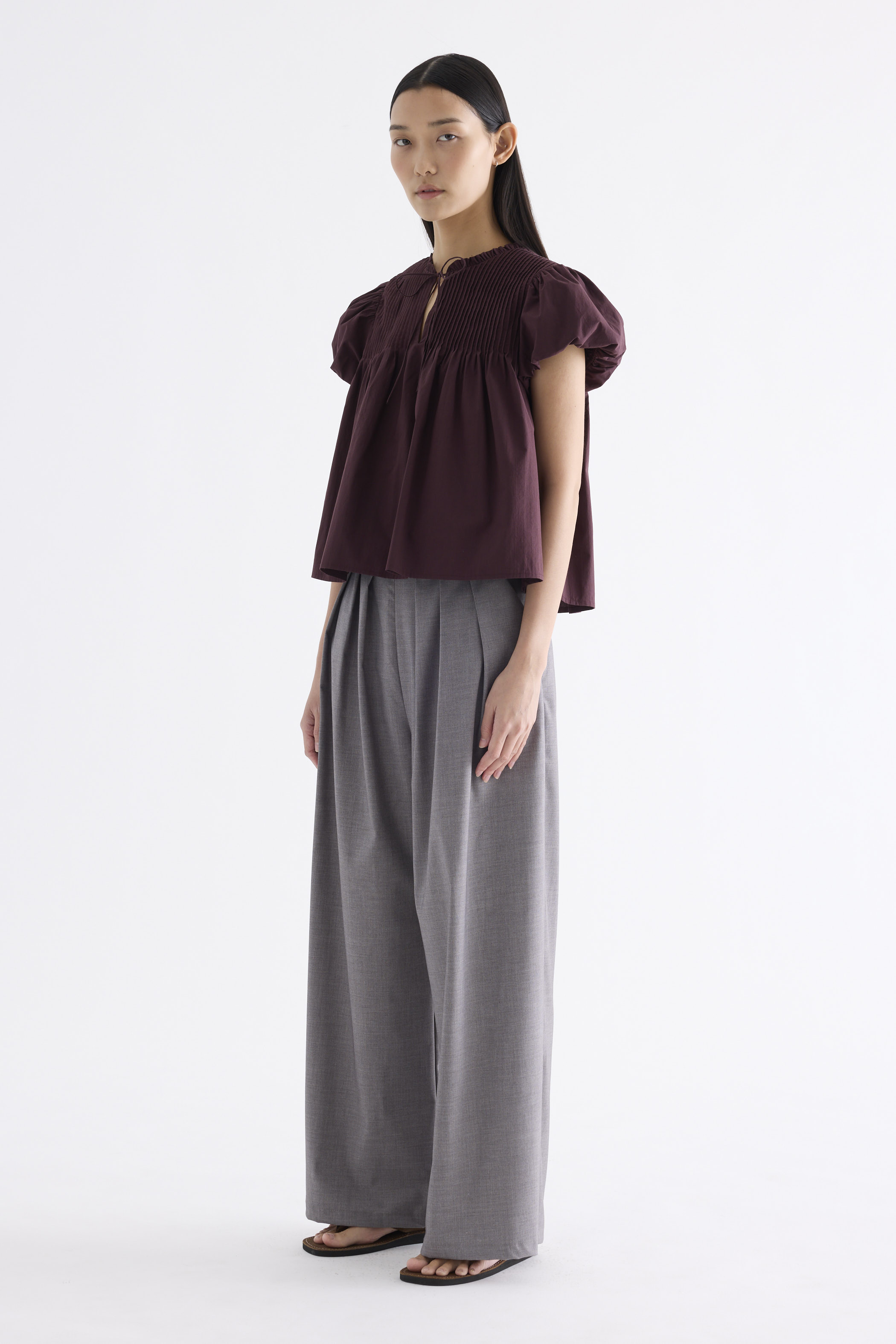 Here for the flare. Cut from crisp and softly structured cotton, this top features a frill-trimmed neckline, front opening with tie-strap, pin-tuck pleats and elasticated puffy sleeves. Worn in a relaxed swing silhouette.