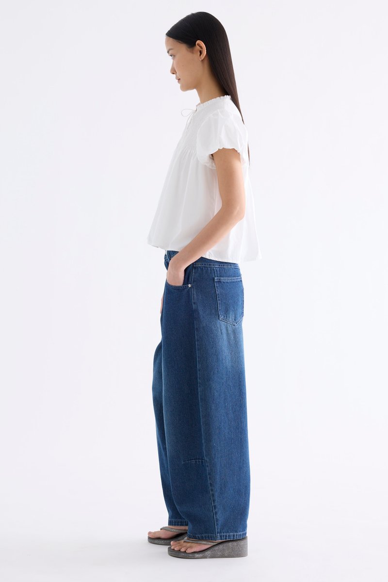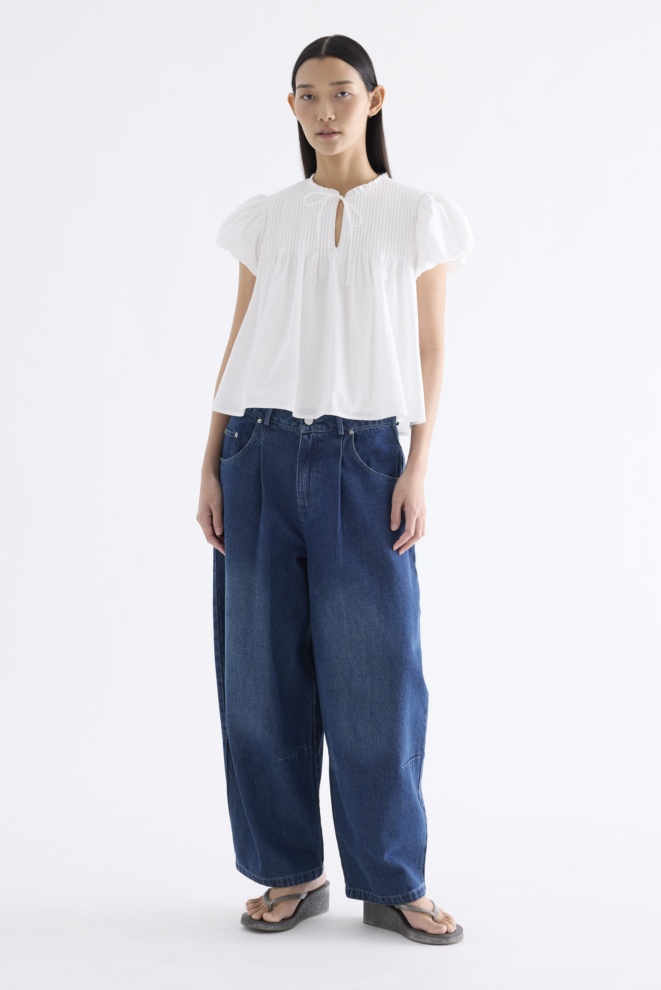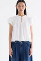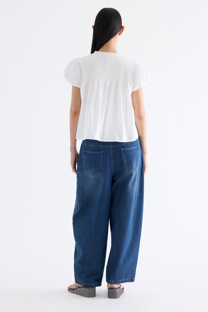 Here for the flare. Cut from crisp and softly structured cotton, this top features a frill-trimmed neckline, front opening with tie-strap, pin-tuck pleats and elasticated puffy sleeves. Worn in a relaxed swing silhouette.