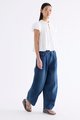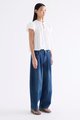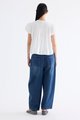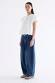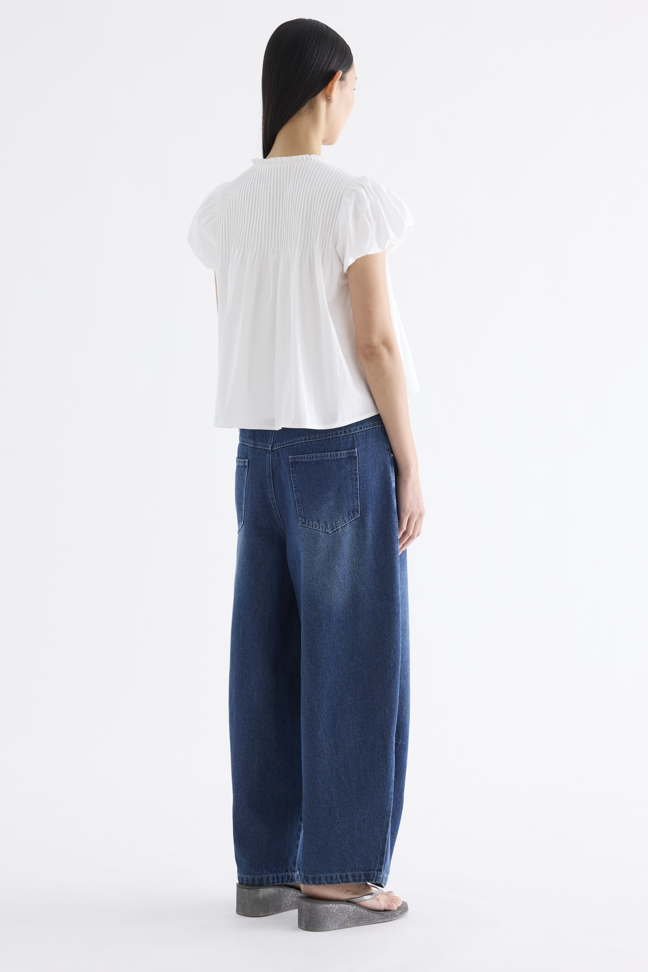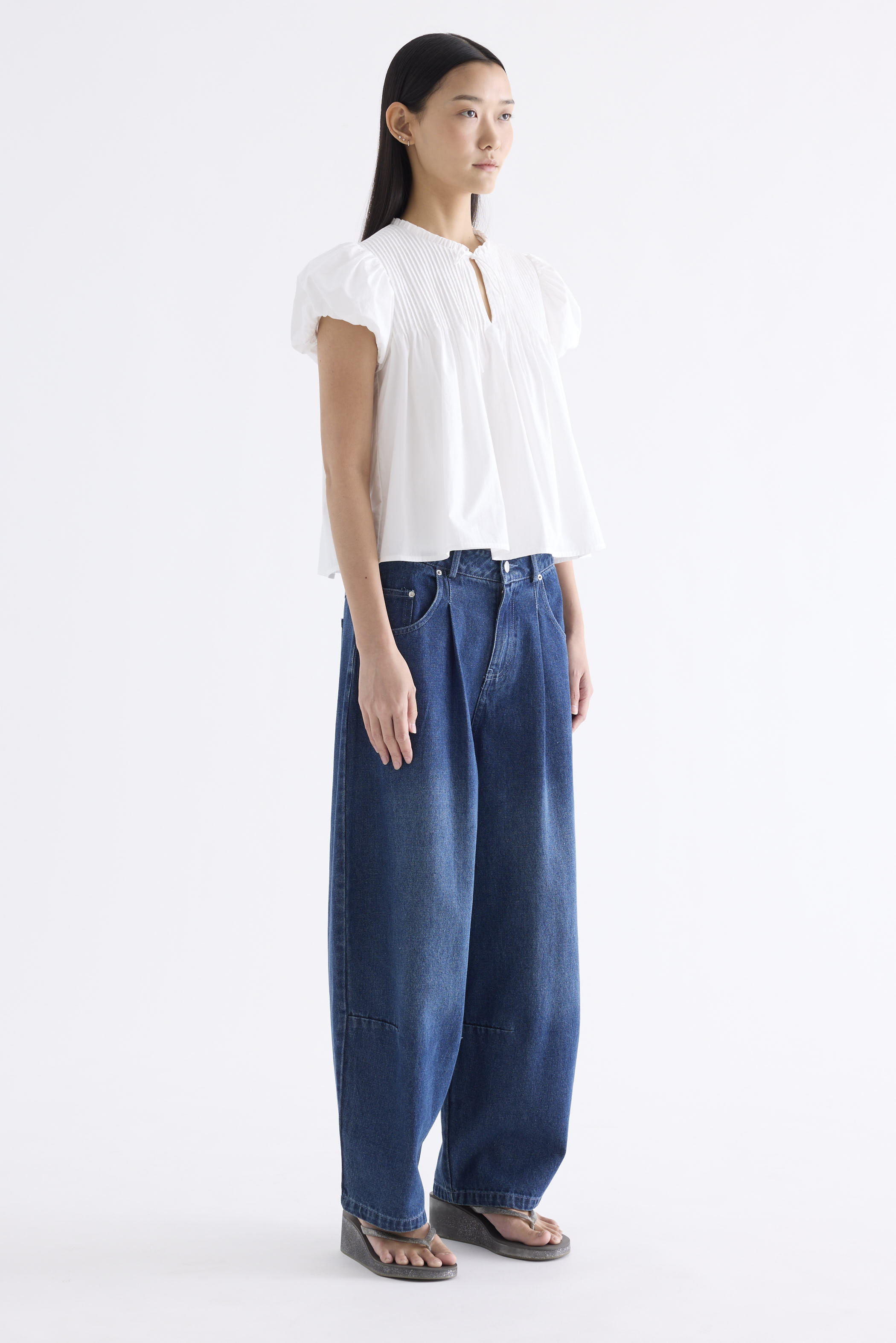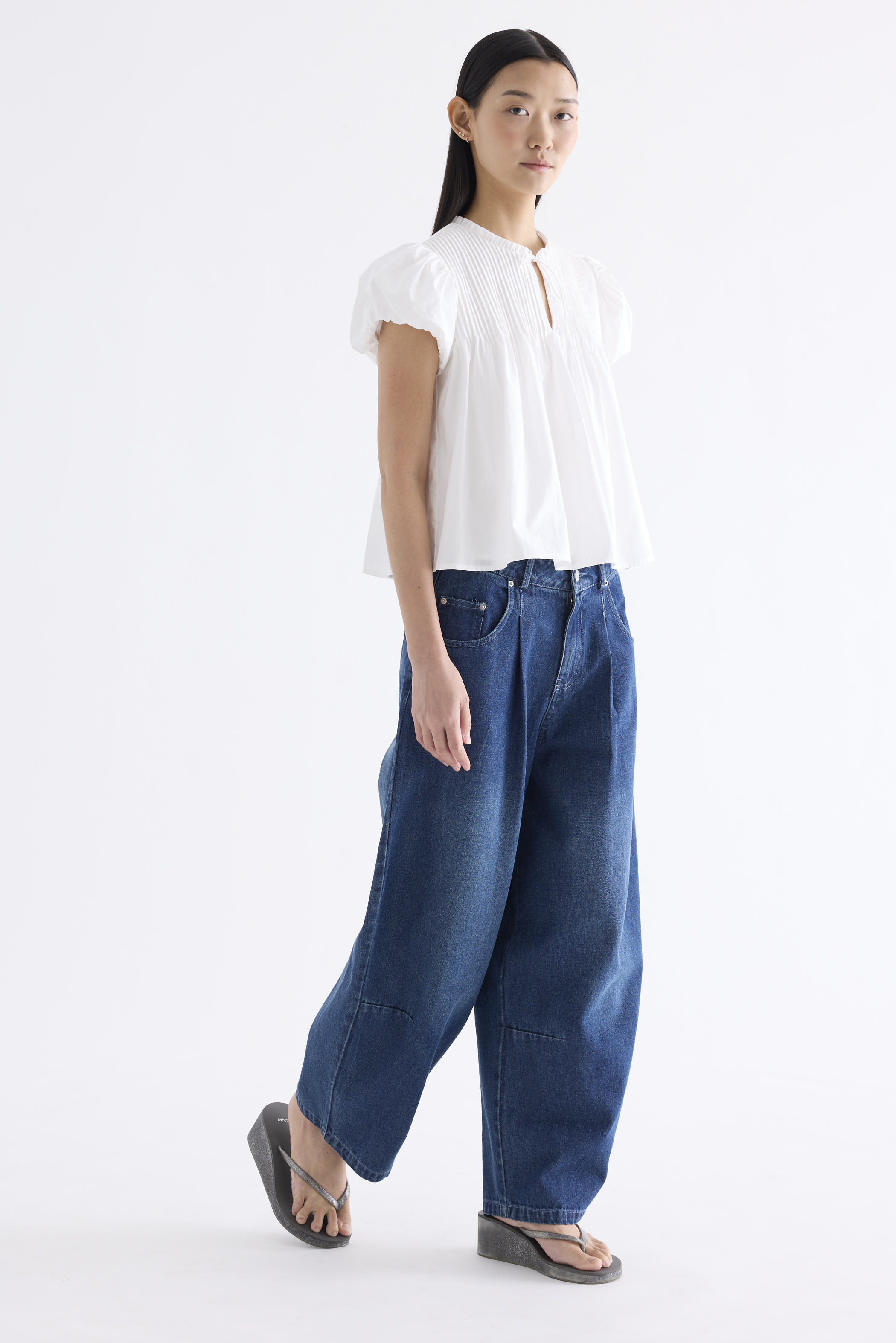 Here for the flare. Cut from crisp and softly structured cotton, this top features a frill-trimmed neckline, front opening with tie-strap, pin-tuck pleats and elasticated puffy sleeves. Worn in a relaxed swing silhouette.