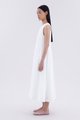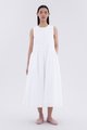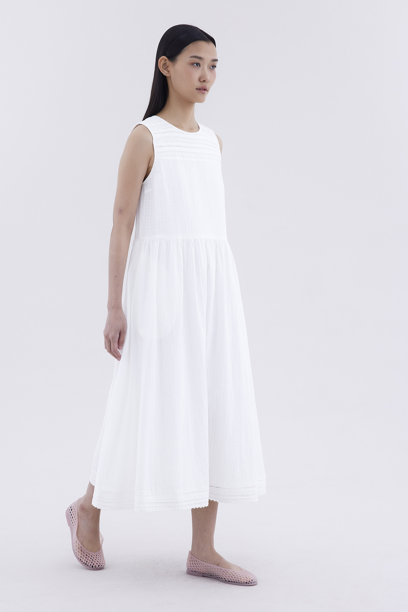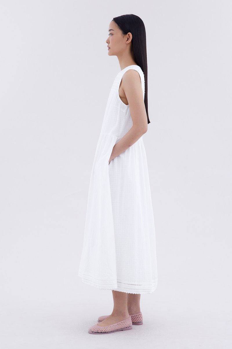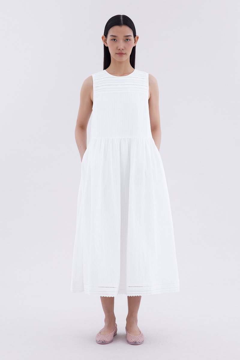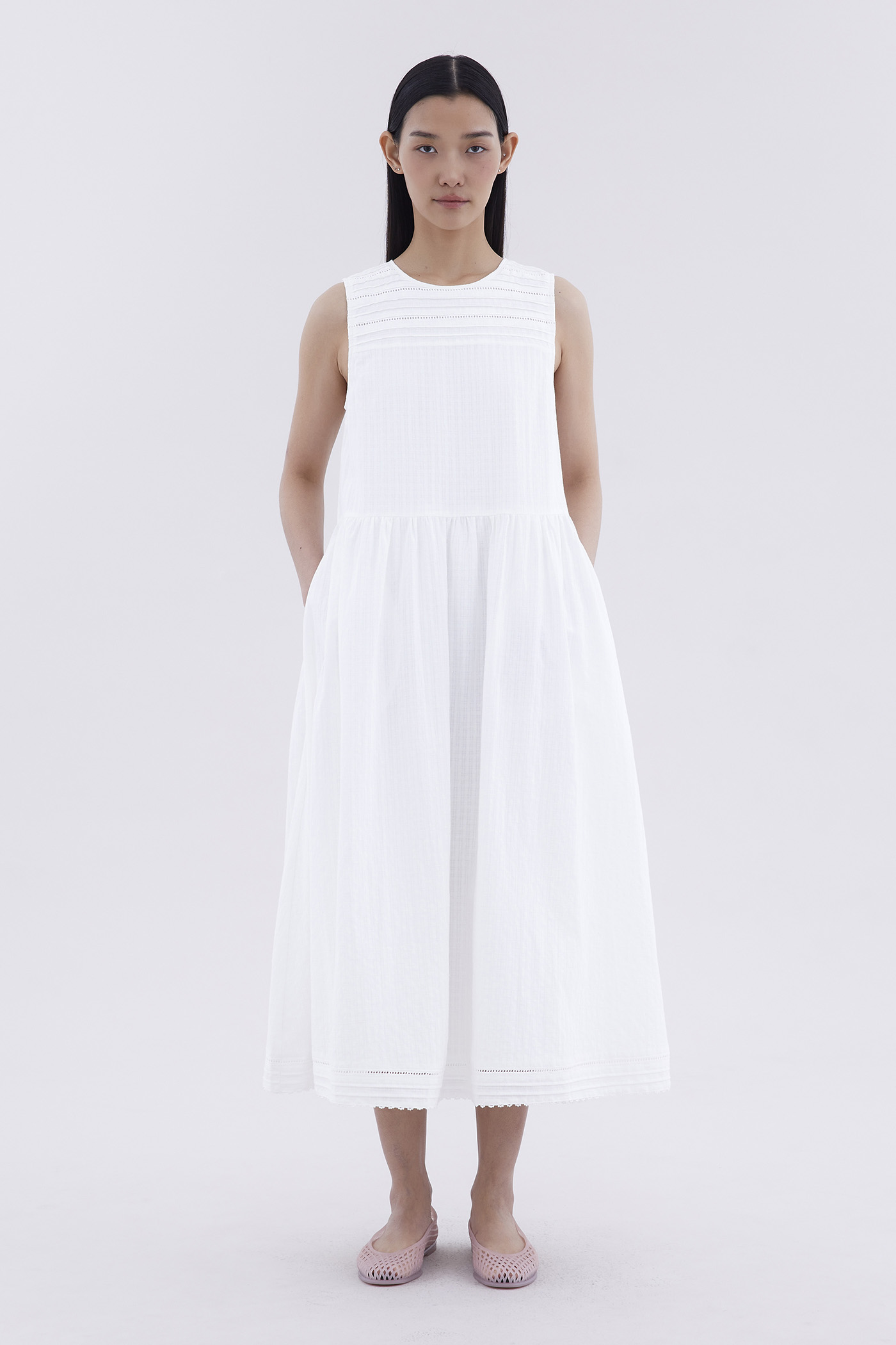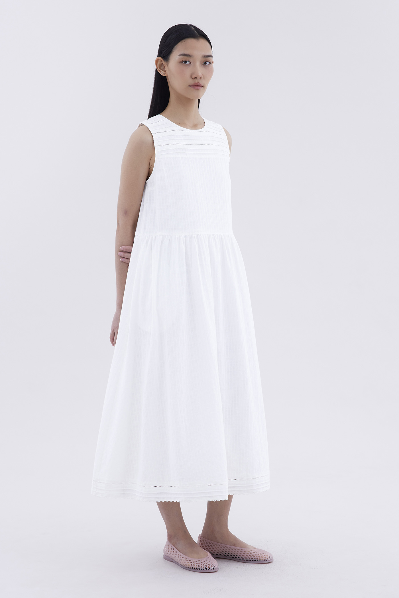 Light textures. Cut from airy and softly structured seersucker cotton, this sleeveless maxi dress features a round neckline, pin-tuck pleats, ladder lace and a back zip closure. Worn in a relaxed fit.