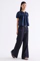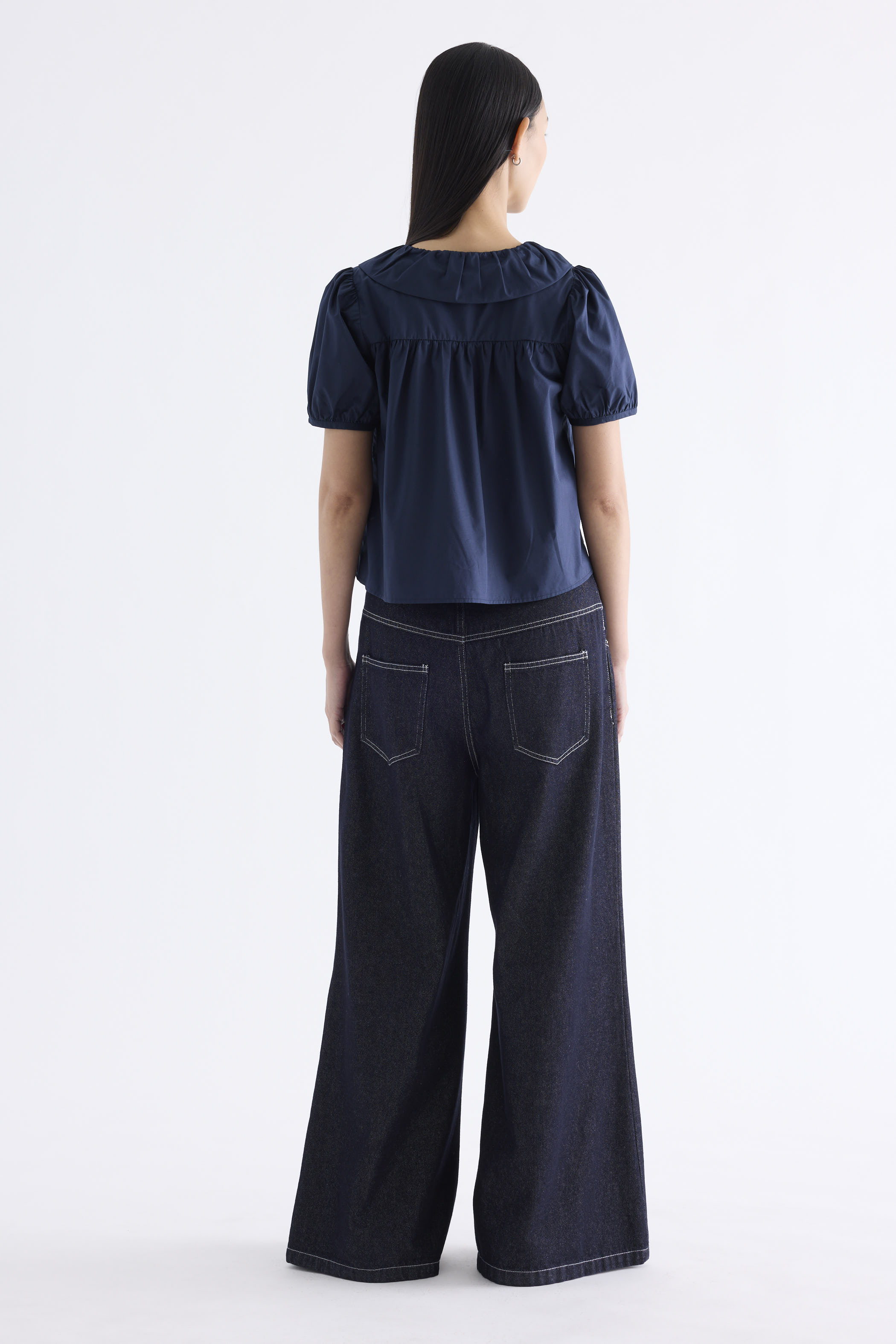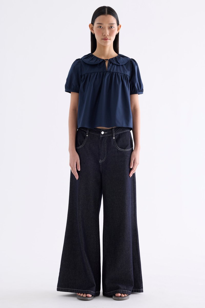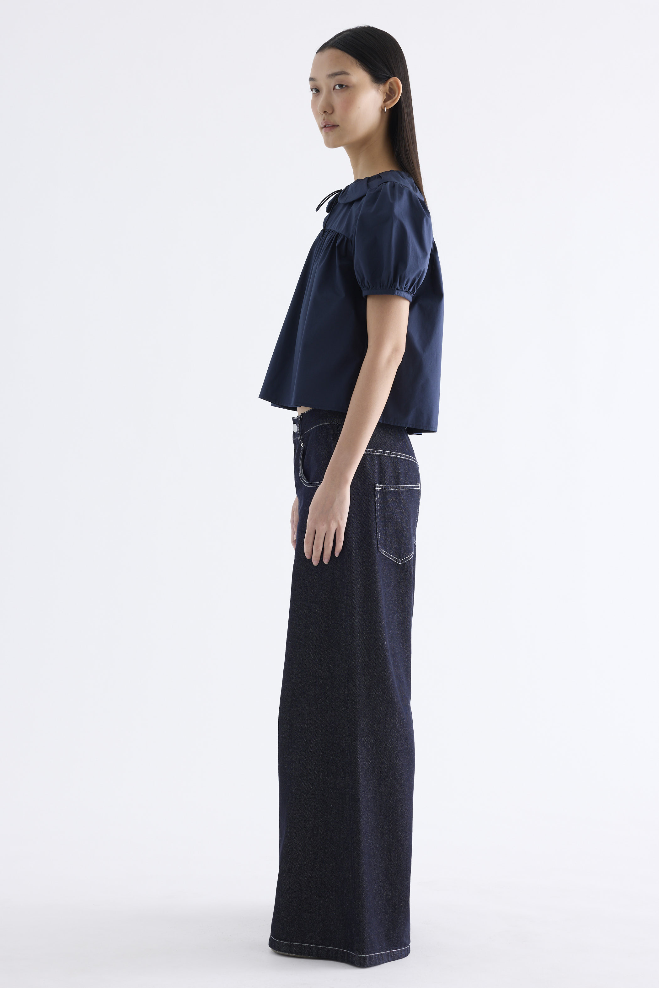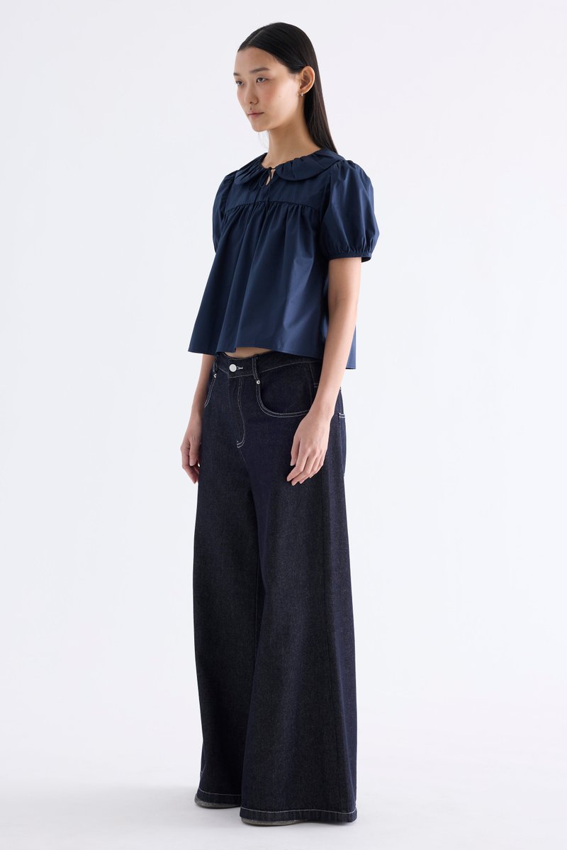 Playful touches. Cut from crisp and softly structured cotton, this blouse features gathered Peter Pan collars, short puffy sleeves and a front keyhole opening with a tie-strap. Fits flared and relaxed.