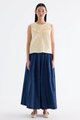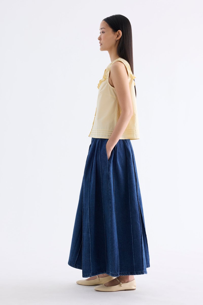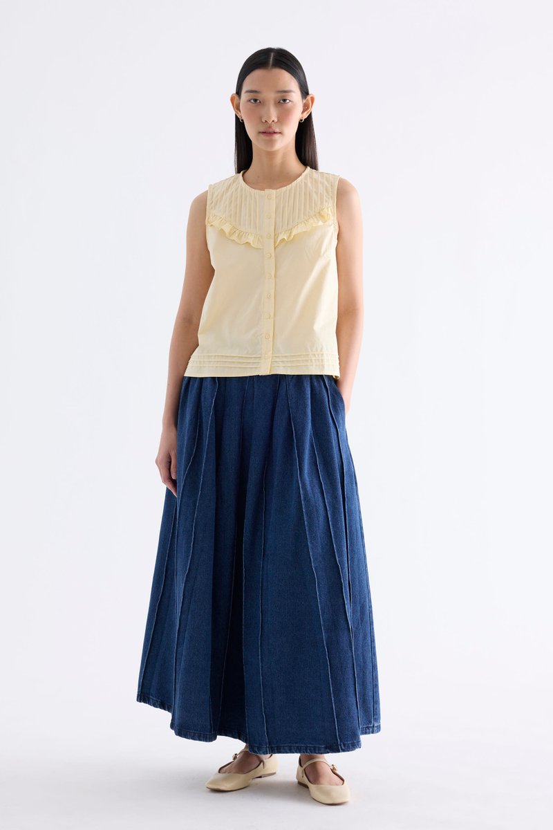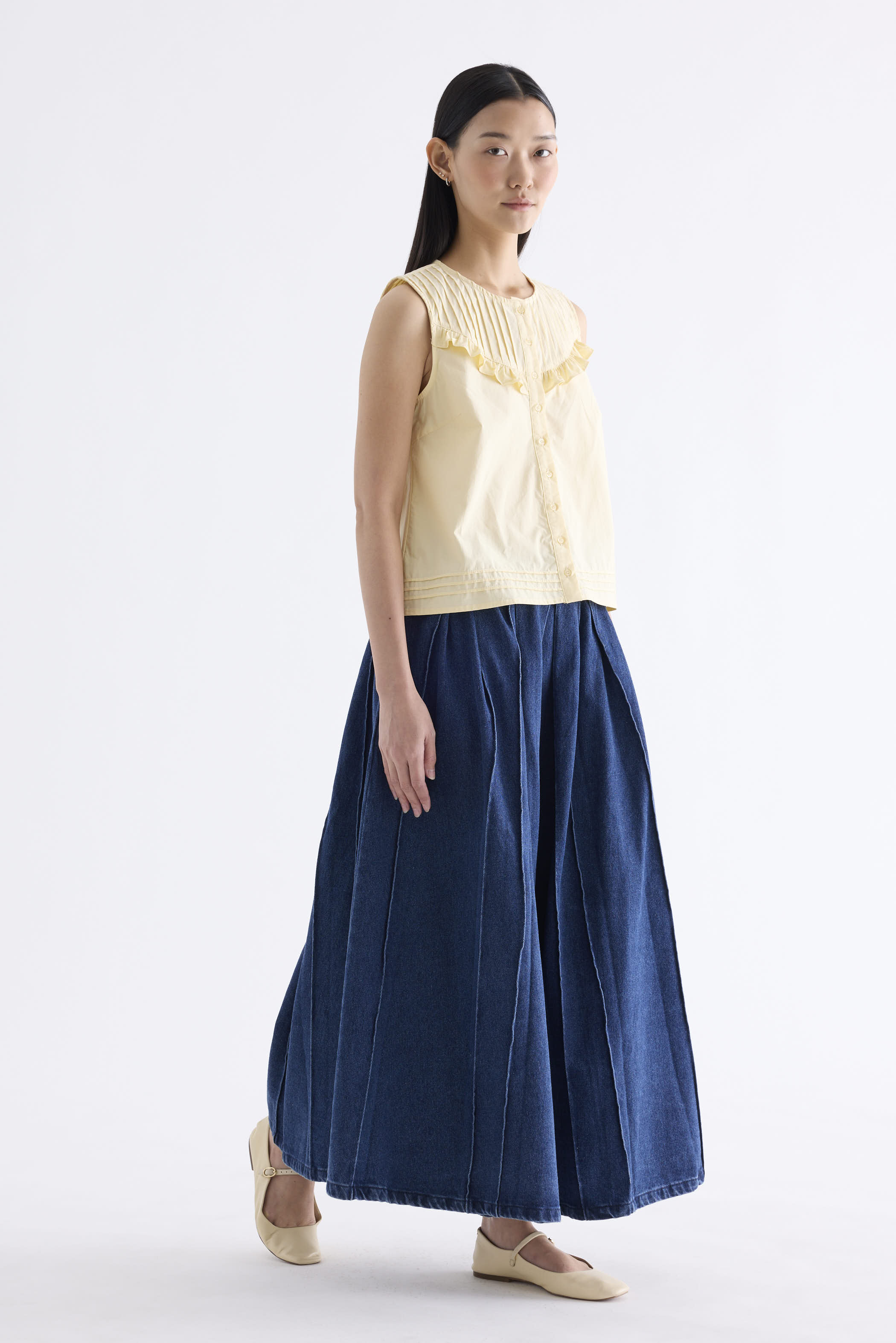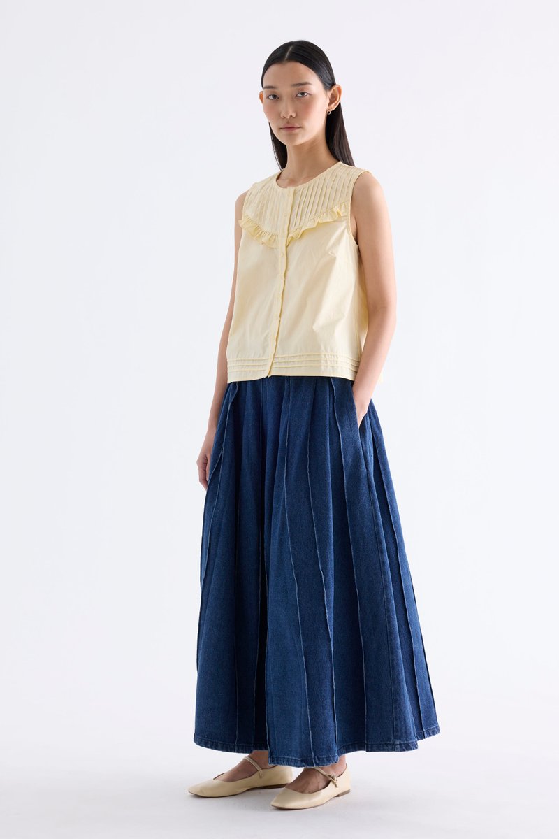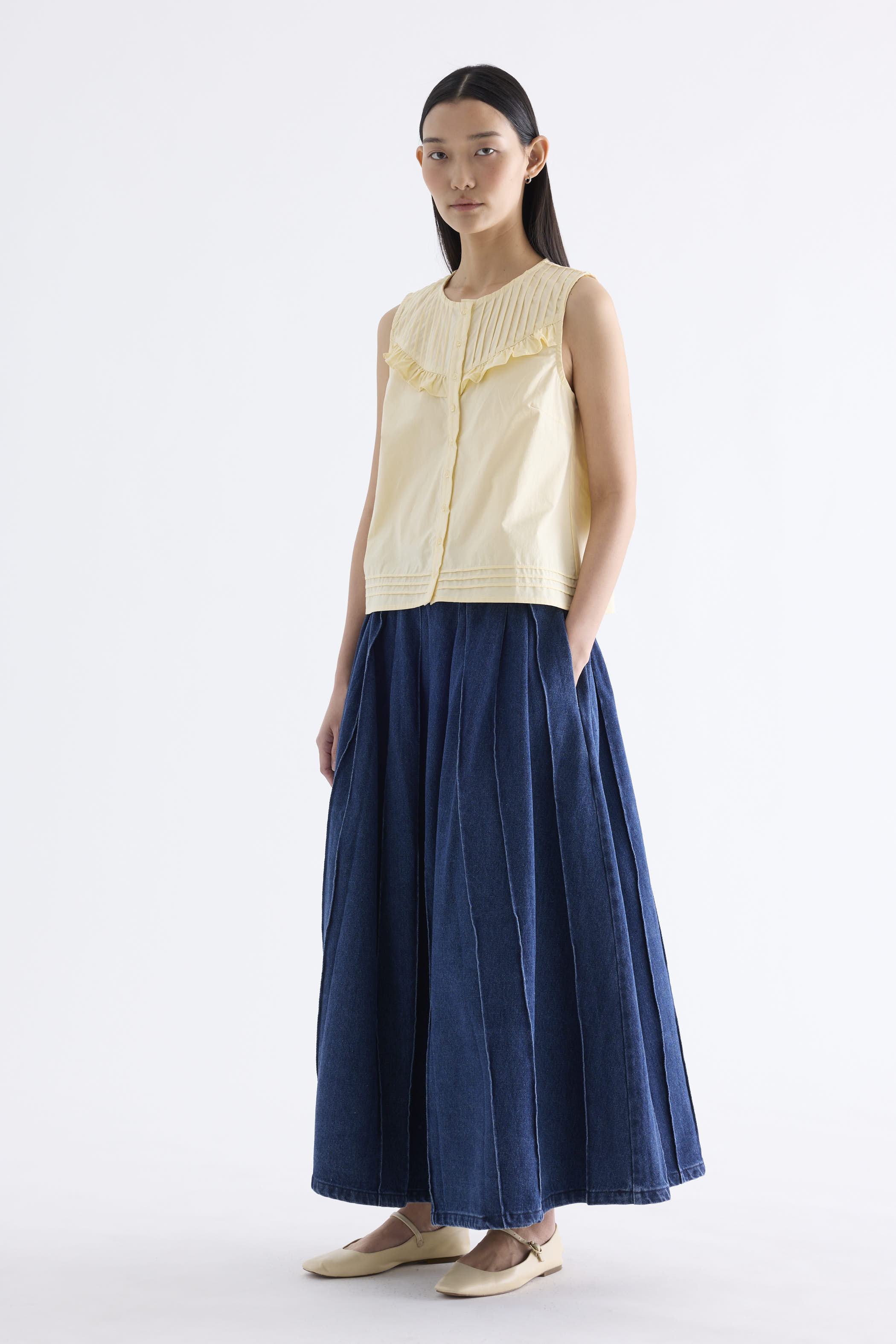 Tailored and textured. Cut from crisp and softly structured cotton, this sleeveless top features a pleated, frill-trimmed yoke, round neckline, button-down front and pleated hem. Worn in a relaxed, boxy fit.