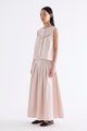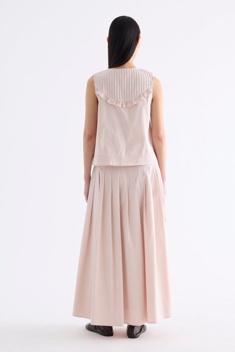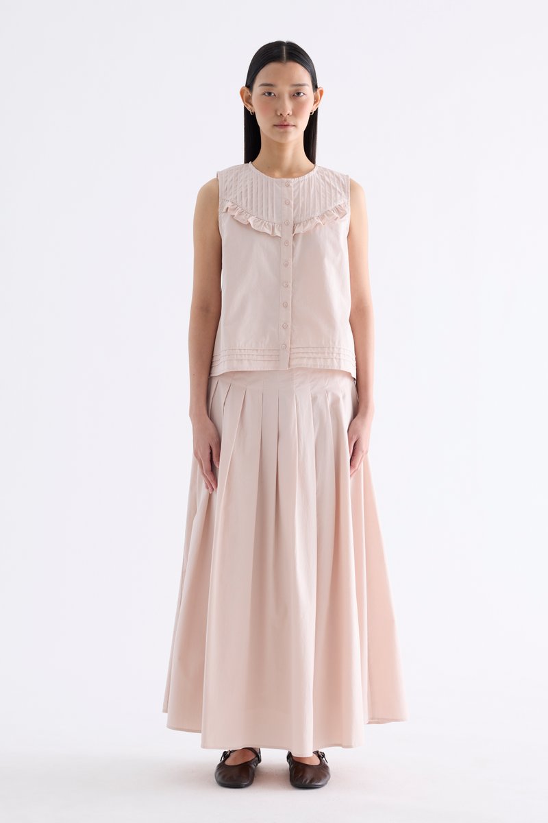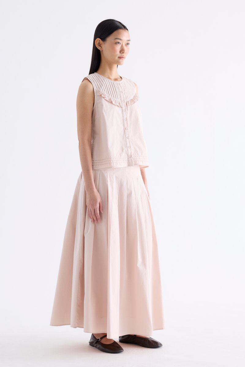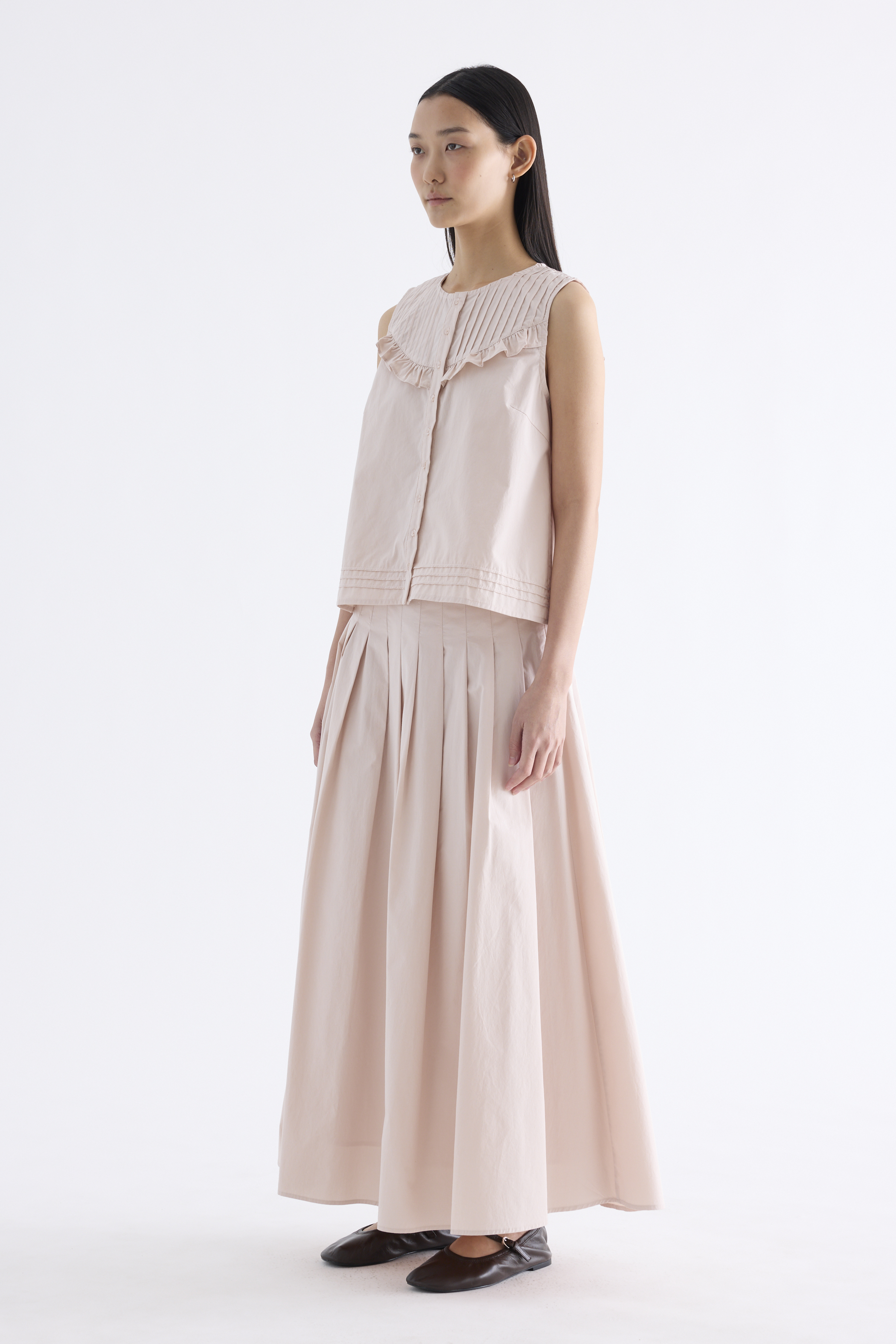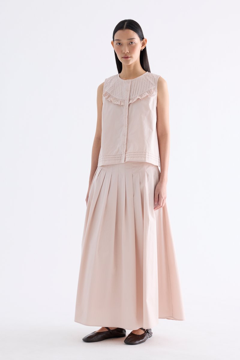 Tailored and textured. Cut from crisp and softly structured cotton, this sleeveless top features a pleated, frill-trimmed yoke, round neckline, button-down front and pleated hem. Worn in a relaxed, boxy fit.